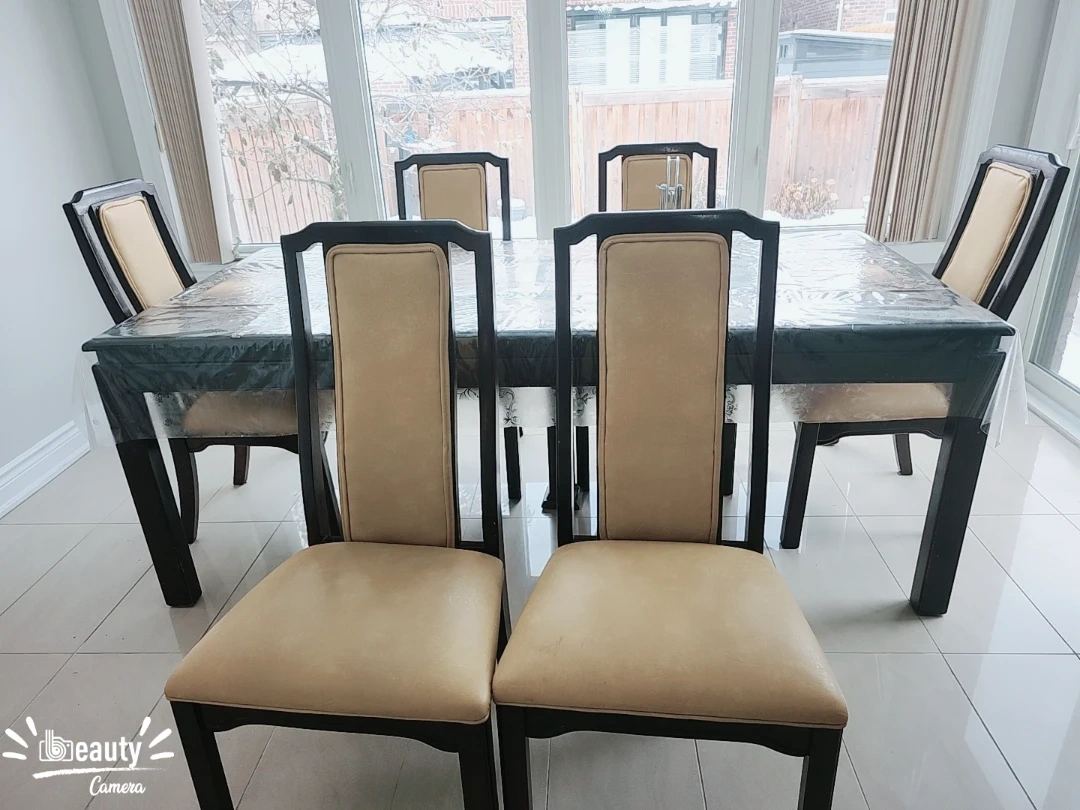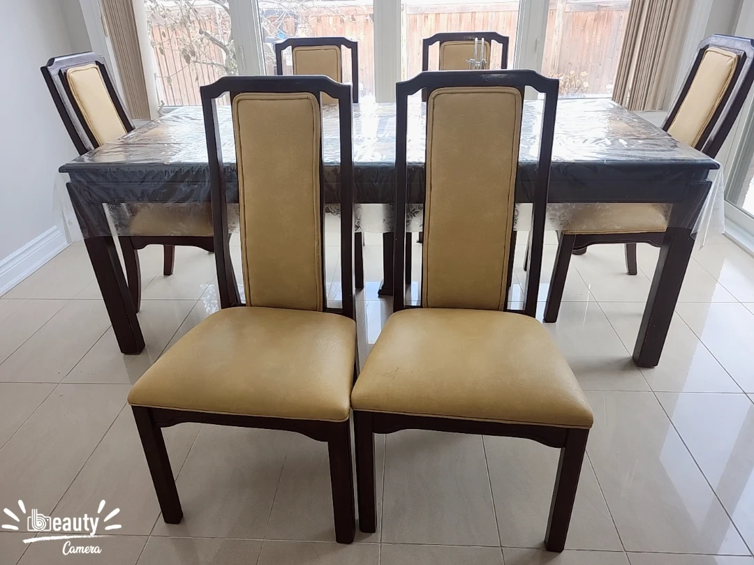 Selling 8 dining chairs in perfect condition. The set features a dark wood frame with beige upholstery on the chairs.