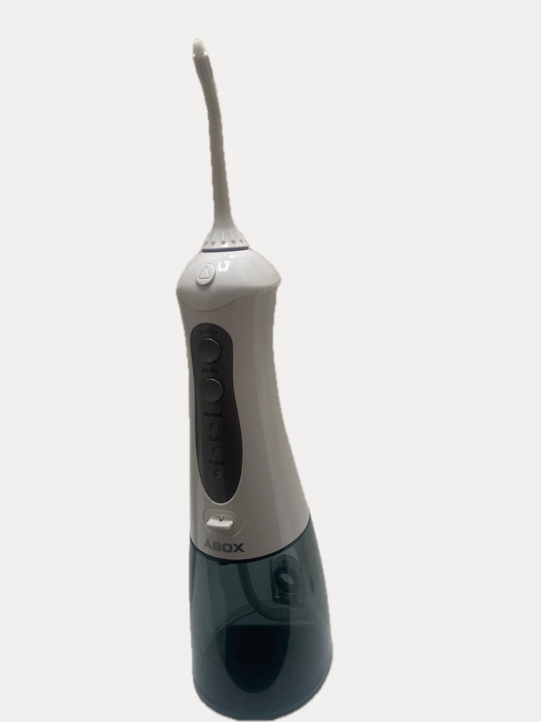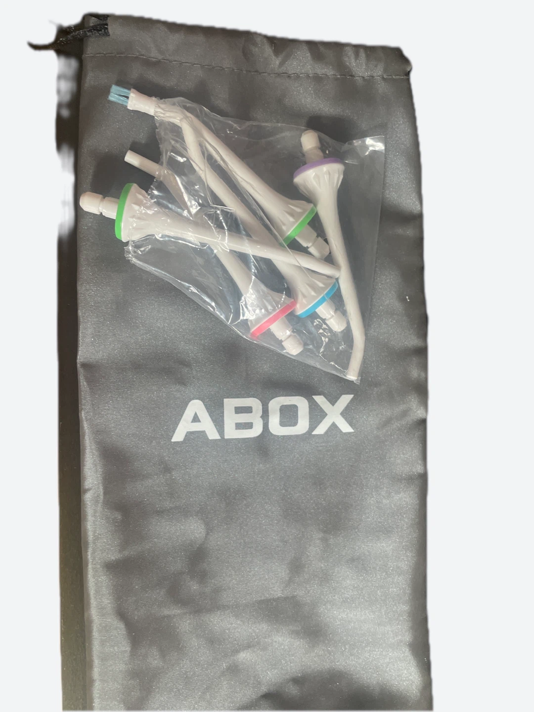 Selling an ABOX water flosser. It comes with multiple unused tips and a storage bag for easy organization. Great for maintaining oral hygiene!