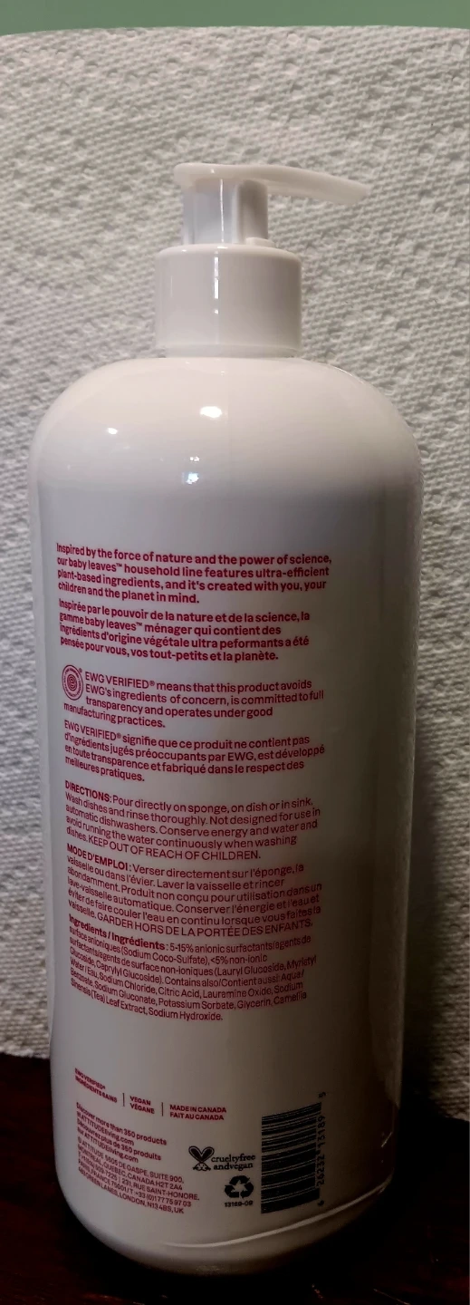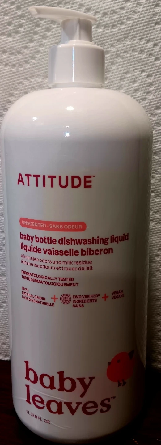 Selling a bottle of Attitude baby bottle dishwashing liquid. It's unscented and eliminates odors and milk residue. The formula is dermatologically tested and made with 99.9% natural origin ingredients. It's also vegan and EWG verified for safety! Contains 1L / 33.8 fl oz
