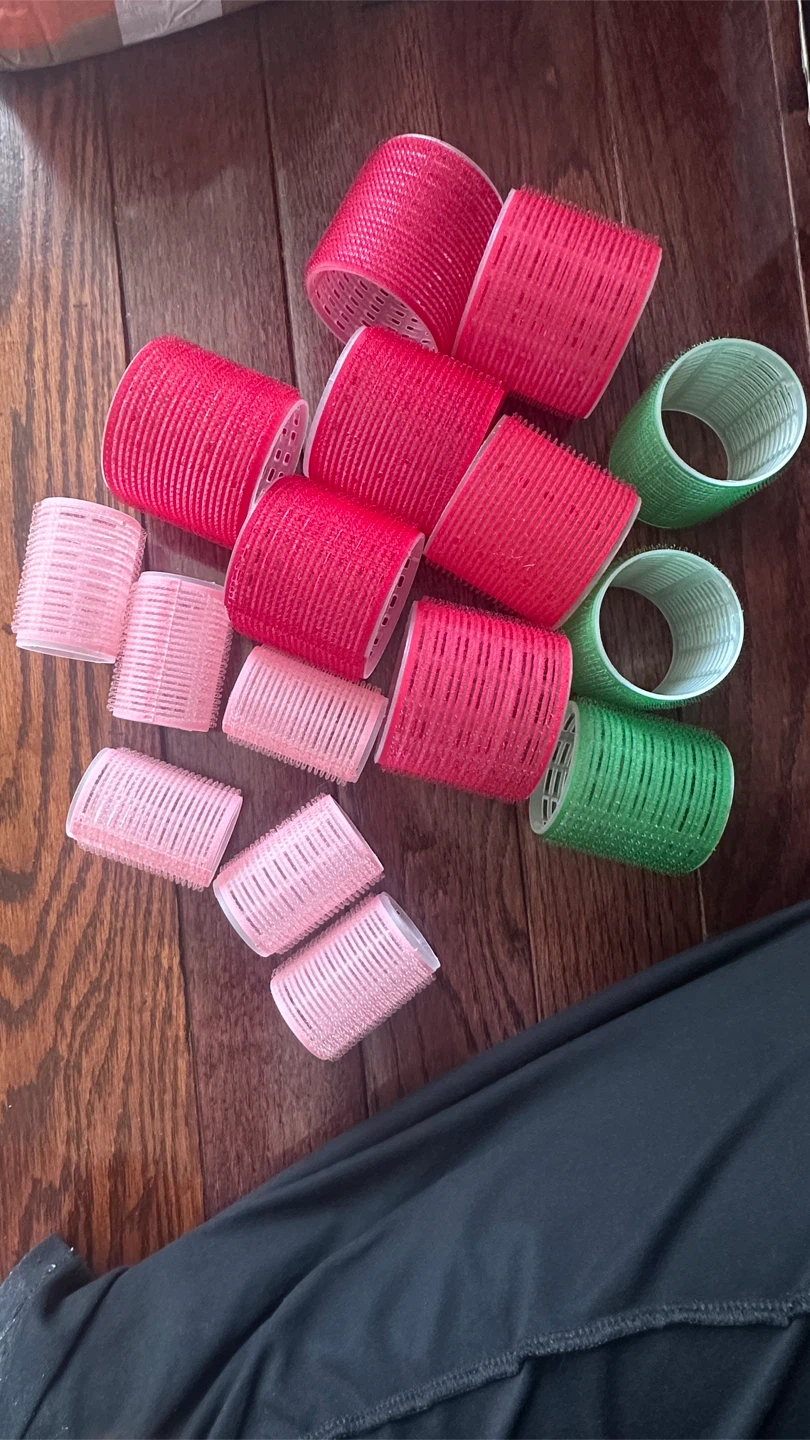 Selling a set of hair rollers in pink, red, and green colours! They are in great condition and ready to use for creating beautiful curls and waves
