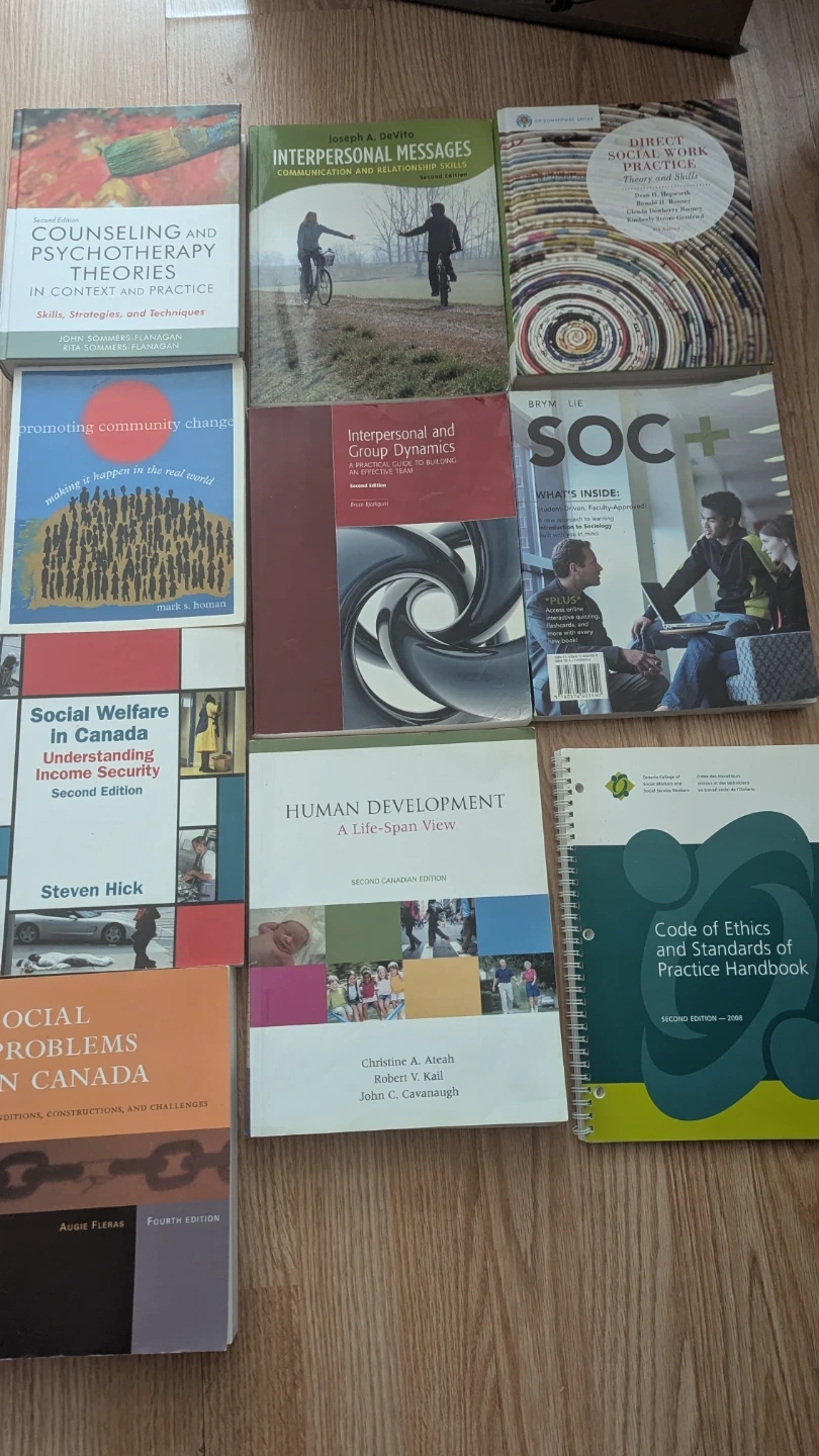 Selling a collection of textbooks related to social work, counseling, and human development. Titles include: - Counseling and Psychotherapy Theories - Interpersonal Messages - Direct Social Work Practice - Promoting Community Change - Interpersonal and Group Dynamics - SOC+ - Social Welfare in Canada - Human Development: A Life-Span View - Code of Ethics and Standards of Practice Handbook - Social Problems in Canada