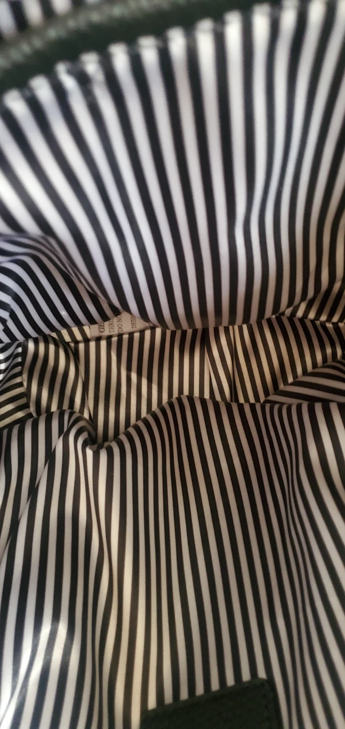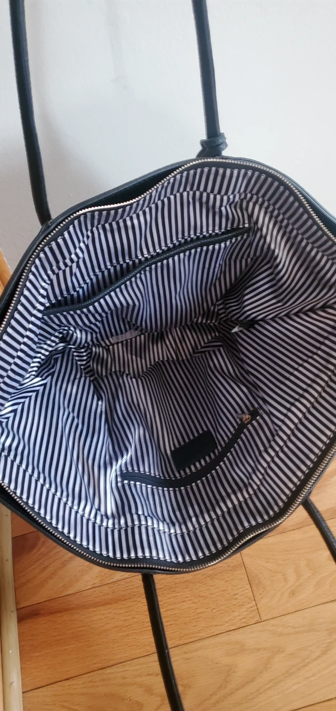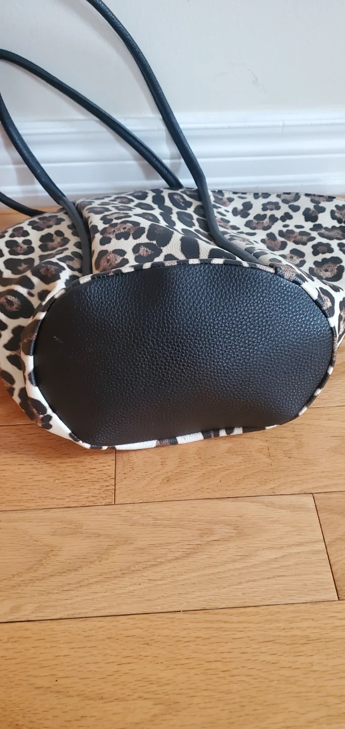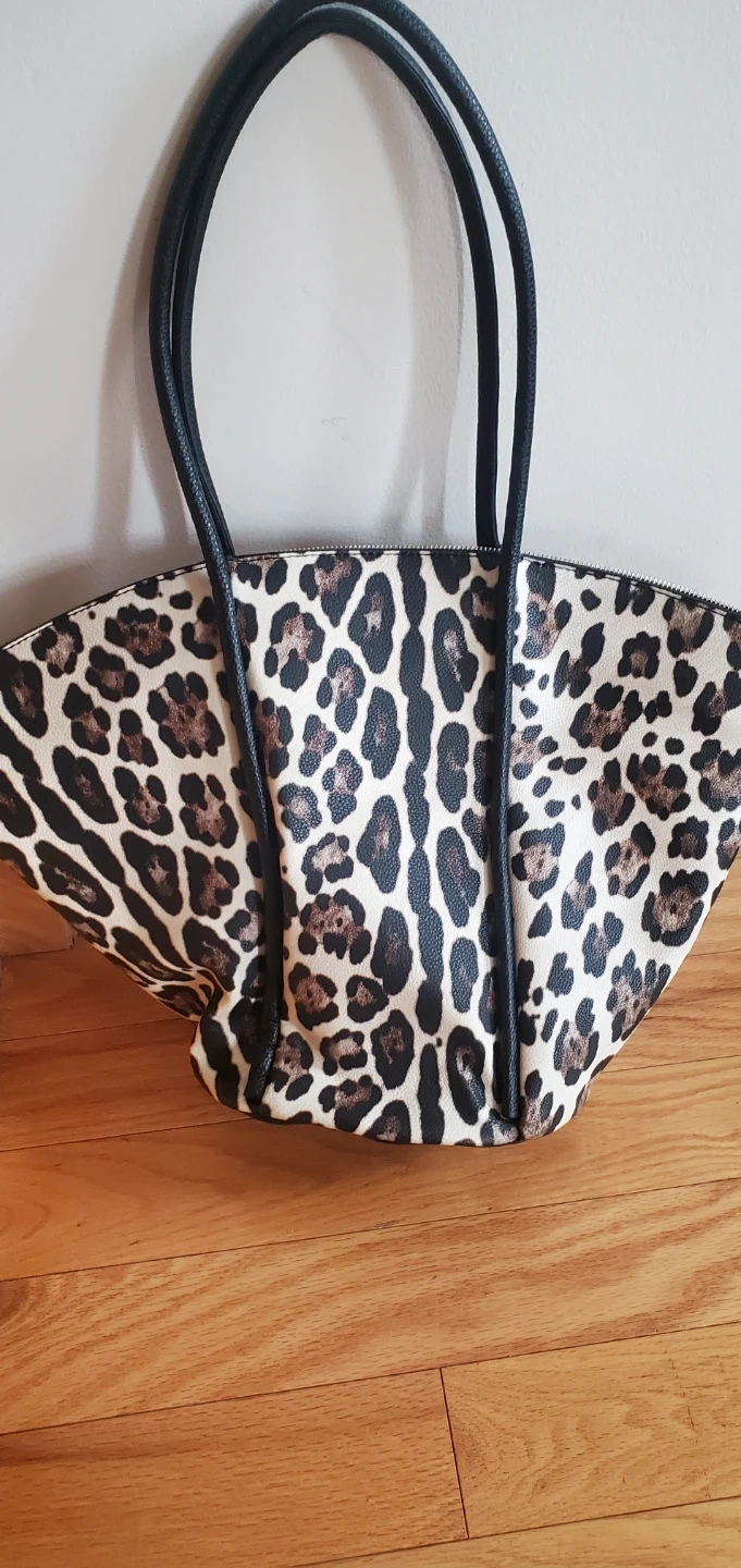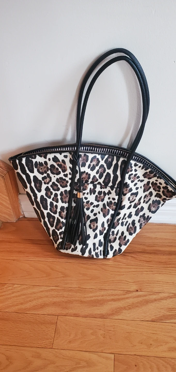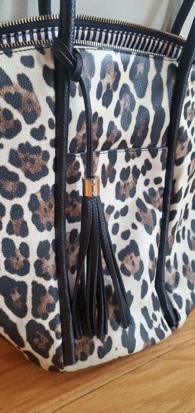 Here's a stylish tote bag with a fun leopard print! It has black handles and a black tassel detail. The inside is lined with a black and white striped fabric and includes some pockets for organization. Perfect for carrying your everyday essentials!