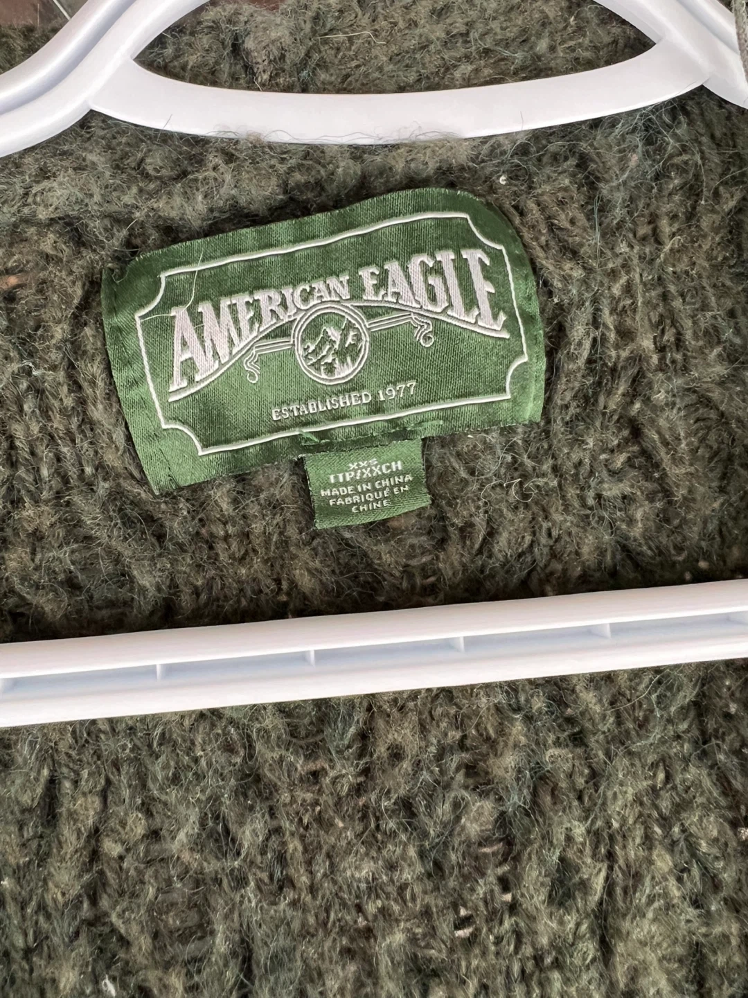 American Eagle cardigan in a lovely olive green colour. It's a size TTP/XXCH. Runs a bit oversized - Fit for anyone who normal wears a S or M. Perfect for layering or wearing on its own!