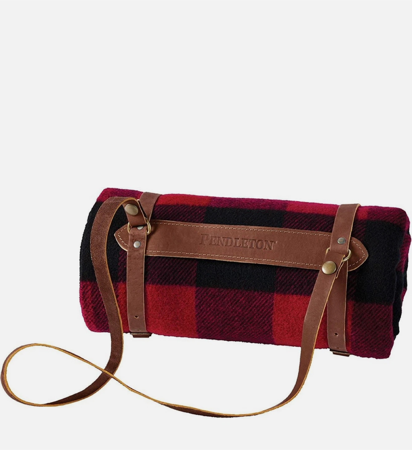 Authentic Pendleton wool blanket in a classic red & black buffalo check pattern, complete with the original leather carrying harness.