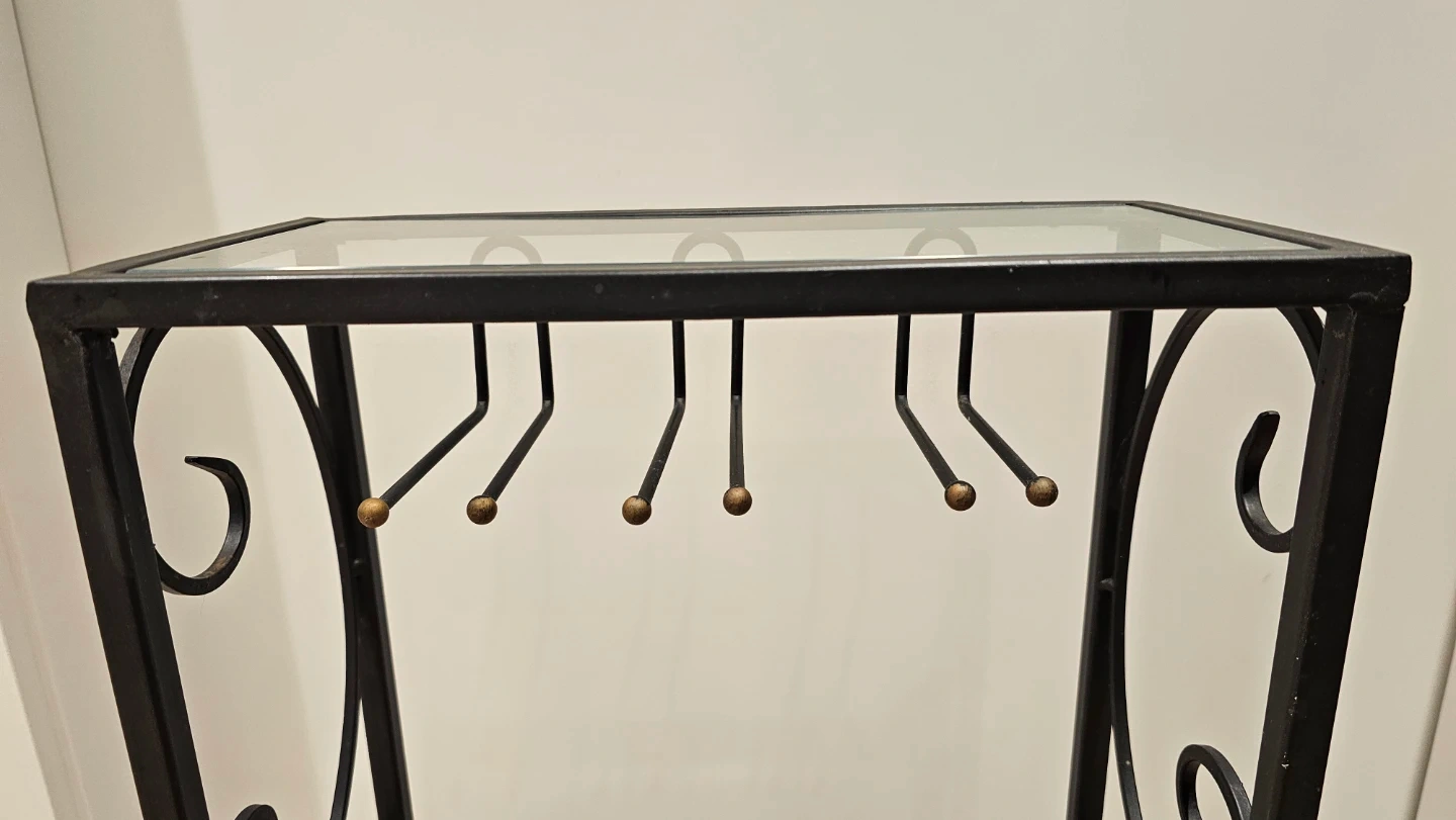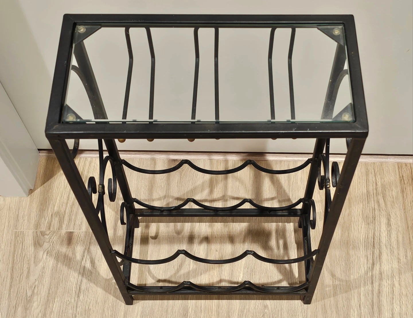 Selling a black metal wine rack with a glass top! It has a stylish, wrought iron design, and space for both wine bottles and glasses.