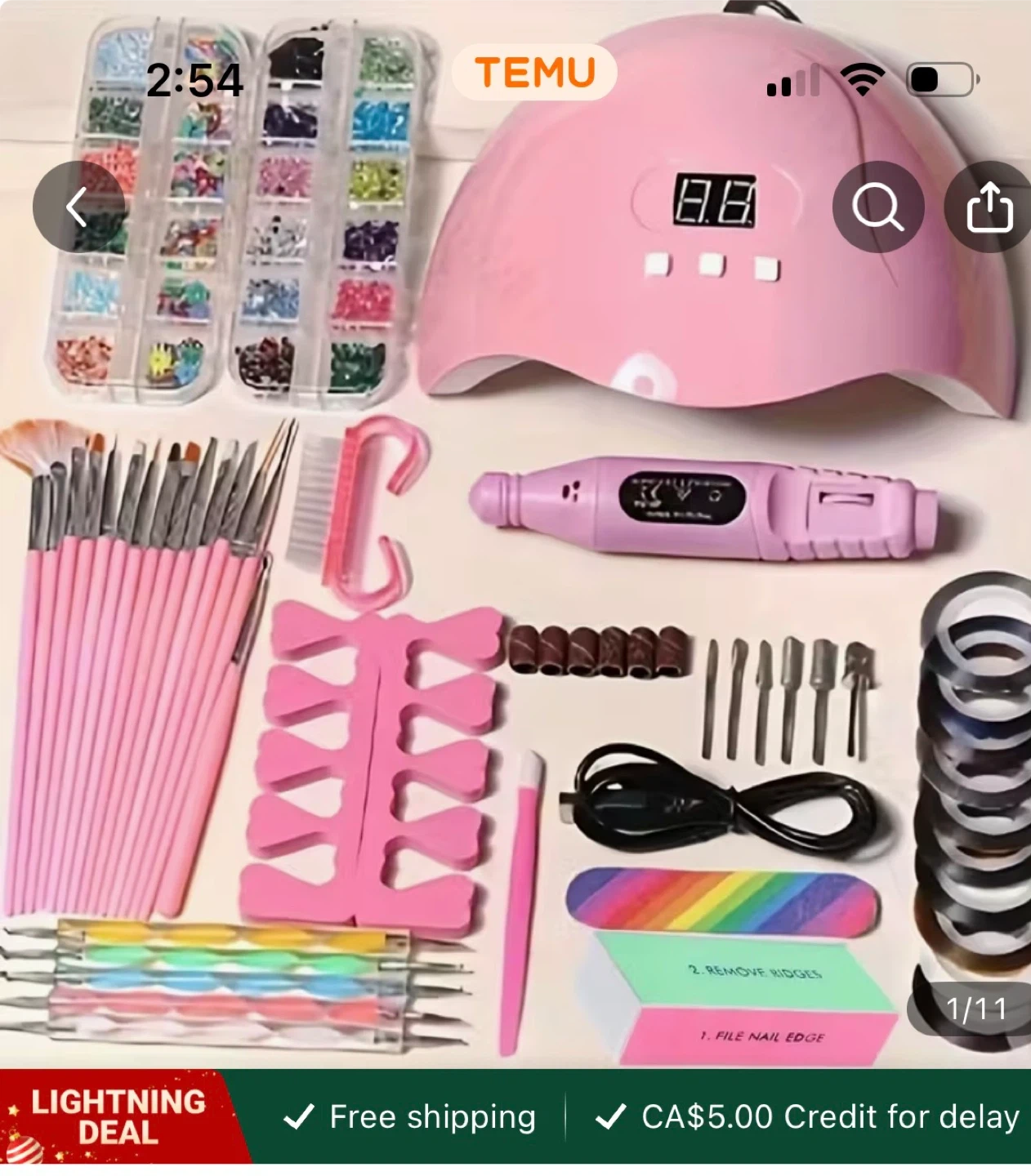 Get everything you need for beautiful nails with this complete nail art kit! It includes a UV lamp, electric nail drill, brushes, nail decorations, and more. All in a cute pink colour!