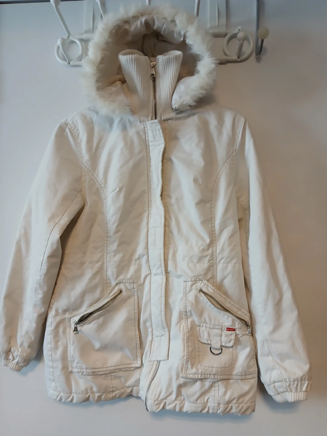 Selling a Nuweika winter jacket in size M. It's a cream/off-white colour with a fur-trimmed hood. Perfect for staying warm this winter!