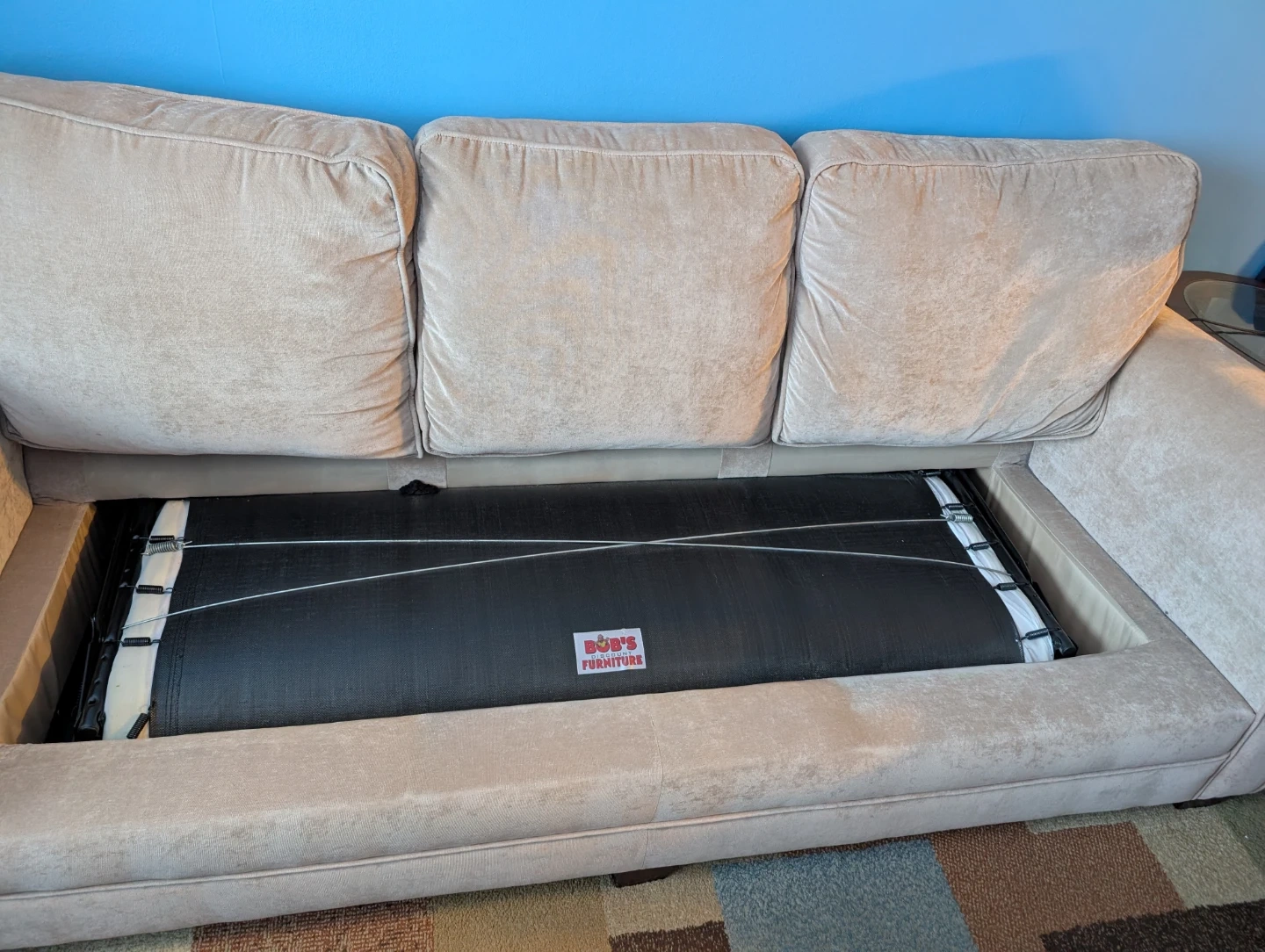 Selling a comfy 3 cushion beige sofa from Bob's Furniture. It's in good condition, never a stain or pets on it, ready for a new home! Perfect for a living room or den and pull out sofabed is full/queen size, functionally in good condition (only used pullout 2x times).