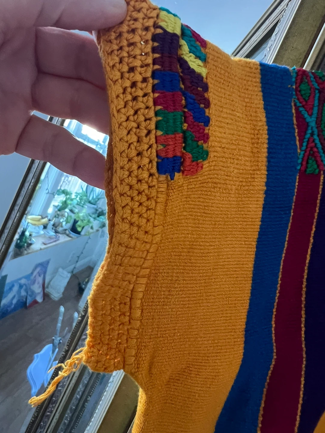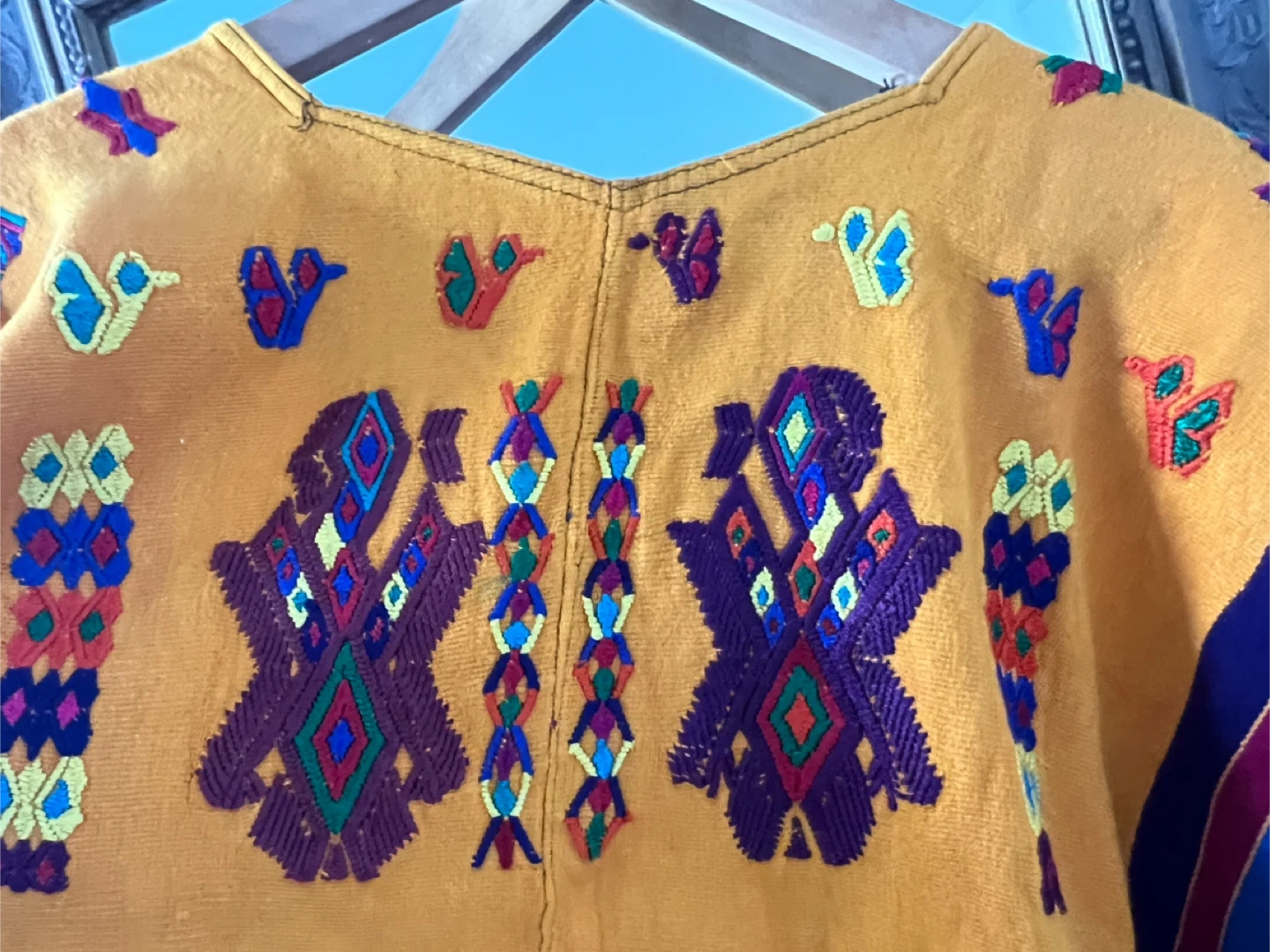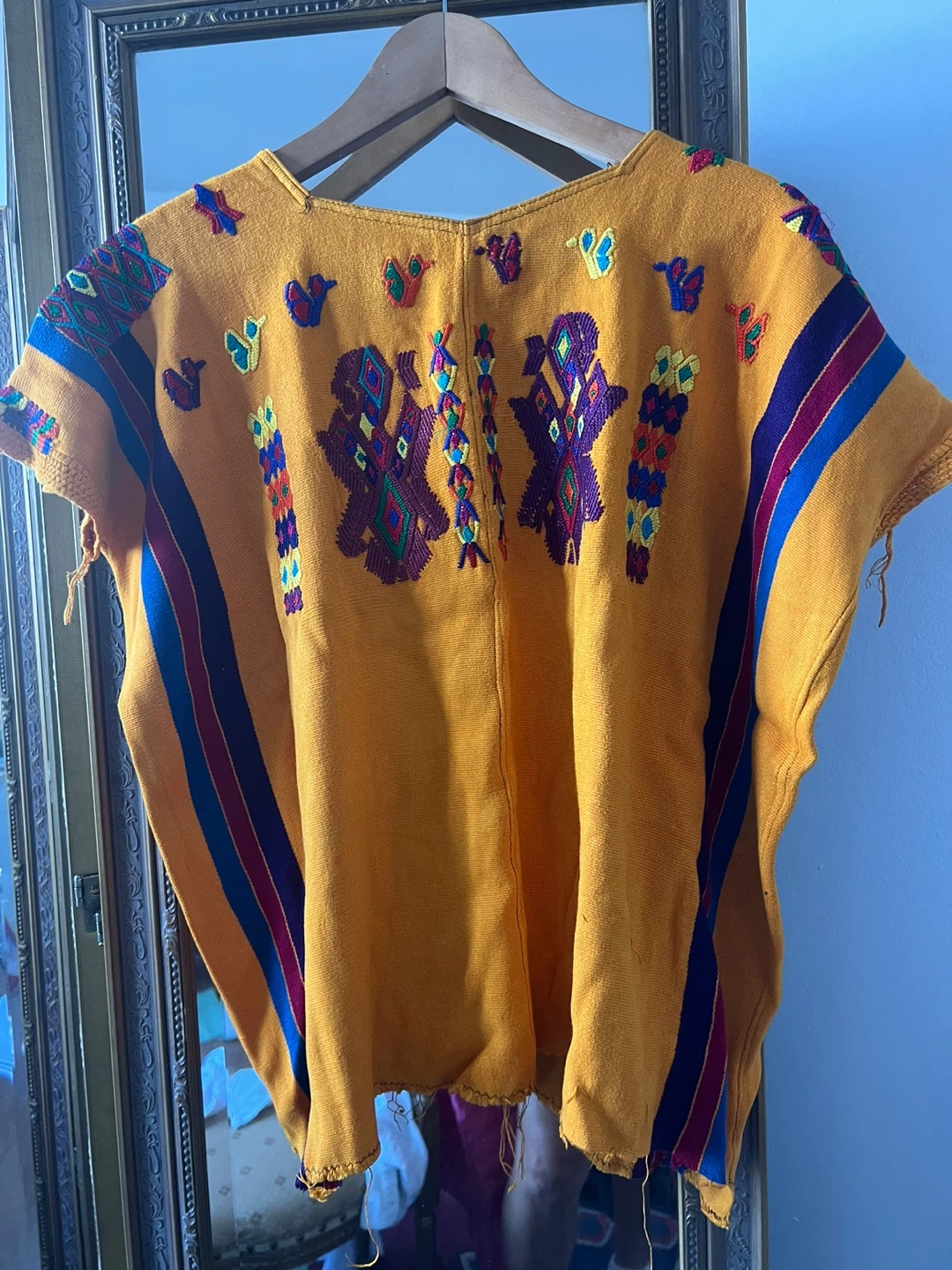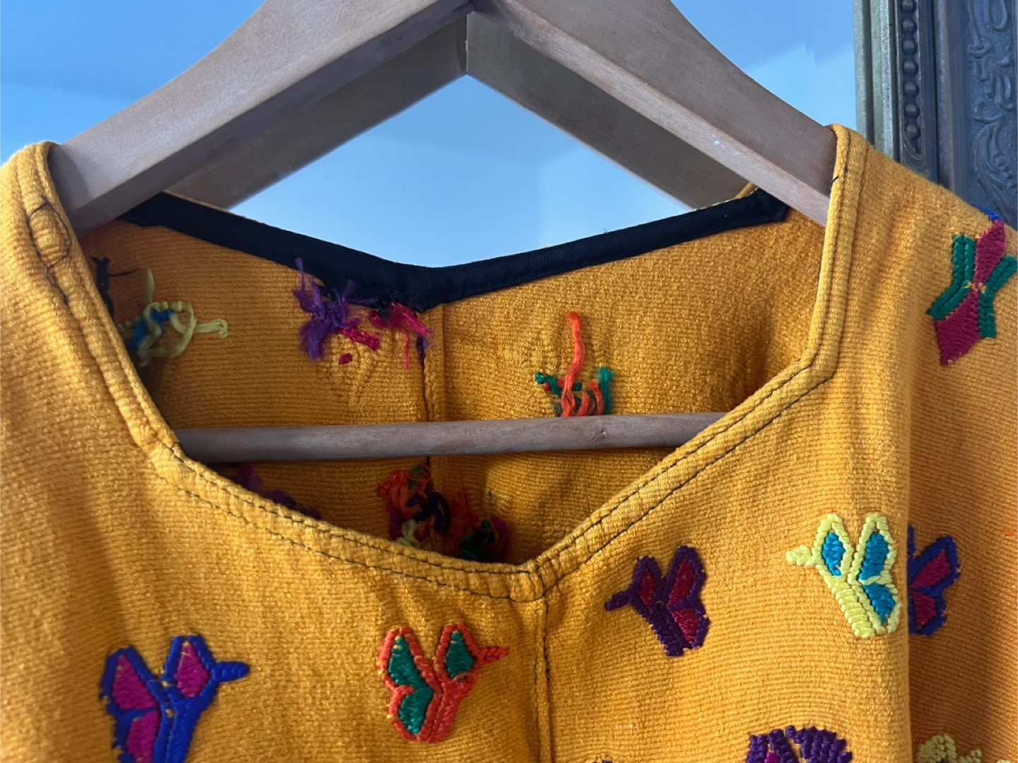 Handmade in Guatemala, One of a kind item. This is a vibrant yellow poncho with colorful embroidery. It appears to be handmade and has a unique, eye-catching design. The poncho features various embroidered details, including butterflies and geometric patterns. The material looks soft and comfortable, perfect for adding a pop of color to your wardrobe!