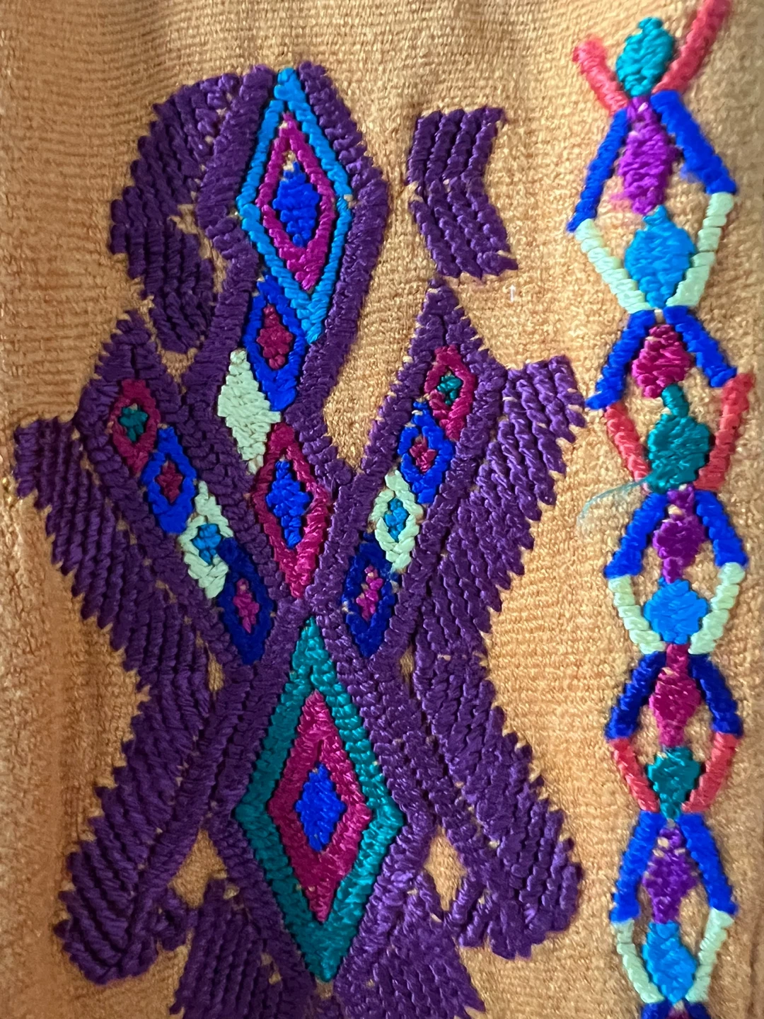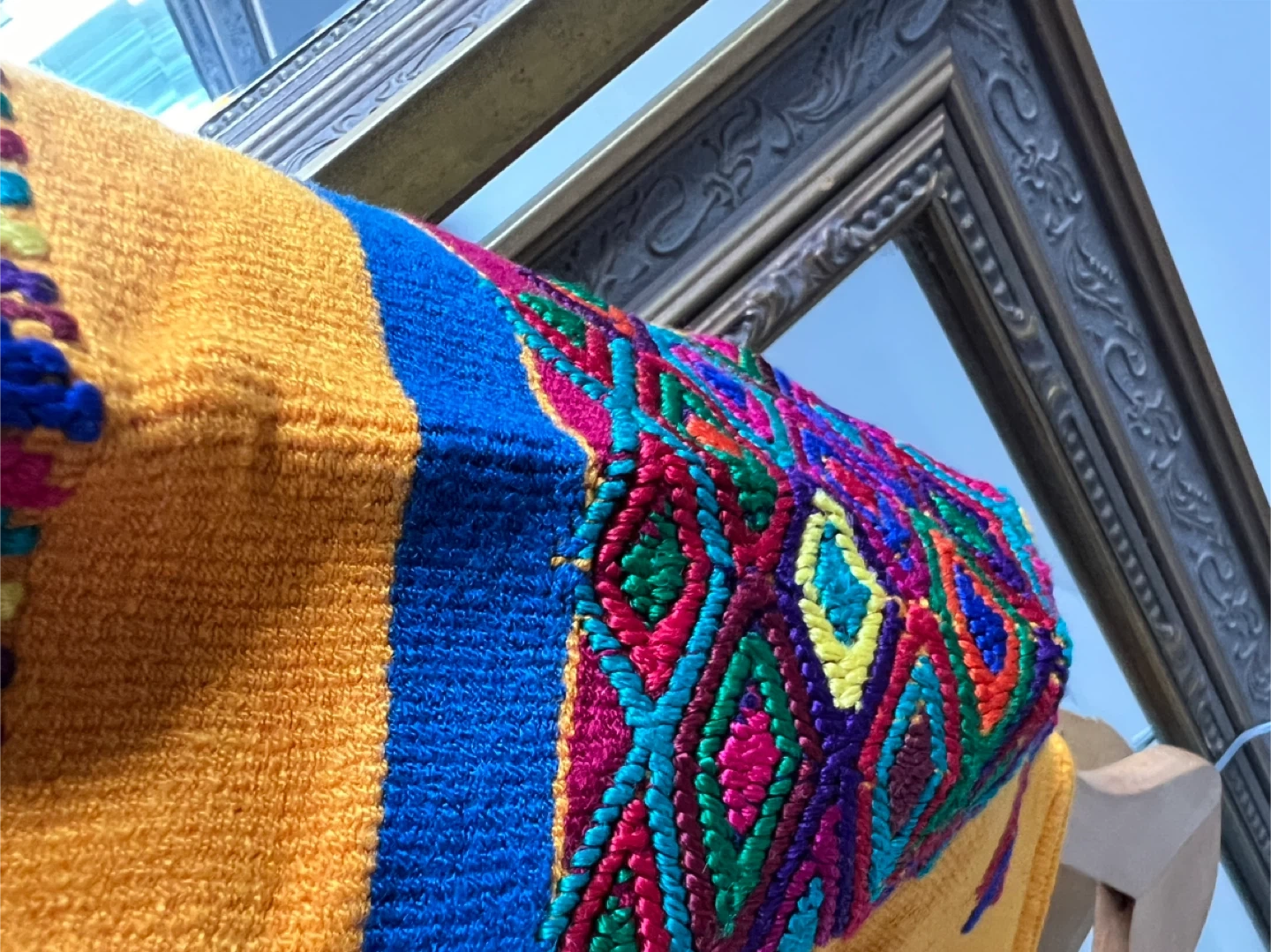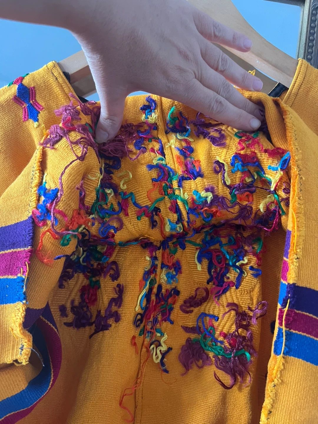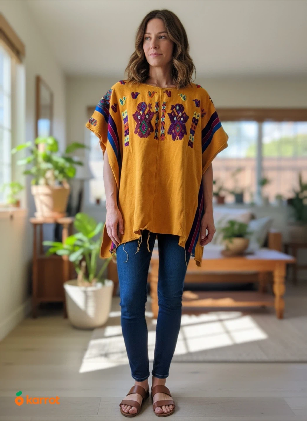 Handmade in Guatemala, One of a kind item. This is a vibrant yellow poncho with colorful embroidery. It appears to be handmade and has a unique, eye-catching design. The poncho features various embroidered details, including butterflies and geometric patterns. The material looks soft and comfortable, perfect for adding a pop of color to your wardrobe!