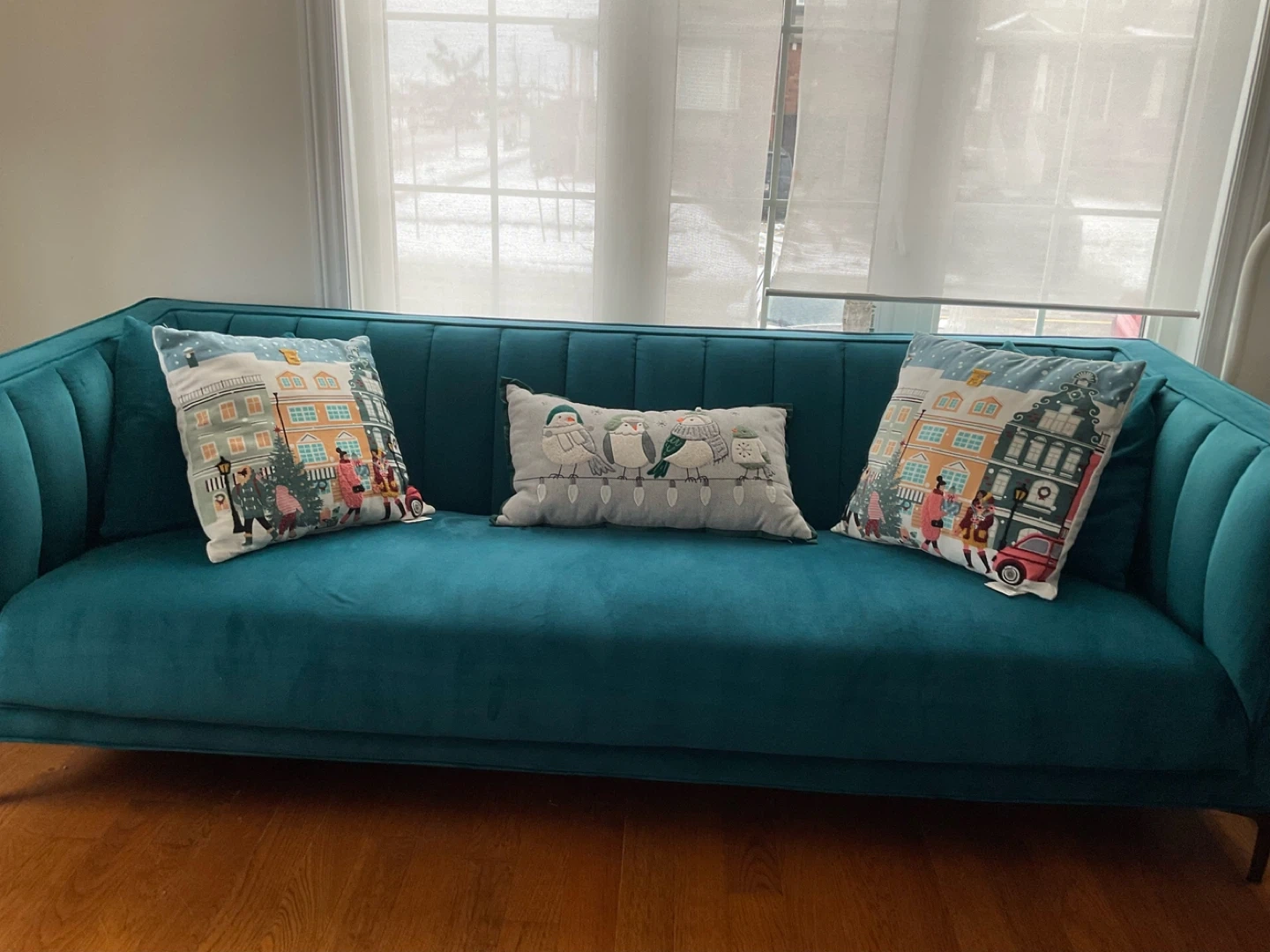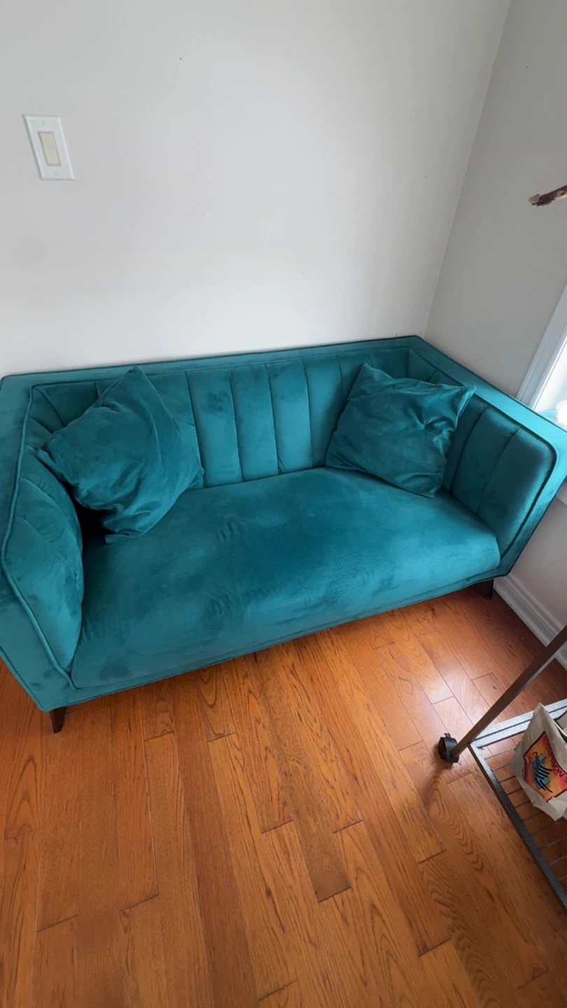 Selling a comfy teal velvet loveseat! It's in great condition and would look lovely in any living room or den. The velvet is soft and the colour is a beautiful, rich teal. Perfect for snuggling up with a good book or watching a movie