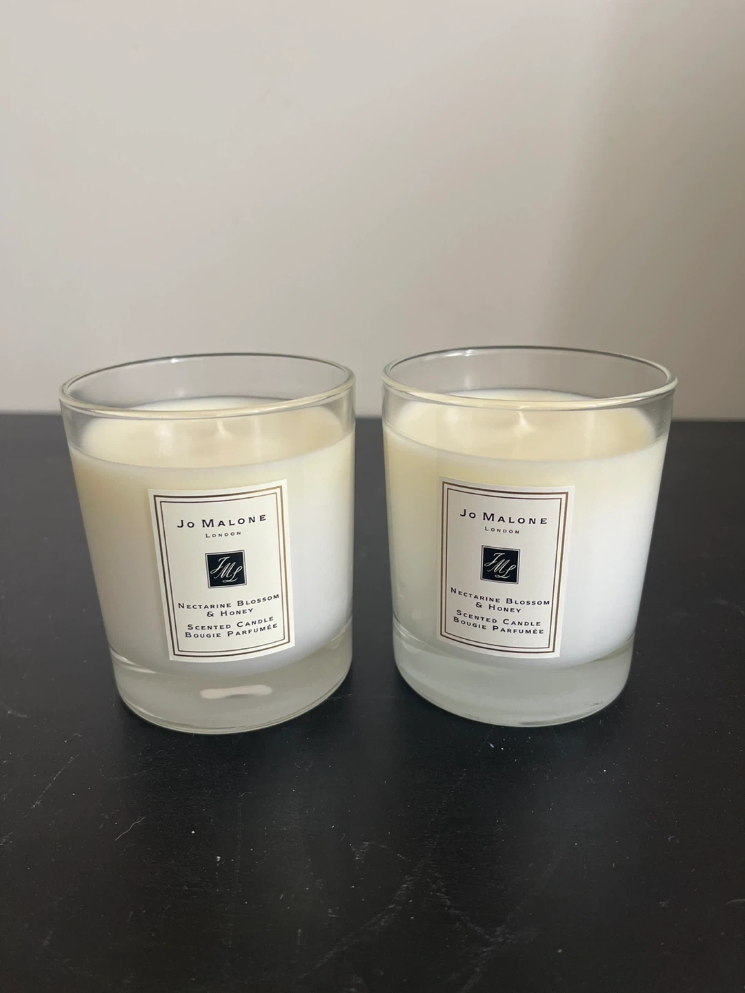 Selling two Jo Malone London Nectarine Blossom & Honey scented candles! These candles smell absolutely divine and will fill your home with a sweet, fruity fragrance. Perfect for creating a cozy and inviting atmosphere