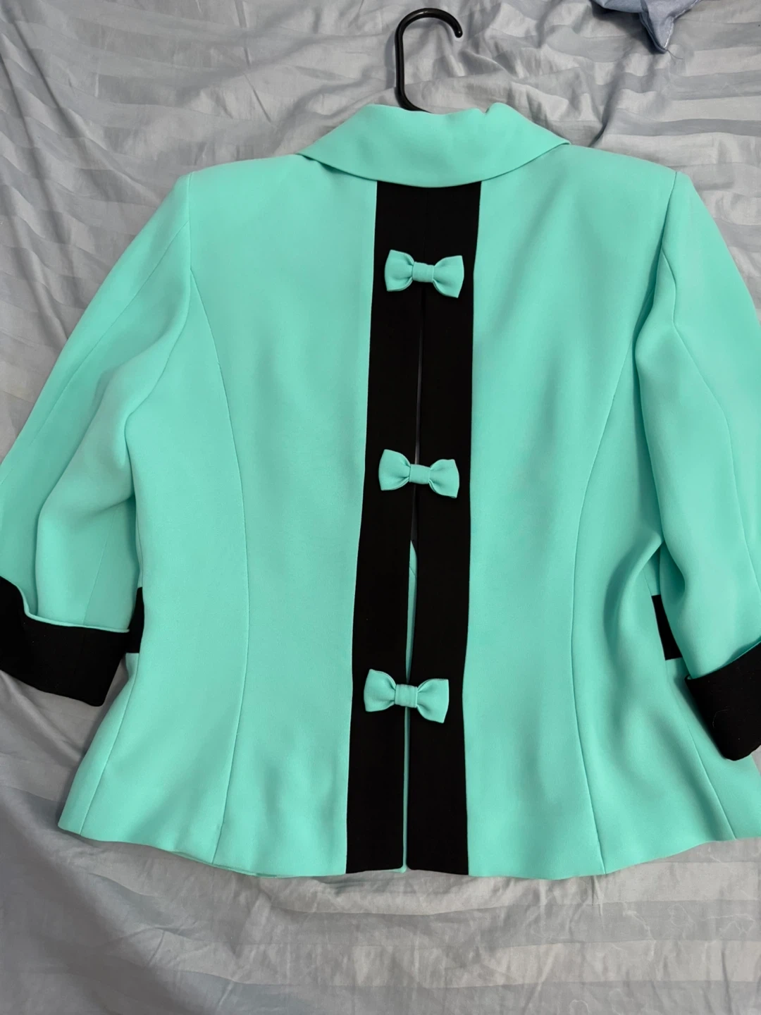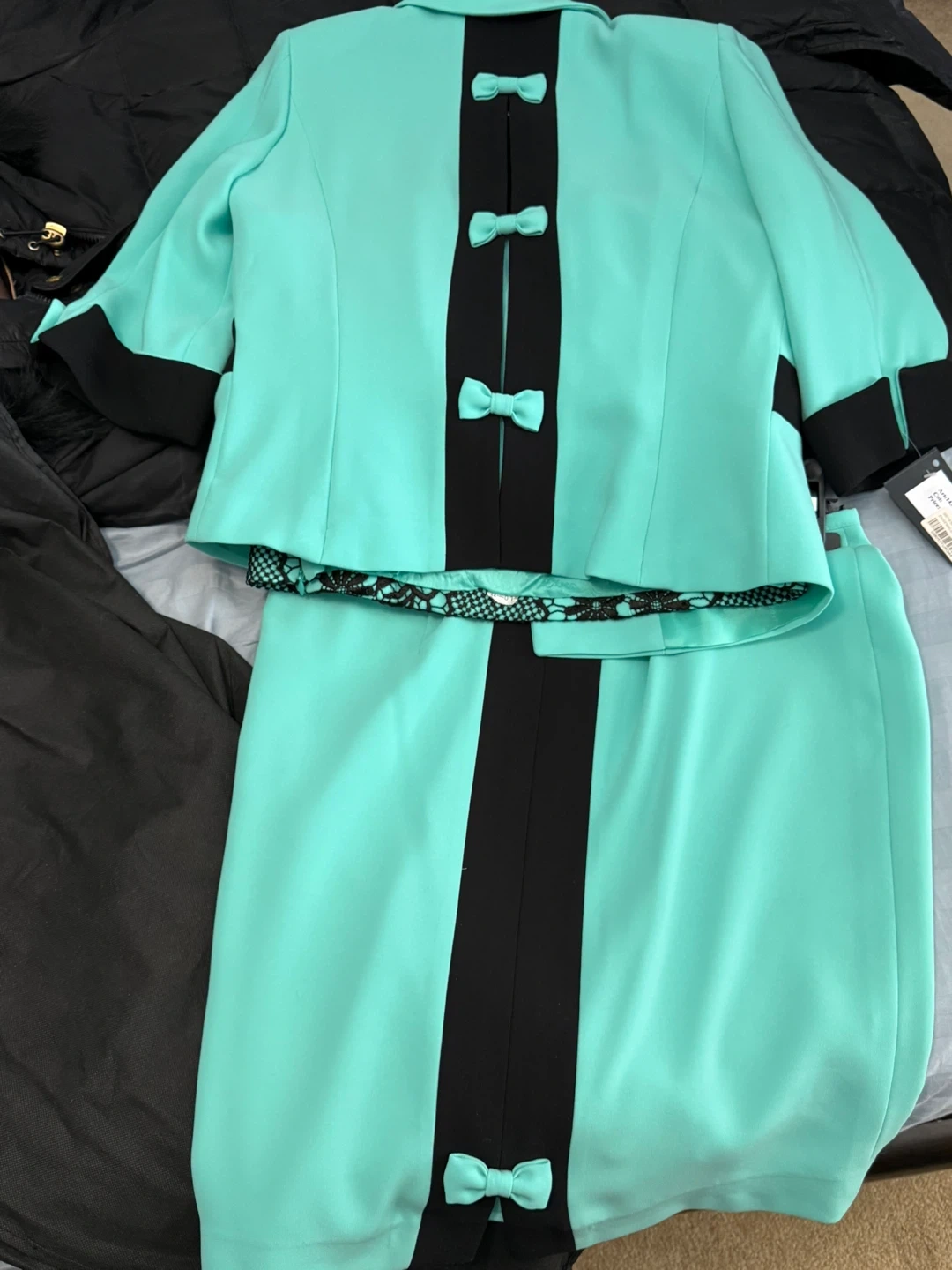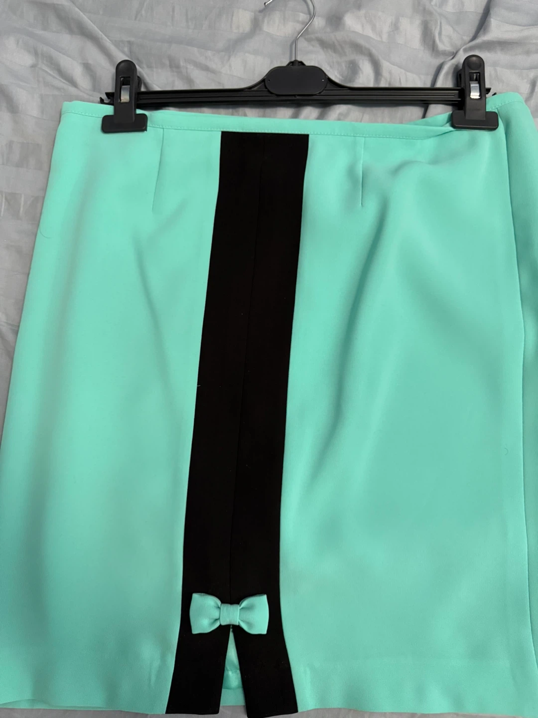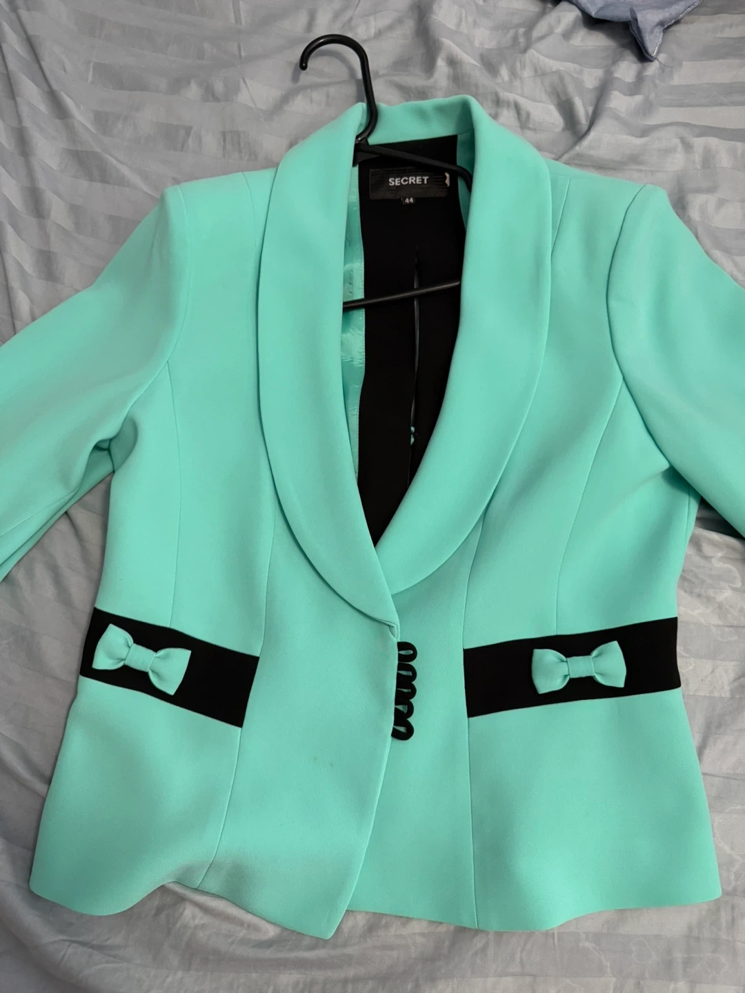 Selling a cute skirt suit from Secret! It's a lovely mint green colour with black detailing and bows. The size is 44. Perfect for a special occasion or just feeling fancy!