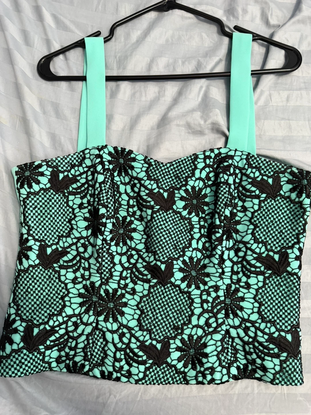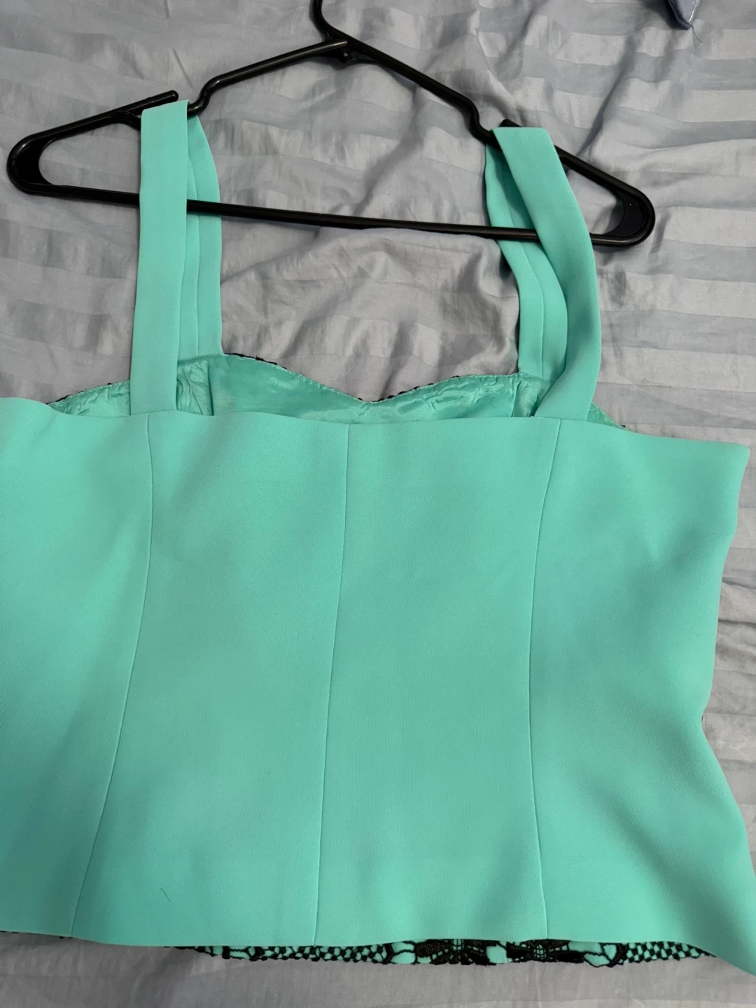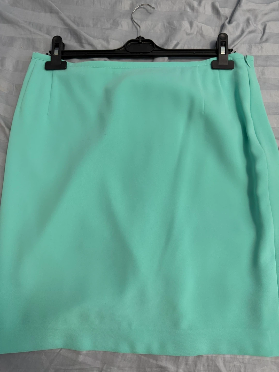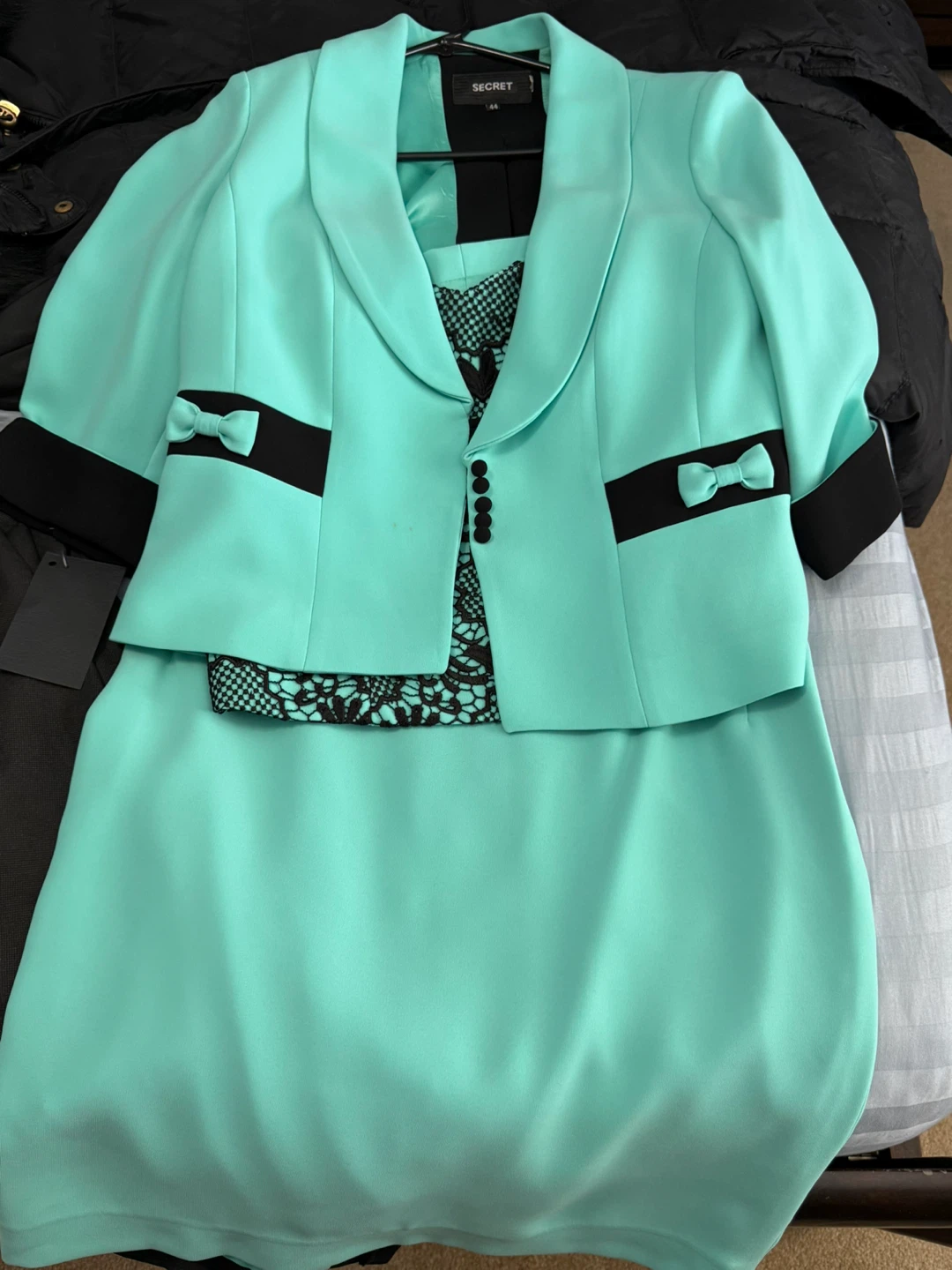 Selling a cute skirt suit from Secret! It's a lovely mint green colour with black detailing and bows. The size is 44. Perfect for a special occasion or just feeling fancy!