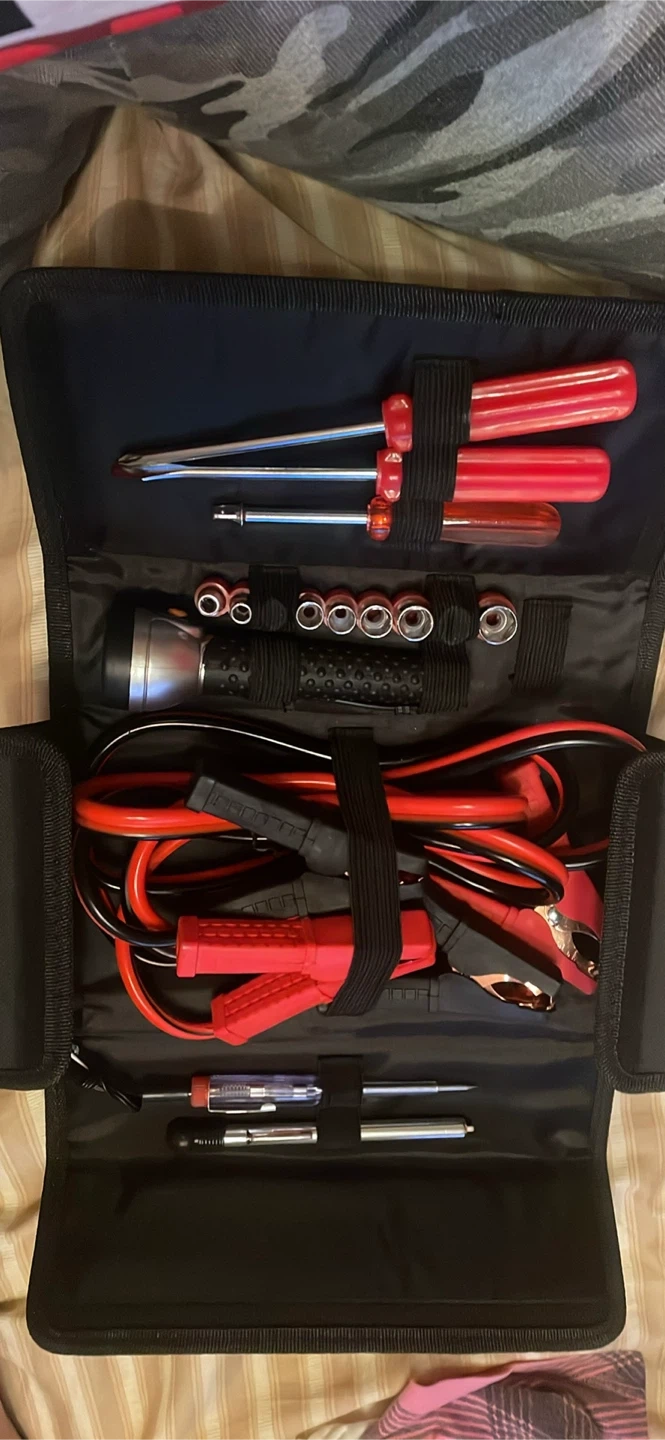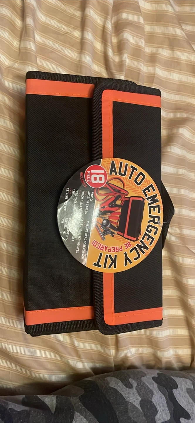 Selling an auto emergency kit with 18 pieces. It features a compact design that easily stores in your car boot. It contains essential auto emergency tools and keeps contents organized. Includes booster cables, flashlight and battery tester
