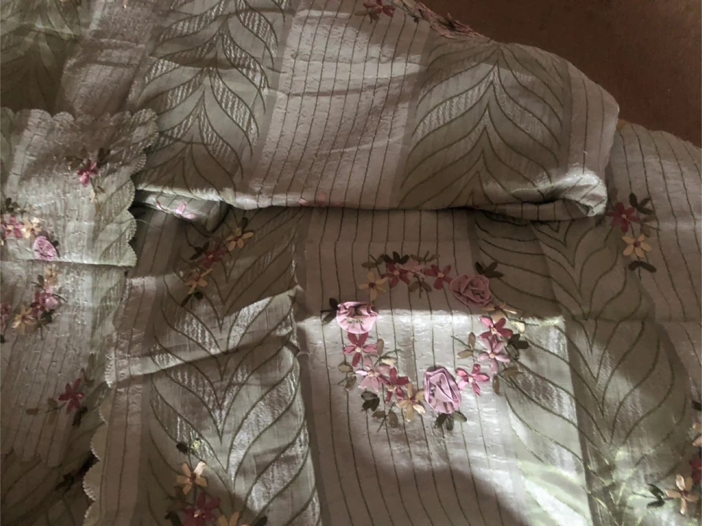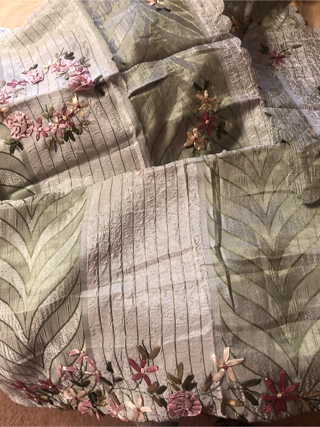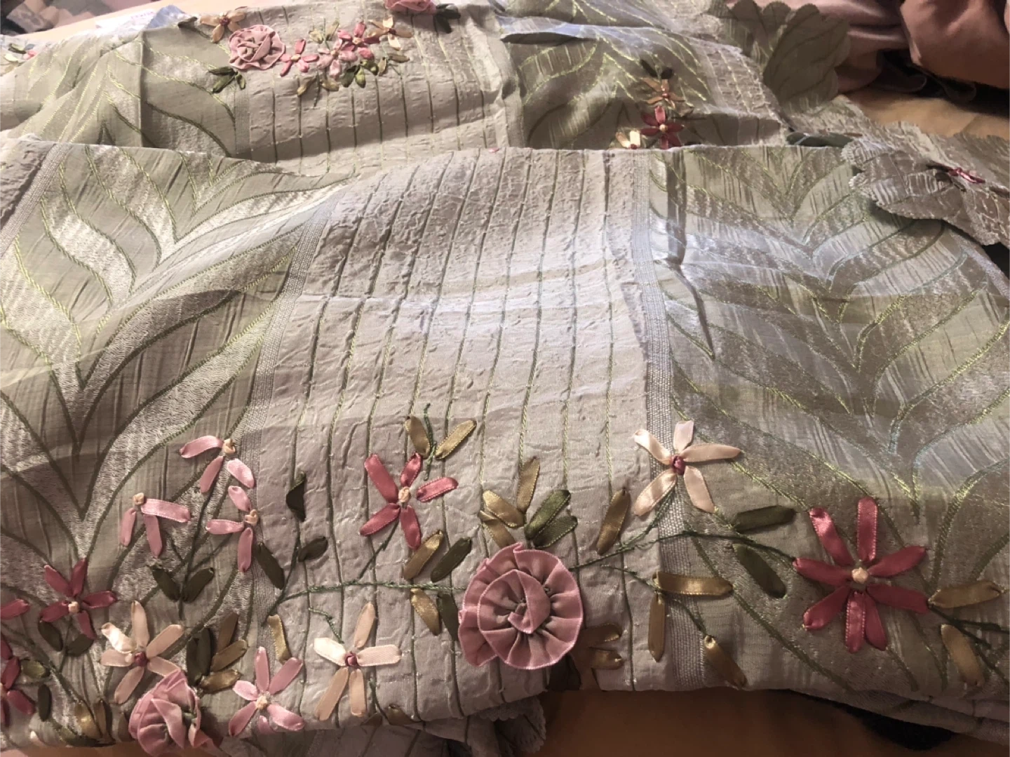 Beutifull pista green with delicate ribbon floral embroidery. The material has a lovely texture