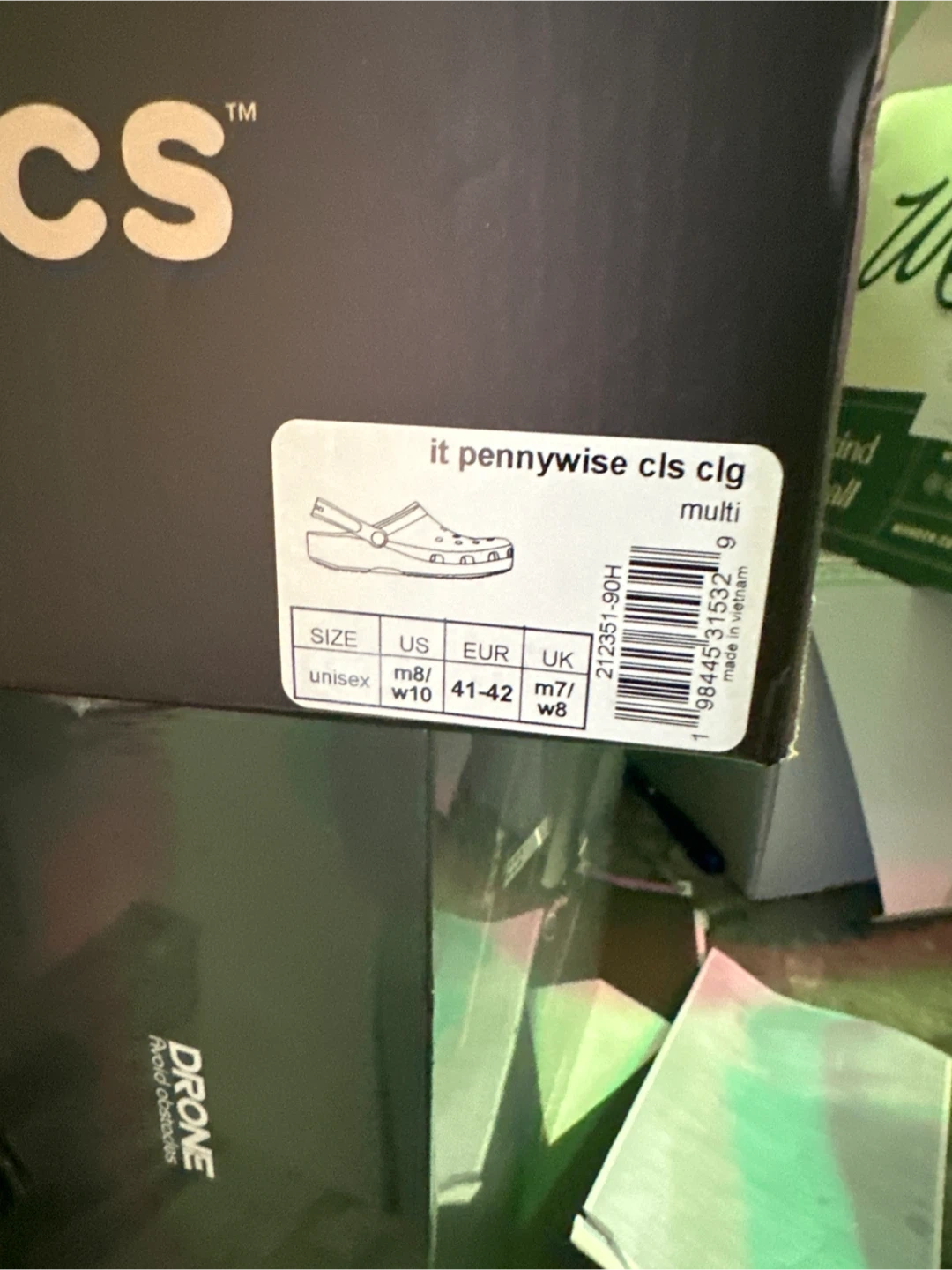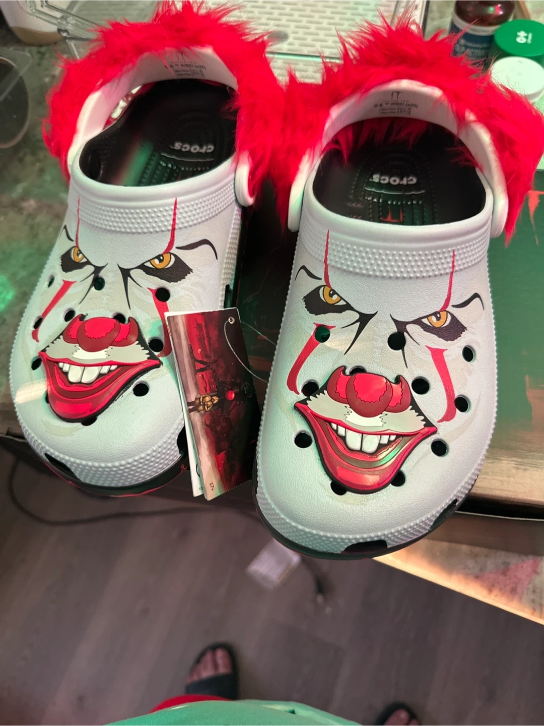 Selling a pair of it pennywise Crocs! They are a US men's size 8 and women's size 10. They come with the box!