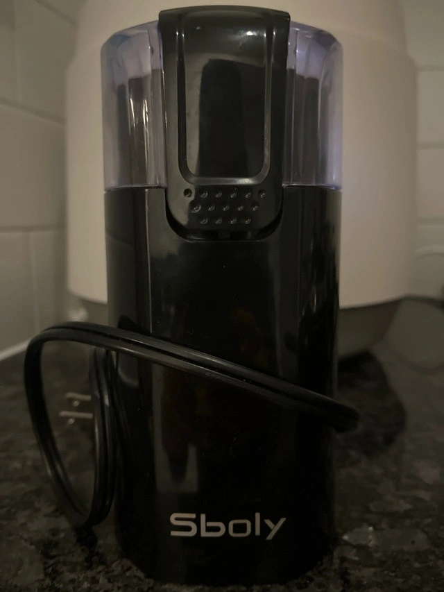 This Sboly coffee grinder is perfect for quickly grinding coffee beans, spices, or nuts with its efficient blade system, though it is in used condition. Specifications: * Brand: Sboly * Type: Blade Coffee Grinder. This grinder is ready to bring some magic to your morning coffee. Just a heads-up, if the ad is still up, the grinder is still up for grabs!