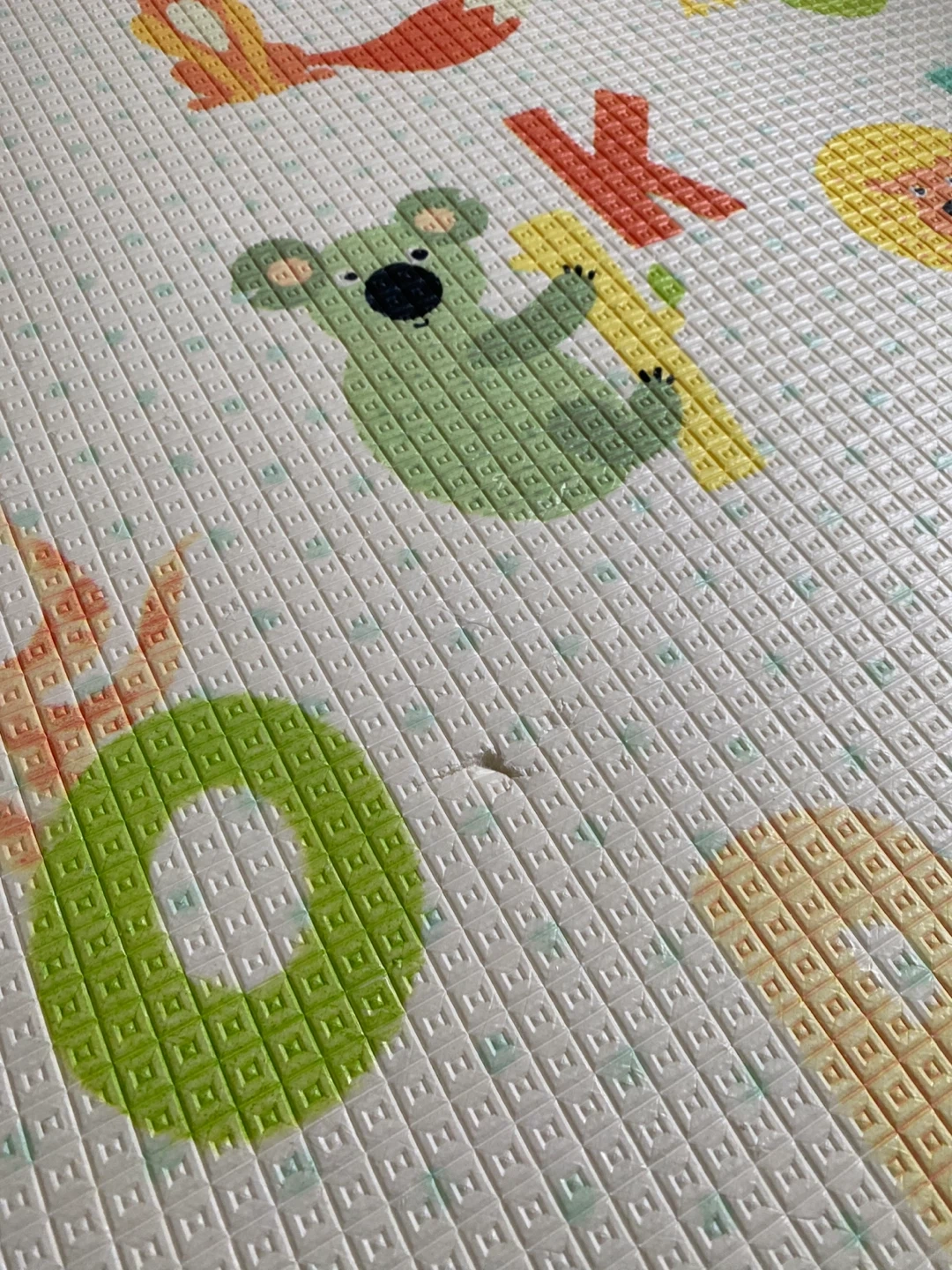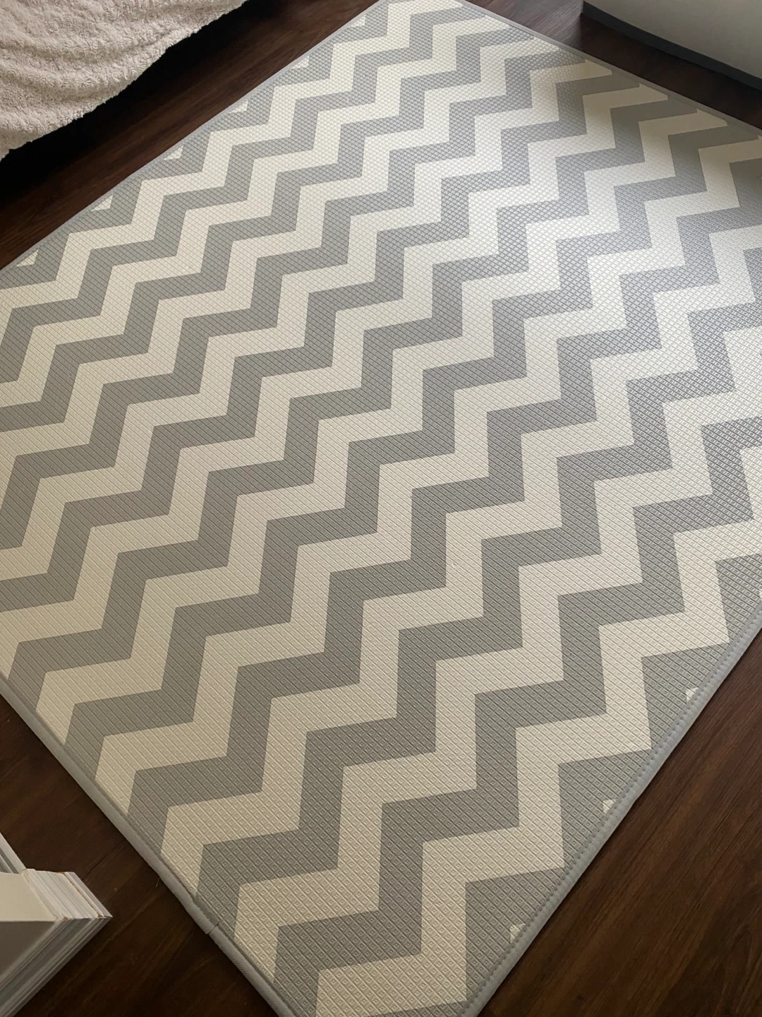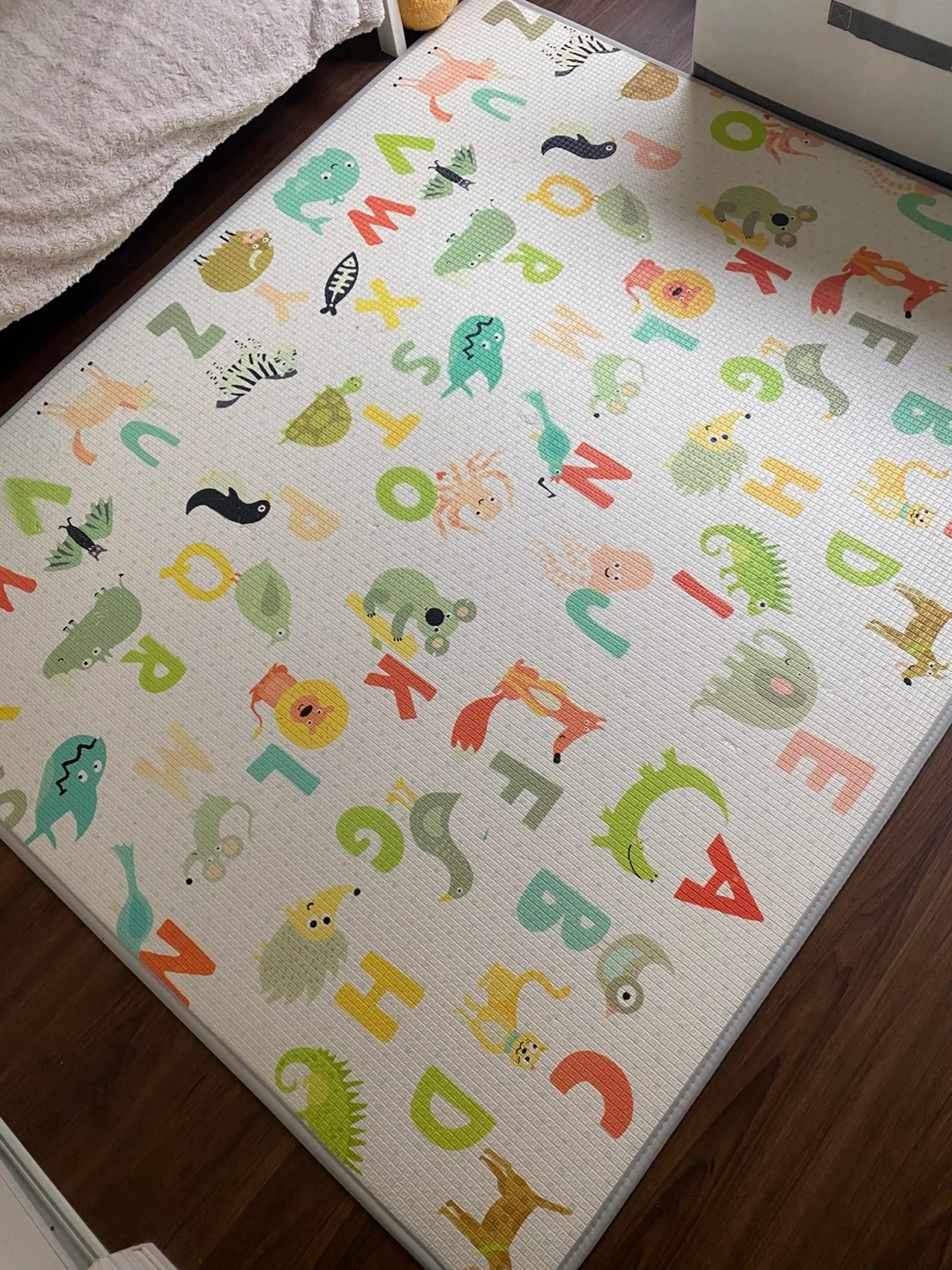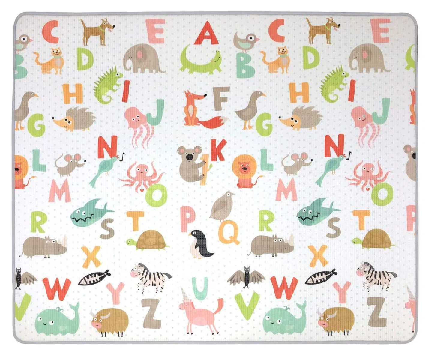 This play mat features a fun alphabet and animal design on one side, and a grey and white chevron pattern on the other! It's perfect for tummy time or creating a soft play area for your little one