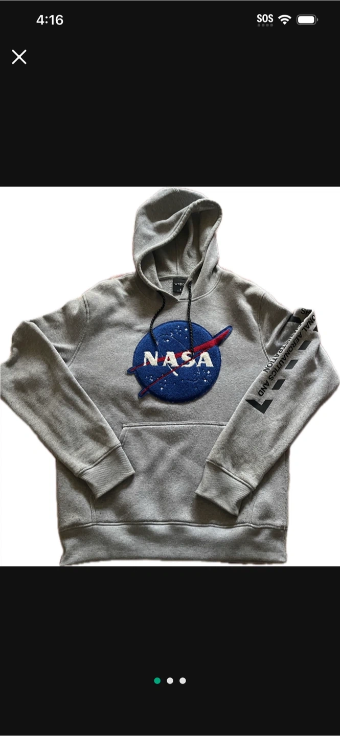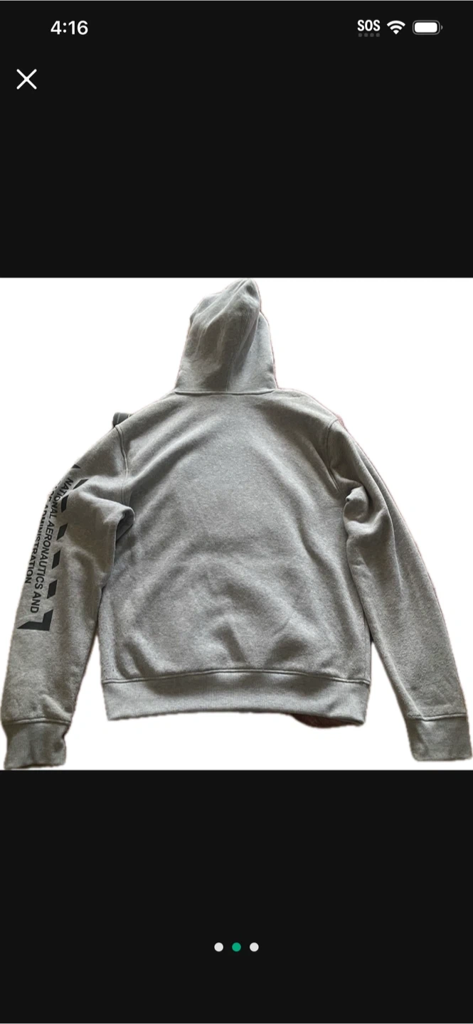 Selling a gray NASA hoodie! It's in great condition and features the classic NASA logo on the front. The sleeves also have some cool aeronautics and space administration detailing. Perfect for any space enthusiast!