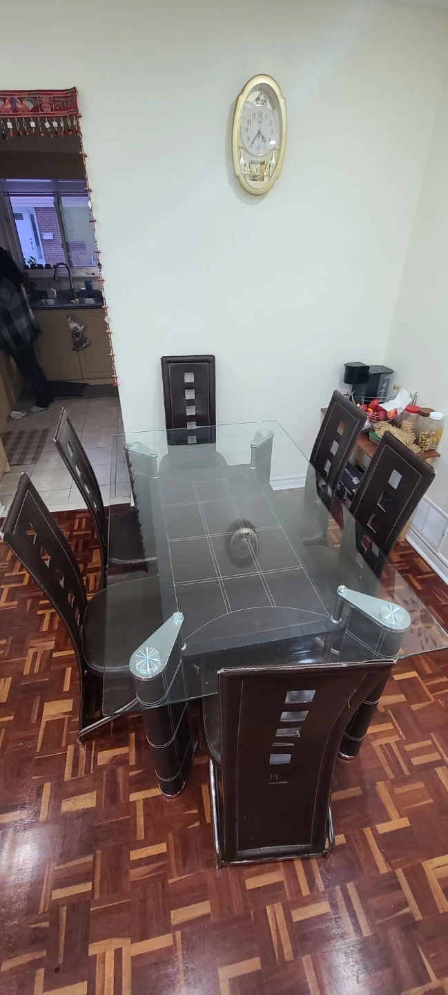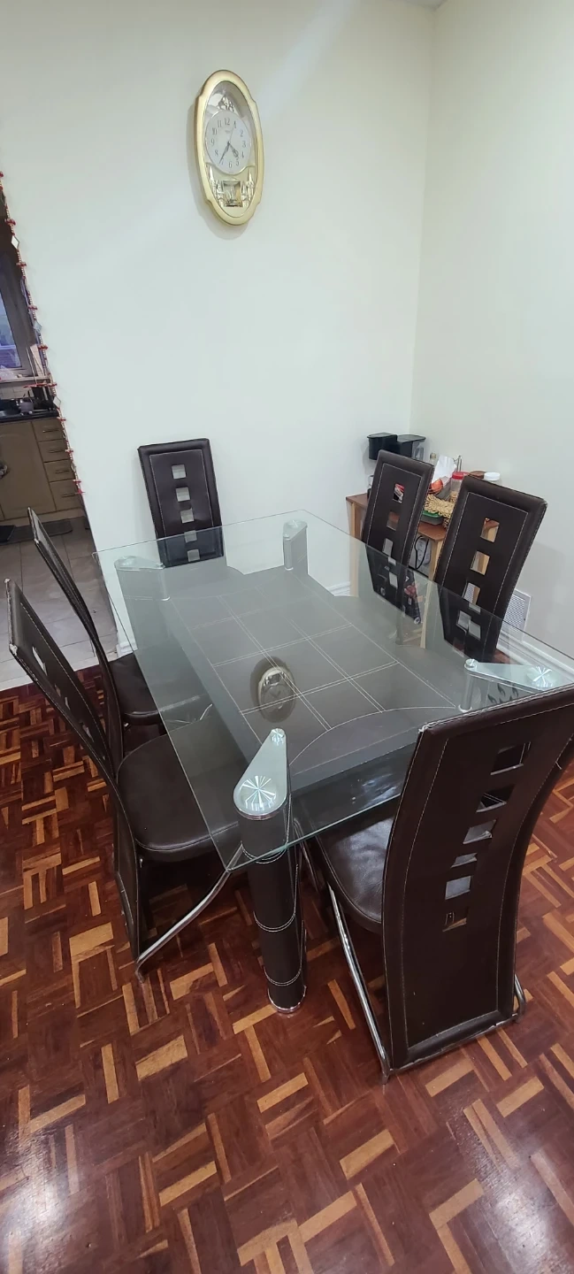 Selling a glass top dining table that comes with six chairs. It's a stylish set that would look great in any dining room!
