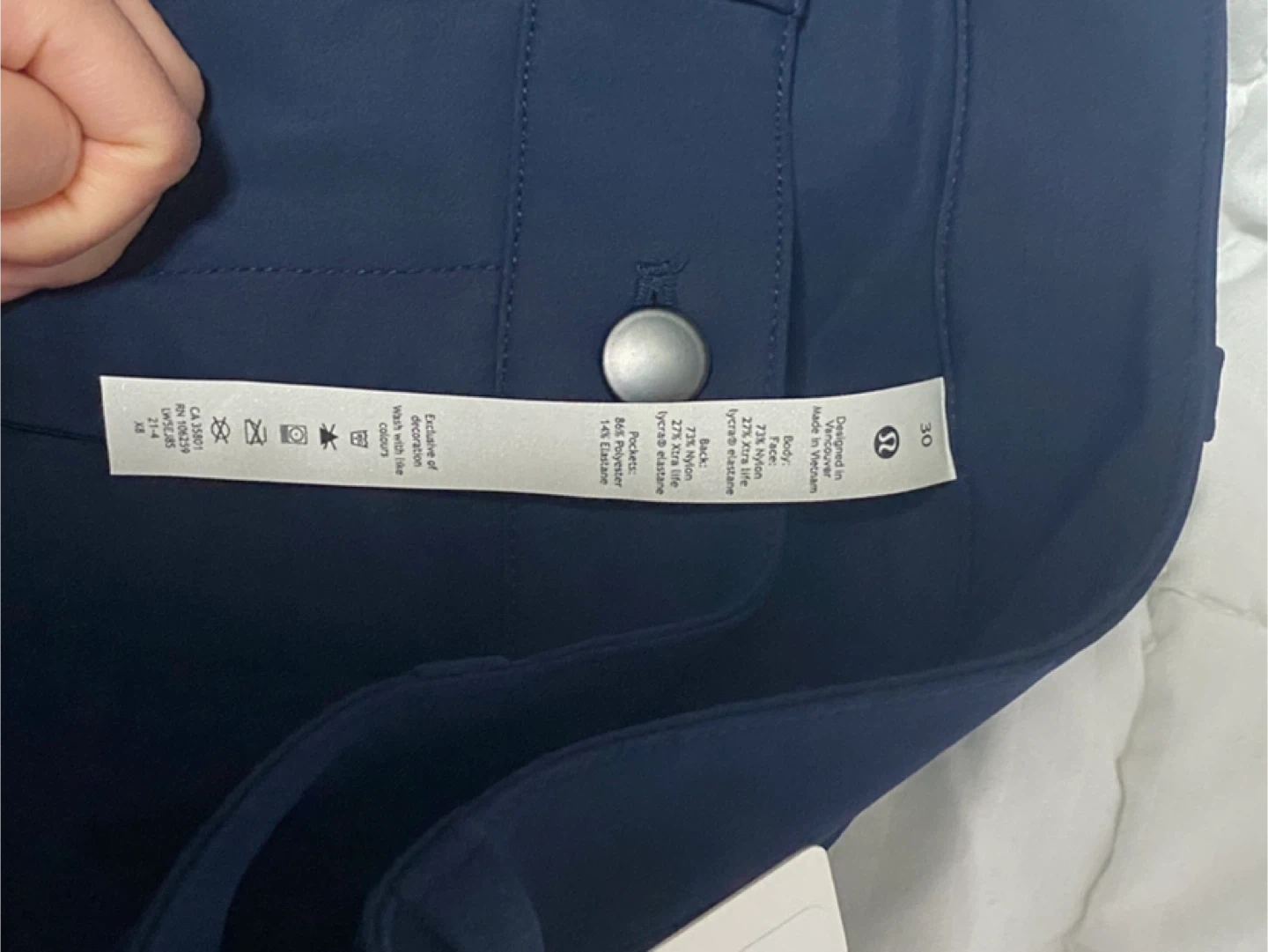 I'm selling a pair of Lululemon women's pants in size 30. They're a nice navy blue colour! The material is a blend of: