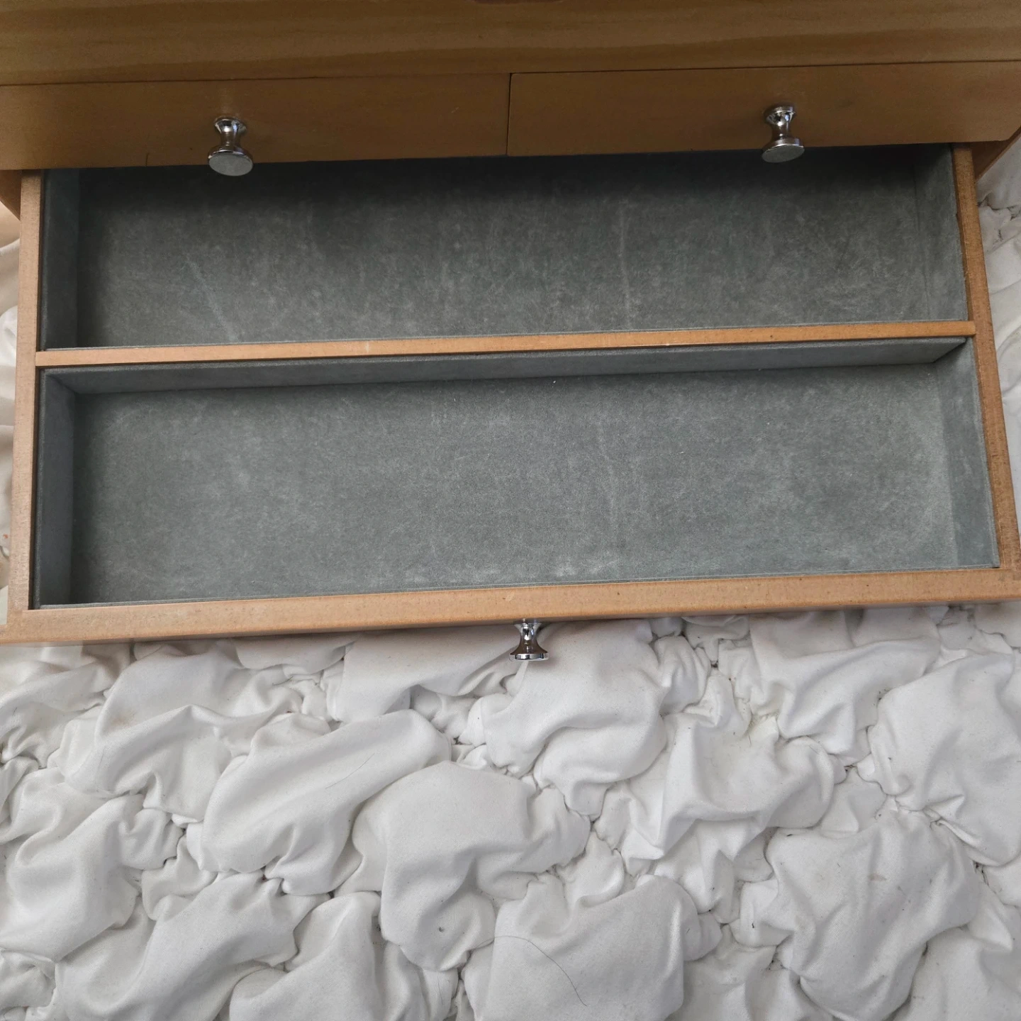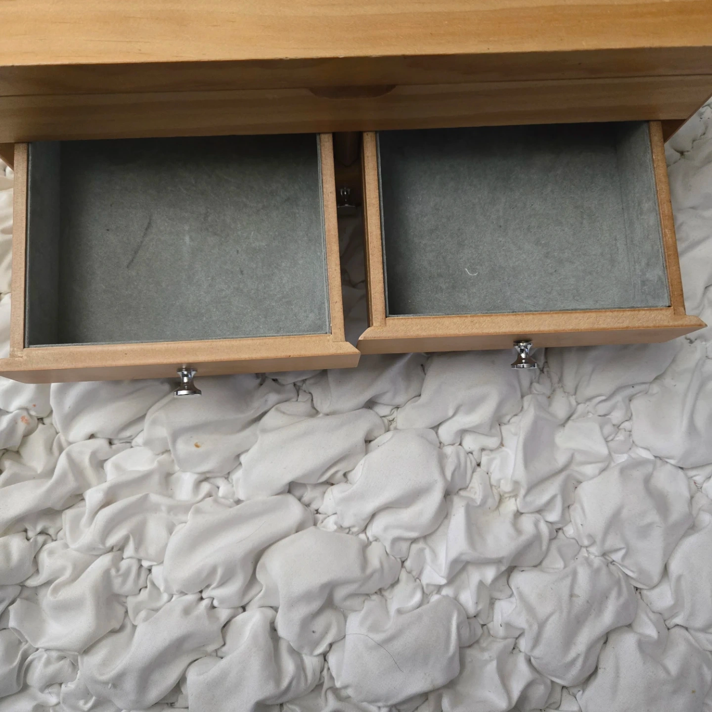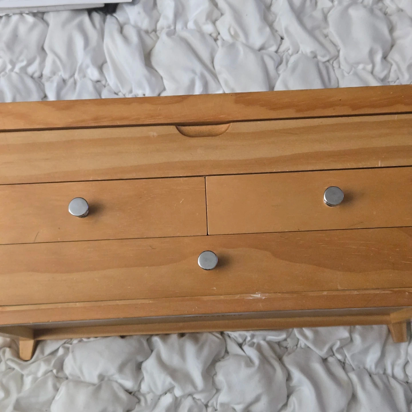 Here's a cute wooden dresser from Red Envelope! It's perfect for adding a touch of charm to any room. The dresser features a natural wood finish and has two drawers with silver knobs.
