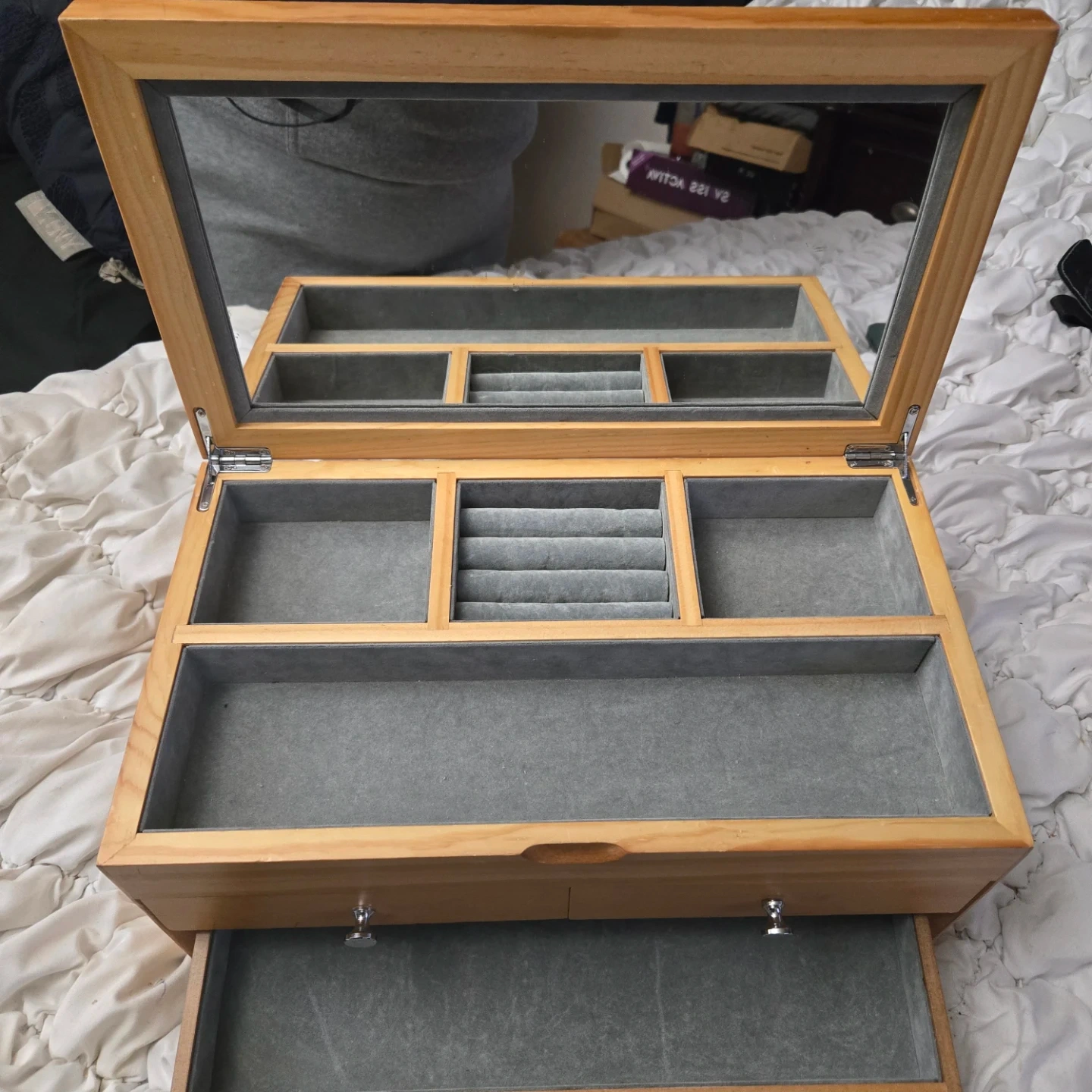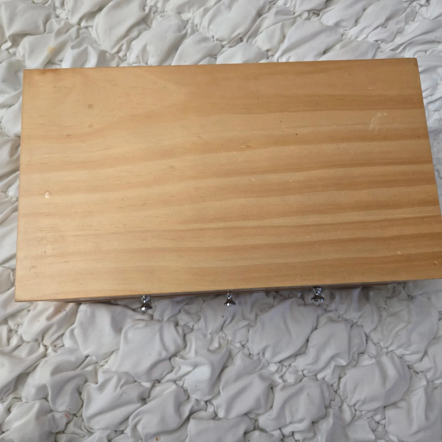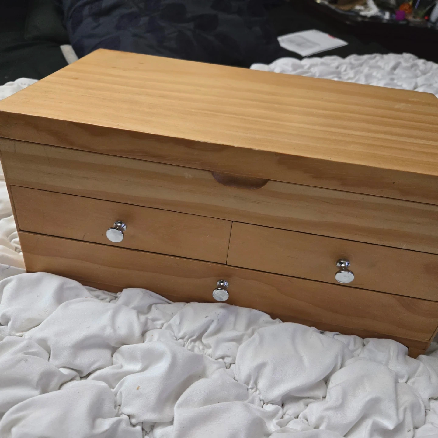 Here's a cute wooden dresser from Red Envelope! It's perfect for adding a touch of charm to any room. The dresser features a natural wood finish and has two drawers with silver knobs.