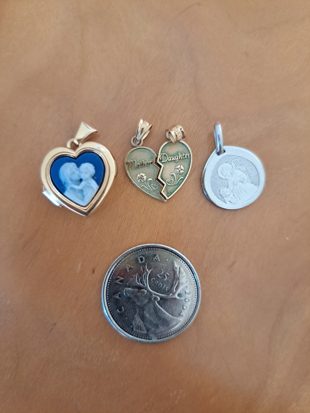 Selling a few pendants! There's a gold heart-shaped pendant that says "Mother Daughter", a gold heart locket with a couple inside, and a silver angel charm. The angel charm is marked "10K ITALY" on the back.