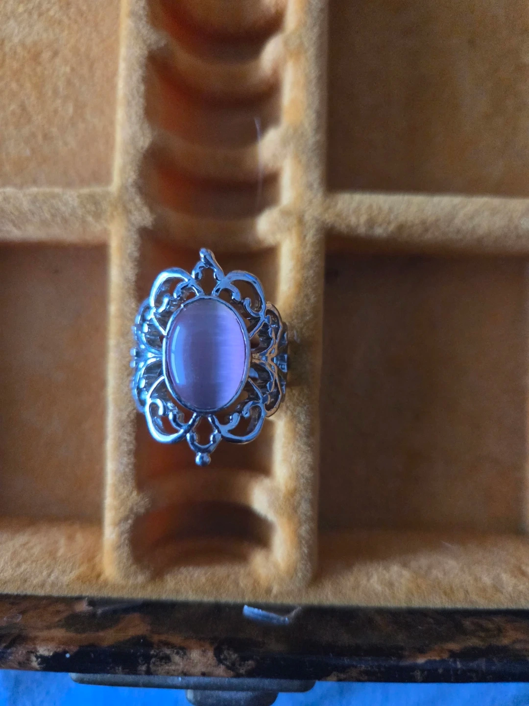 Selling a lovely silver ring with a pink stone. It features a delicate, ornate design. The ring is in good condition and ready to be worn!