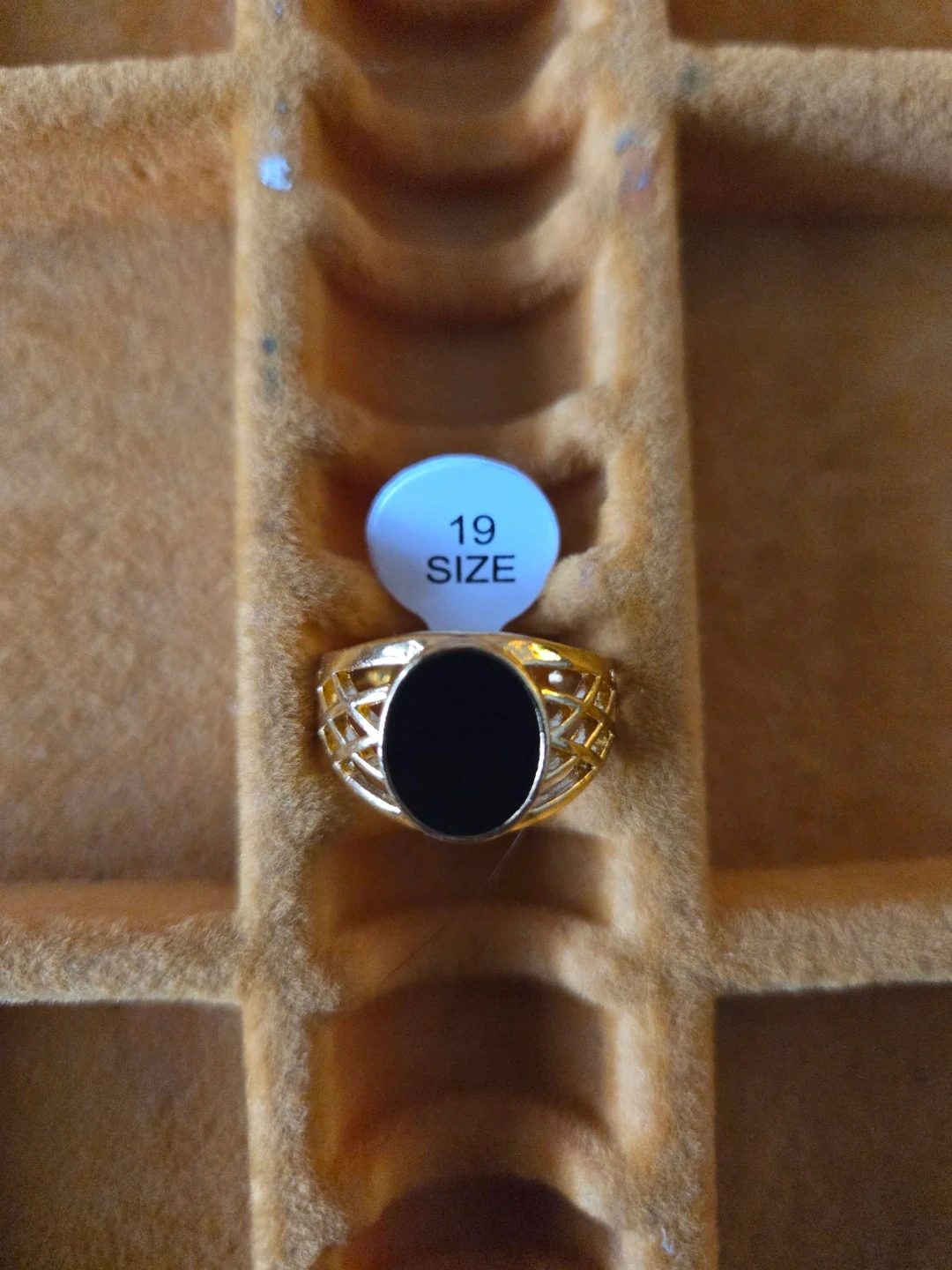 Selling a gold-coloured ring featuring a sleek black stone. The ring is size 19. It's in great condition and ready to wear!