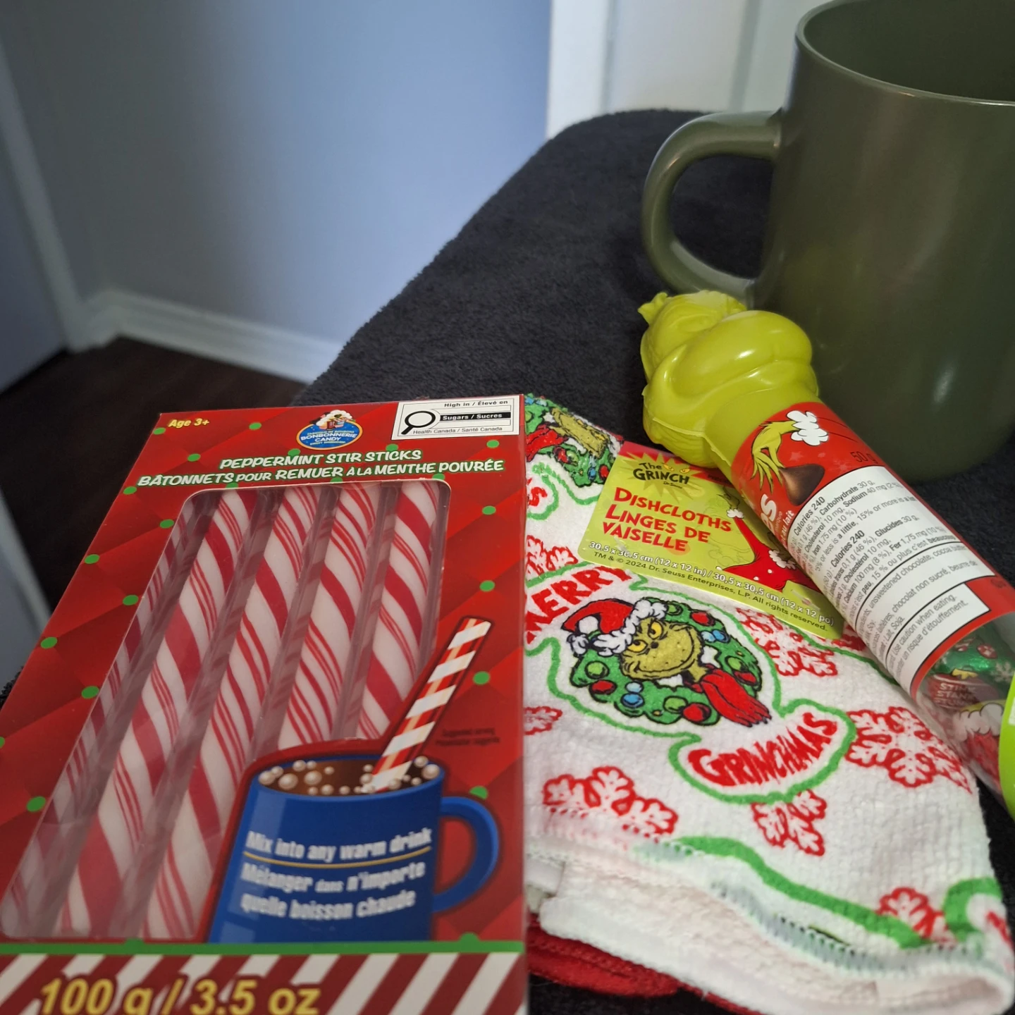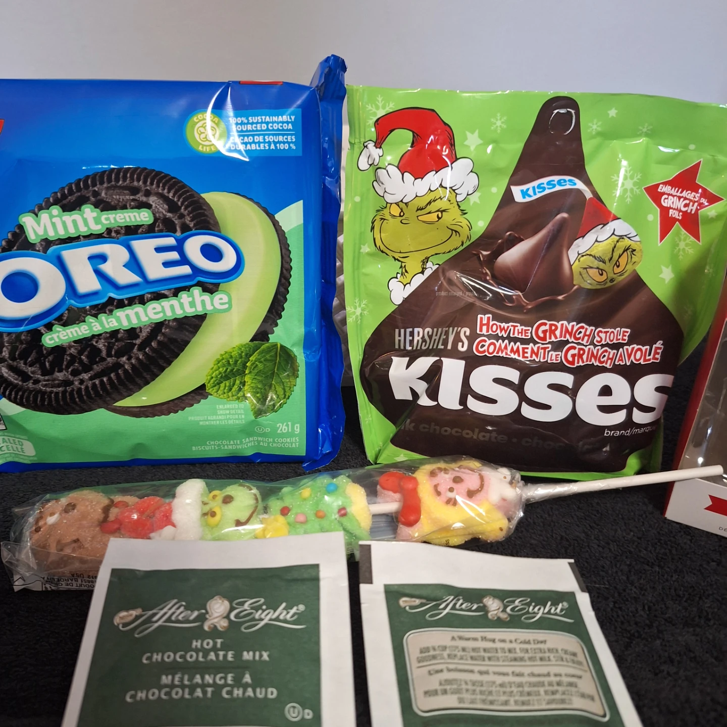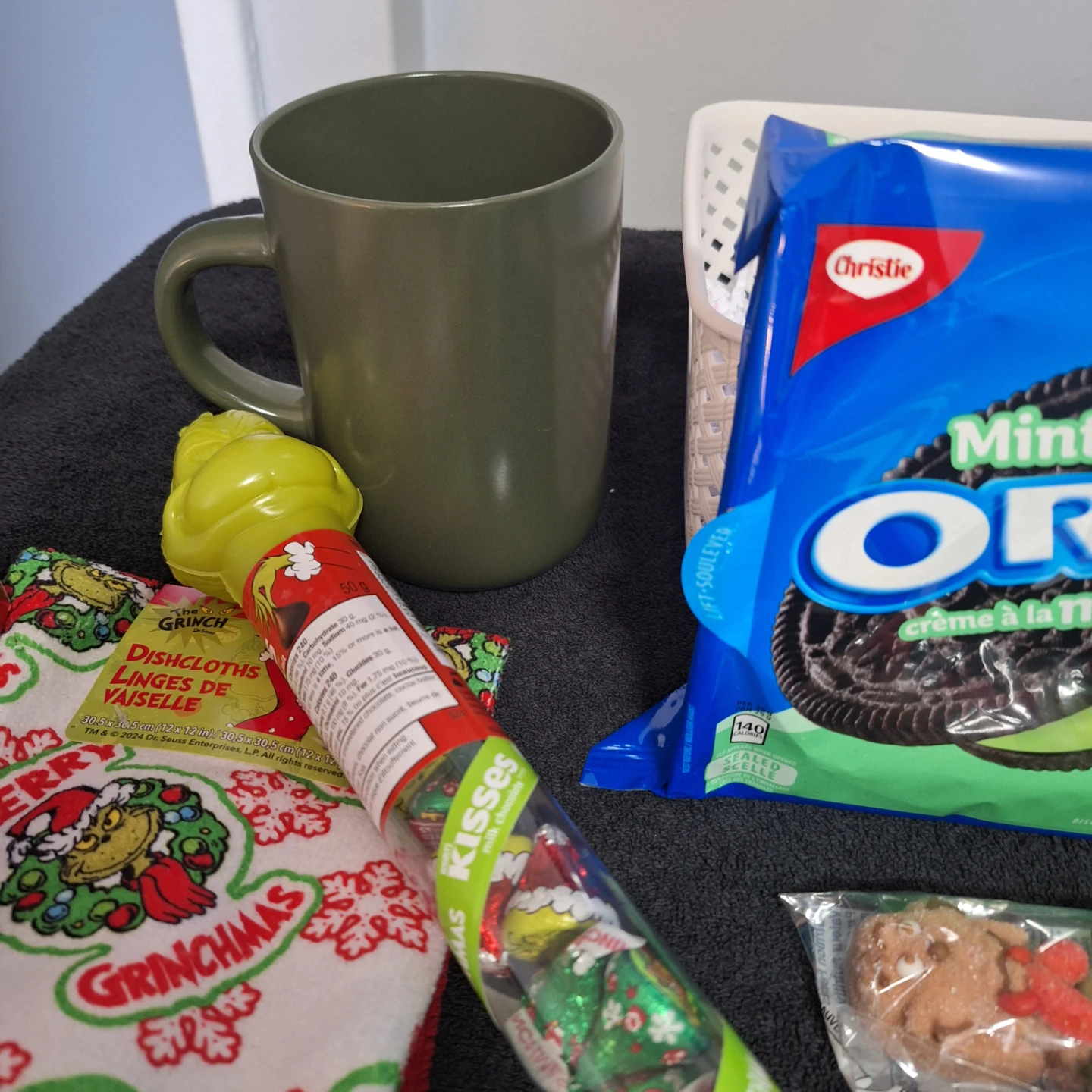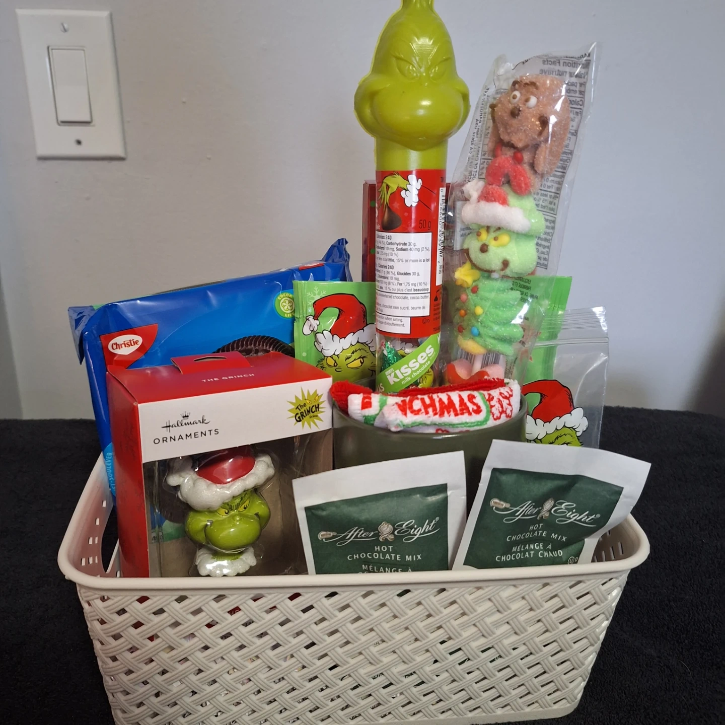 Selling a cute Grinch-themed Christmas gift basket! It includes a variety of goodies, perfect for the holidays. There's a Grinch lollipop, Grinch dishcloths that are 30.5 x 30.5 cm, After Eight hot chocolate mix, and other fun items. A great gift for a Grinch fan!