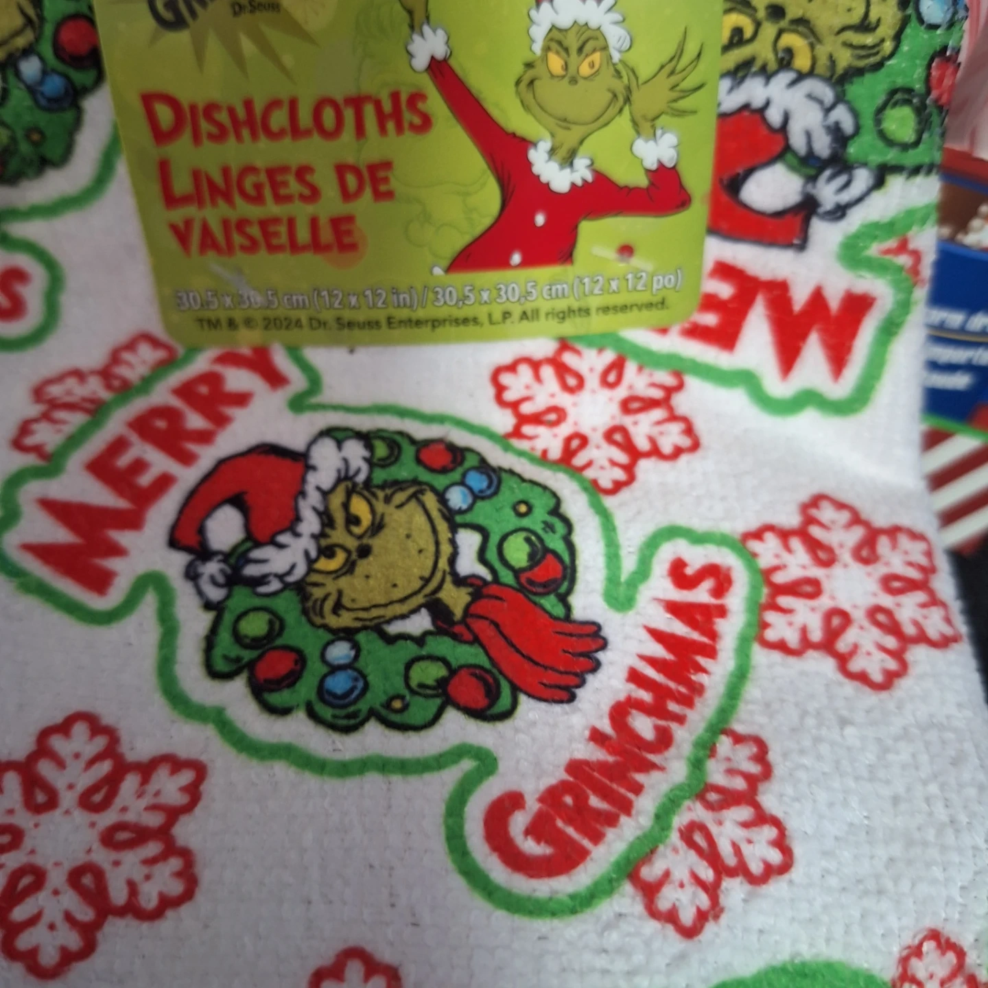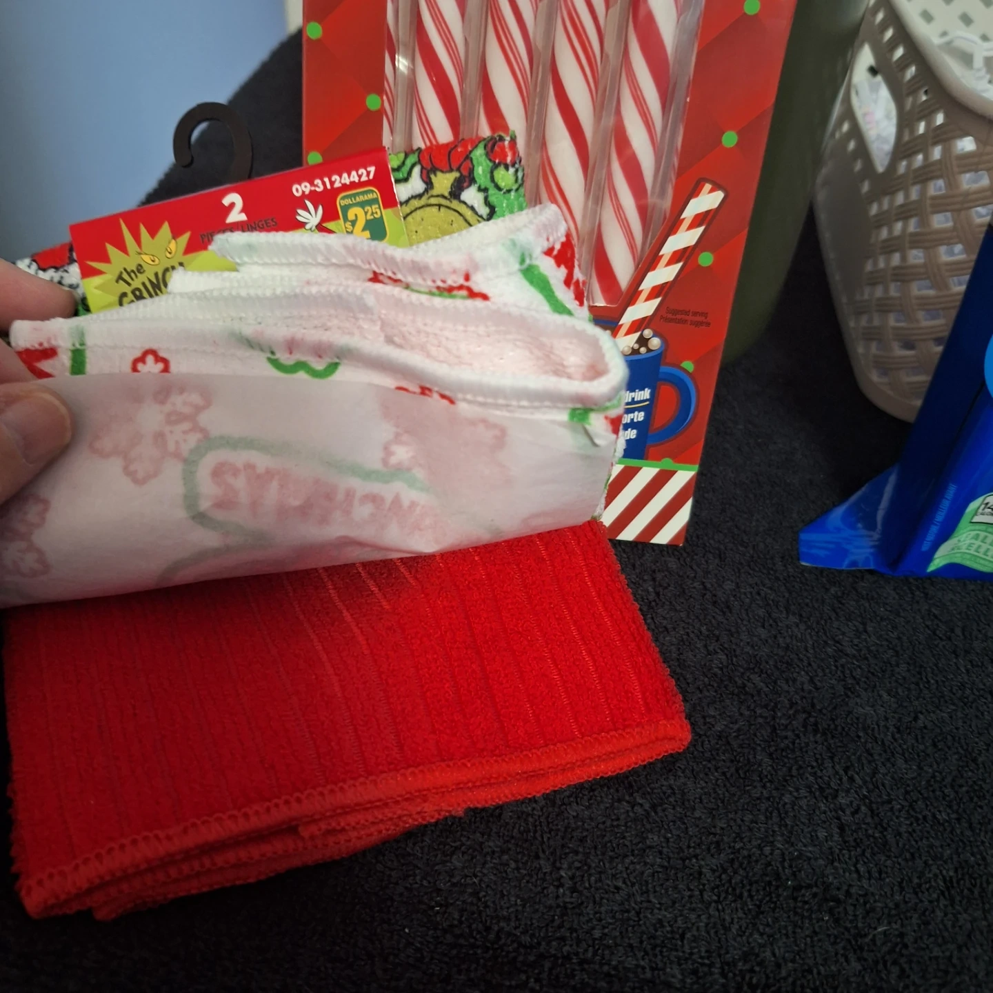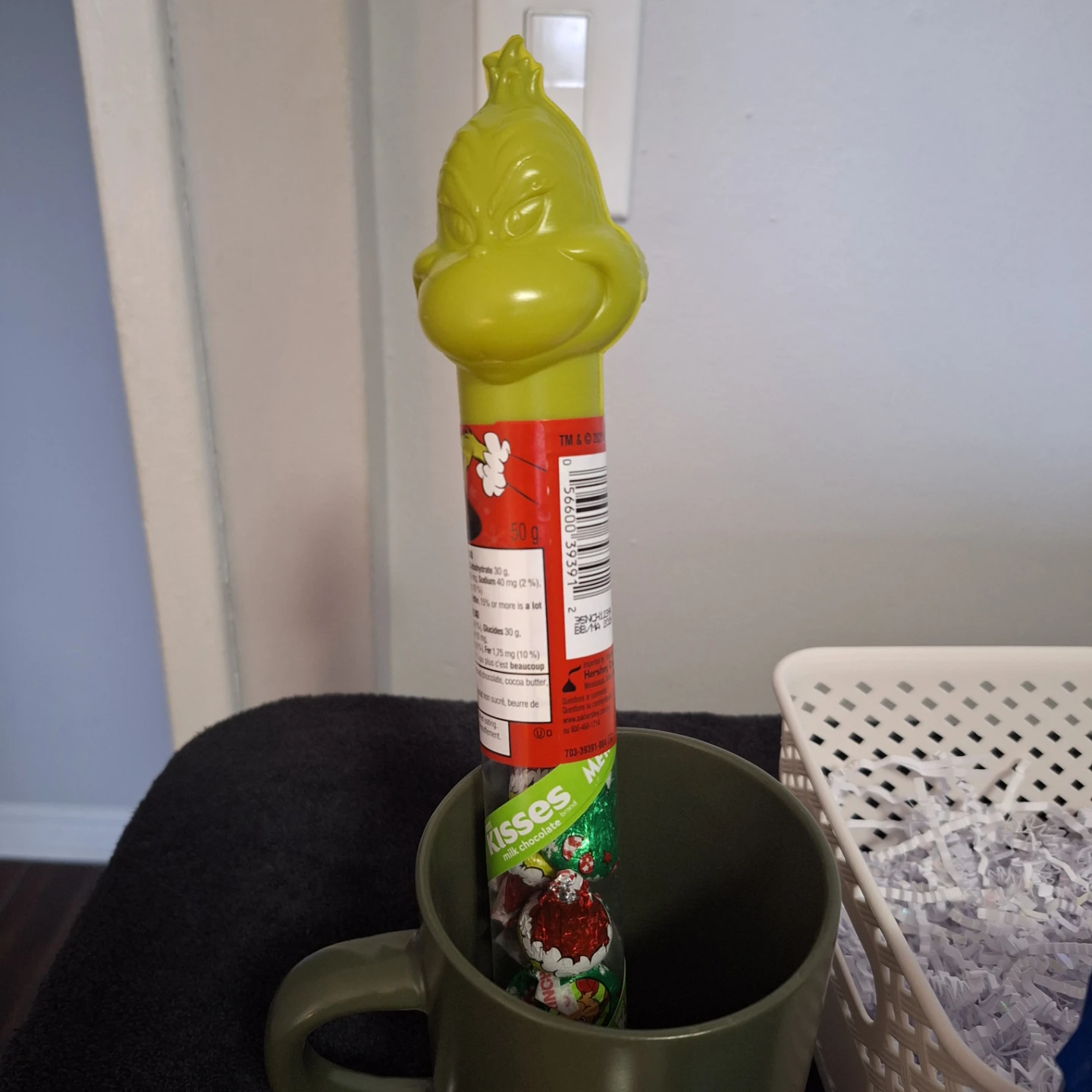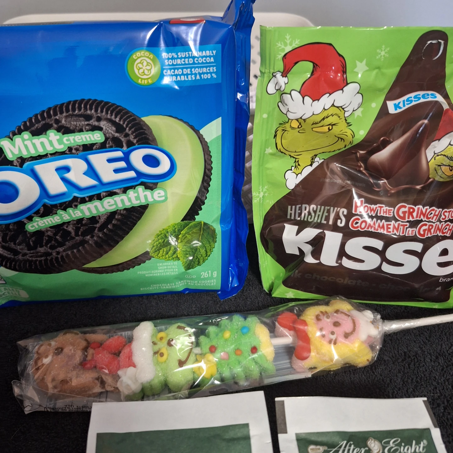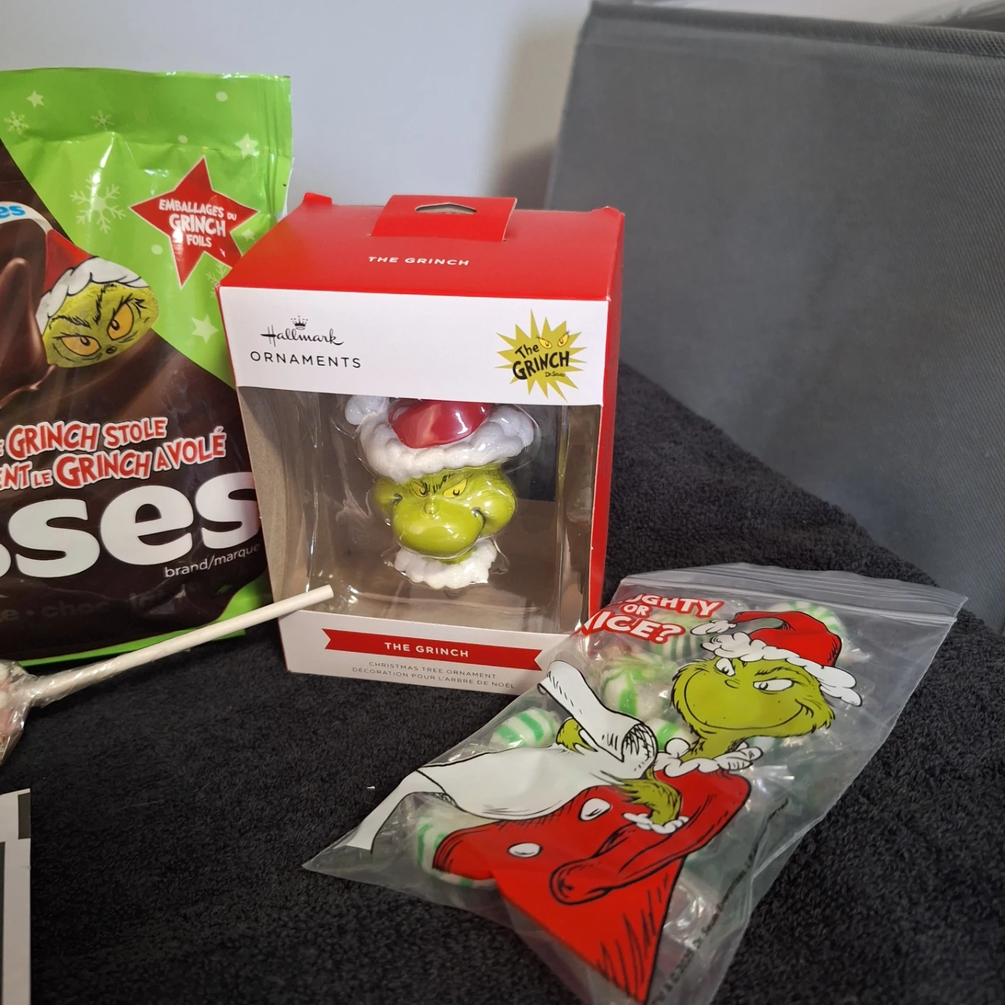 Selling a cute Grinch-themed Christmas gift basket! It includes a variety of goodies, perfect for the holidays. There's a Grinch lollipop, Grinch dishcloths that are 30.5 x 30.5 cm, After Eight hot chocolate mix, and other fun items. A great gift for a Grinch fan!
