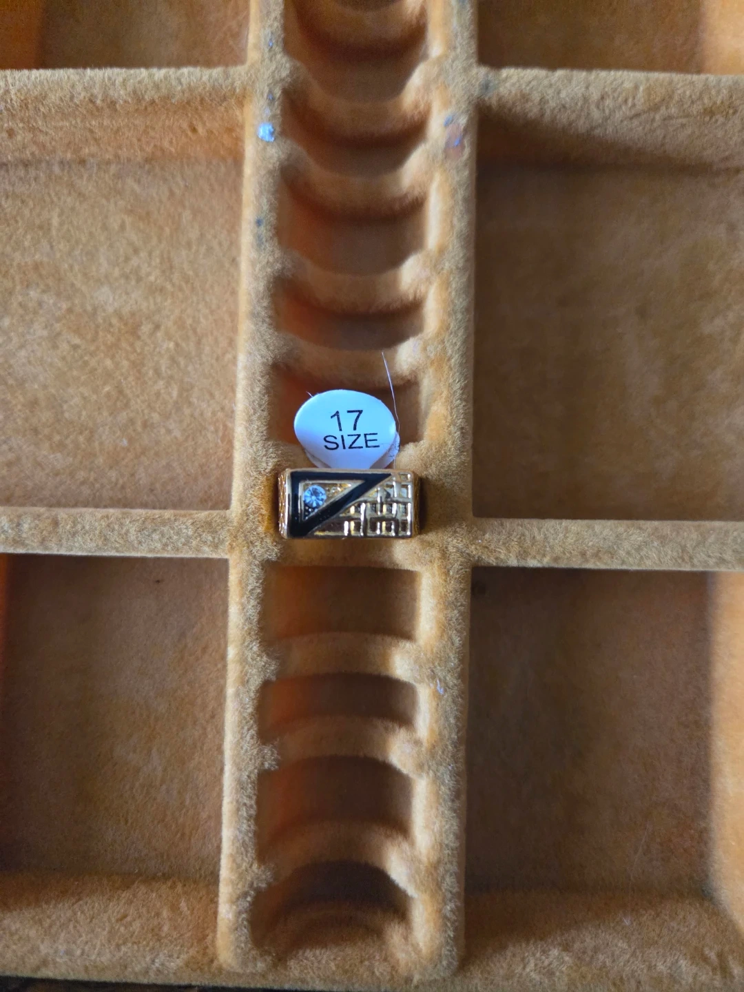 Selling a ring, size 17. It has a gold-tone band and a blue and white design on top. It's in good condition!