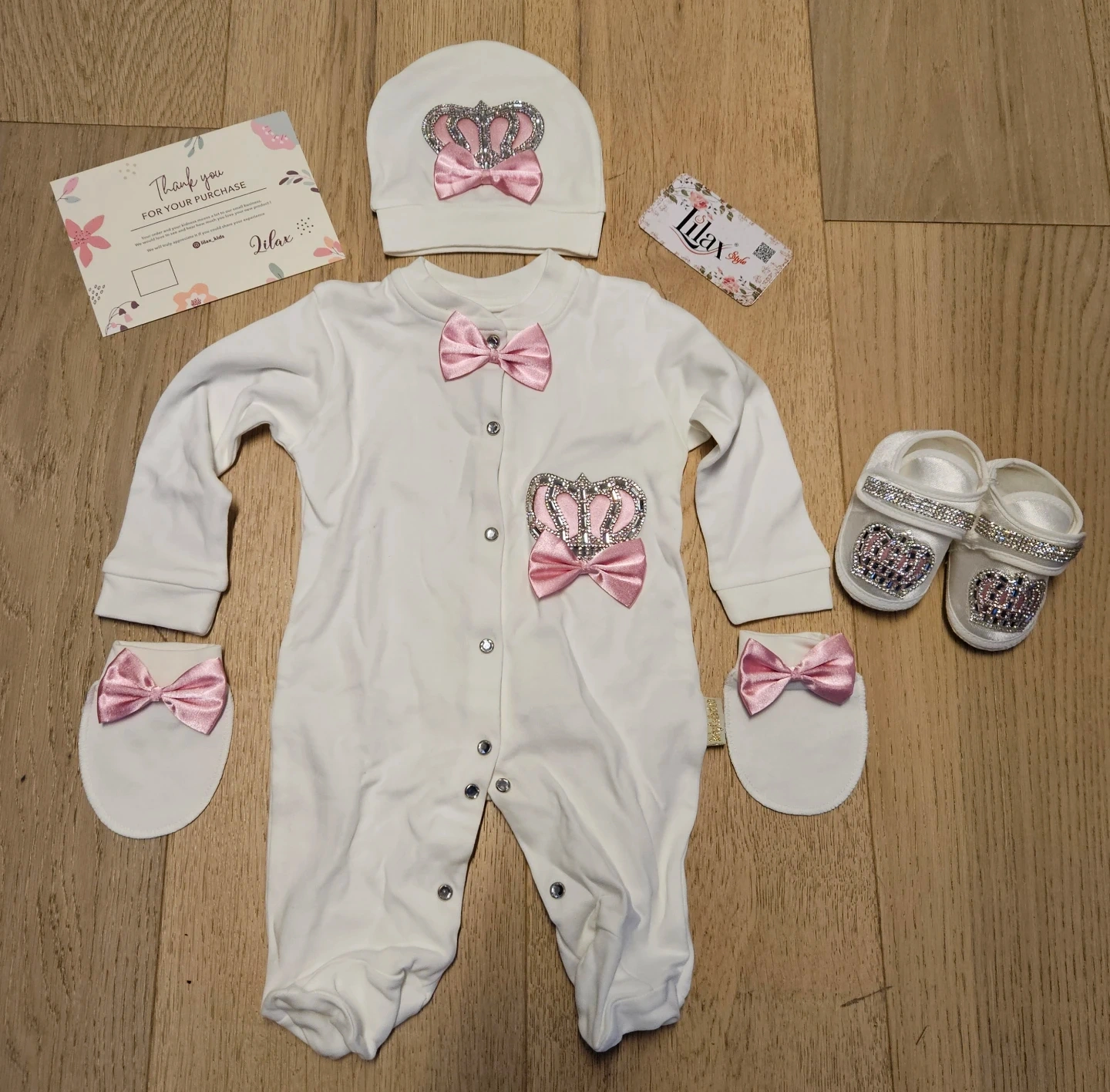 This adorable Lilax baby outfit set is brand new and comes in its original box! It includes a onesie, hat, mittens, and booties, all in a lovely white colour with cute pink bow details and jeweled crown design. Crafted from 100% soft cotton, it's perfect for special occasions. It was never used as my baby outgrew it too fast. Perfect for a newborn gift or Christmas!