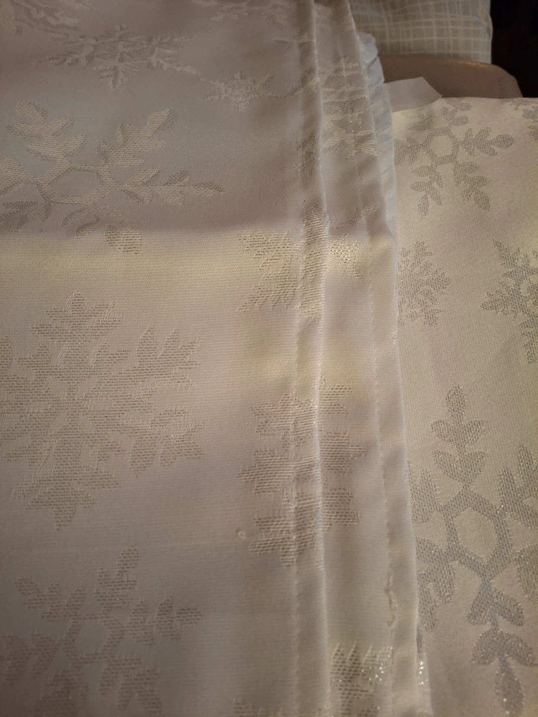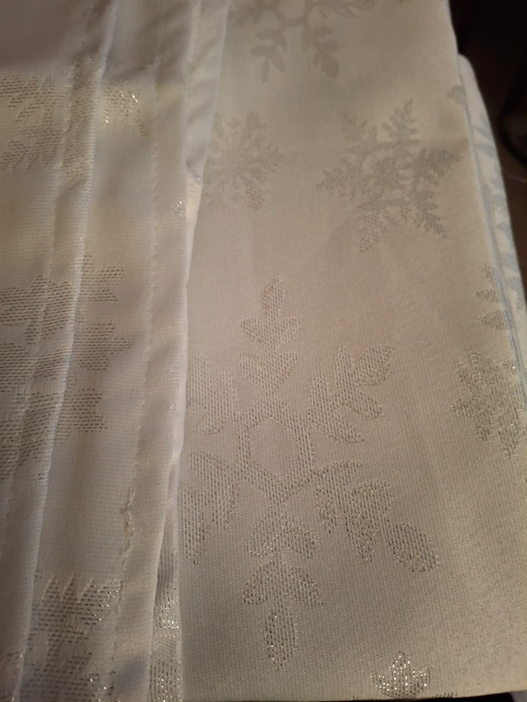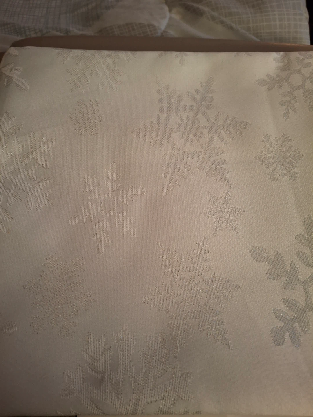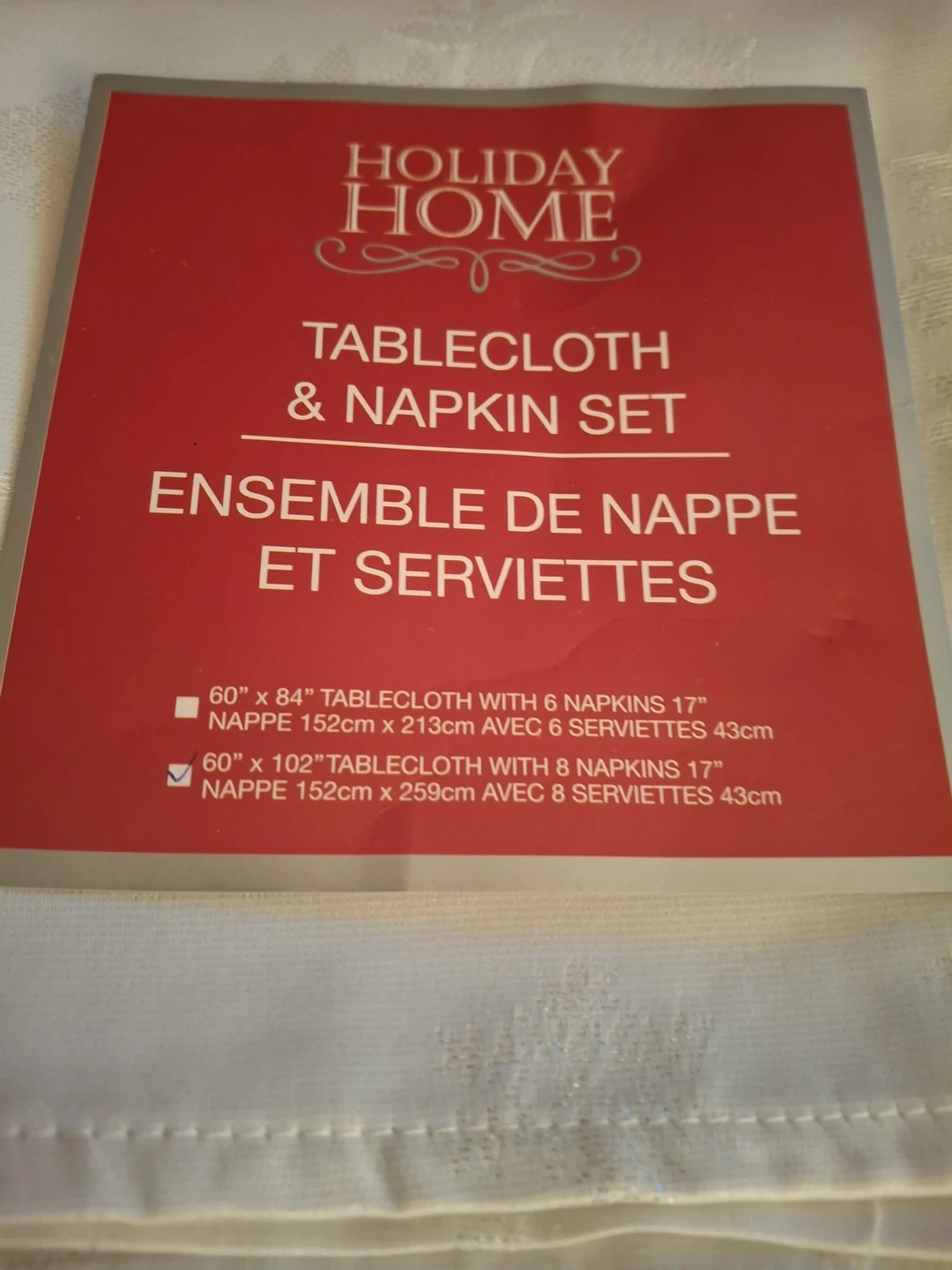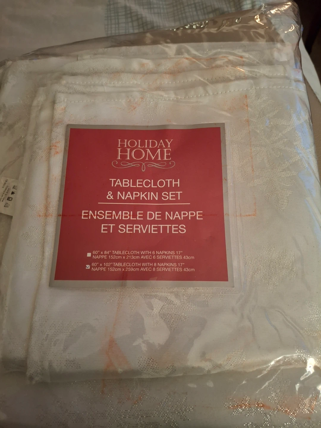 Holiday Home white polyester tablecloth and napkin set, still in original packaging. Features snowflake design with a thread shine- pattern “white snowflake with lurex.” Set includes a 60" x 102" (152cm × 259cm) tablecloth and eight 17" (43cm) napkins. Never been used. Some red markings on the packaging but nothing on the items themselves. Machine washable.