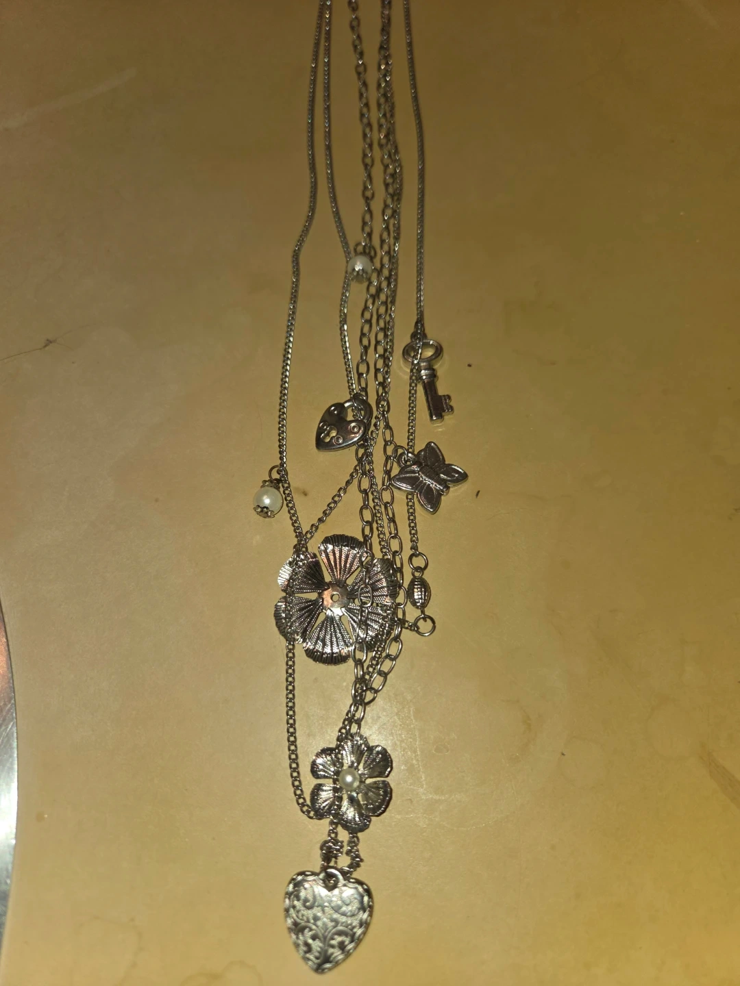 Selling a silver coloured necklace with multiple strands and charms. It features floral, heart, butterfly and key charms. Would look great with any outfit!