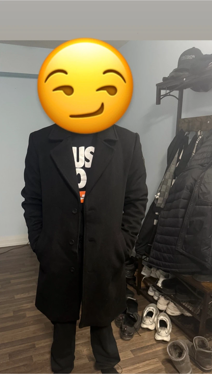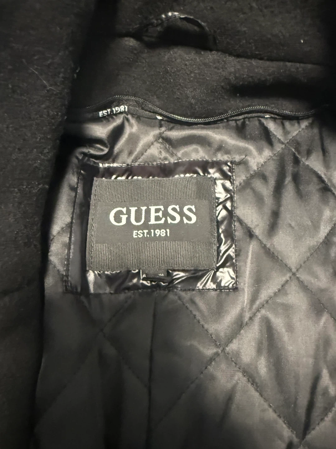 Selling a Guess black wool blend coat. It's in great condition and ready for a new owner! Perfect for staying warm and stylish this winter. The coat features a classic design with a button closure and a sleek, modern look.