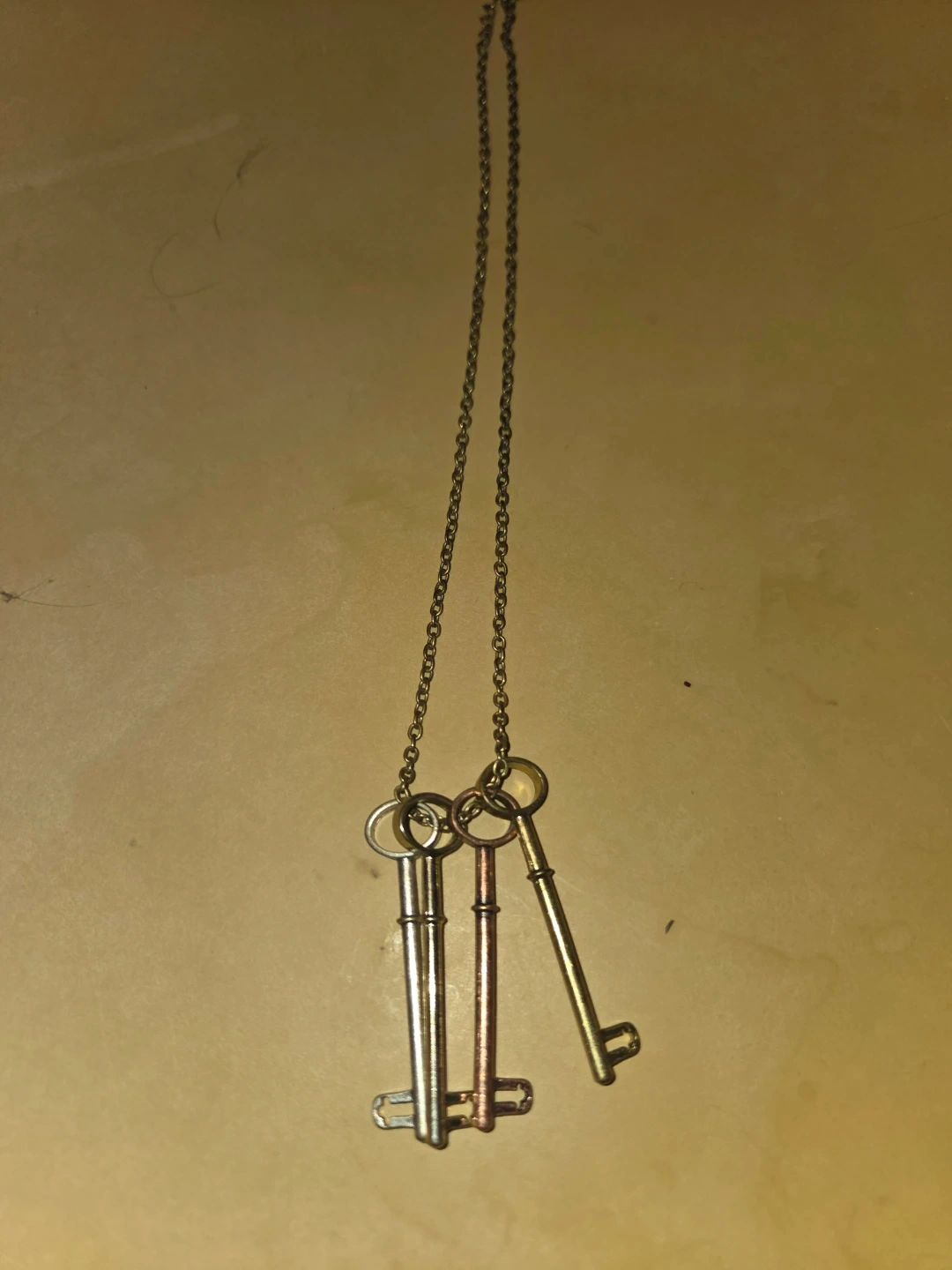 A decorative key chain necklace featuring four keys with different metallic finishes. It's a unique piece that could add a touch of vintage charm to your accessories or home decor