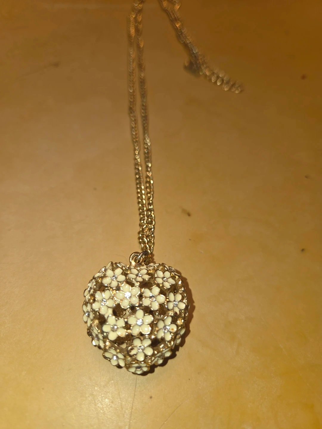 Here's a cute floral heart pendant necklace! It features a gold-tone chain and a heart-shaped pendant covered in tiny white flowers. It's in great condition and would make a lovely addition to any outfit