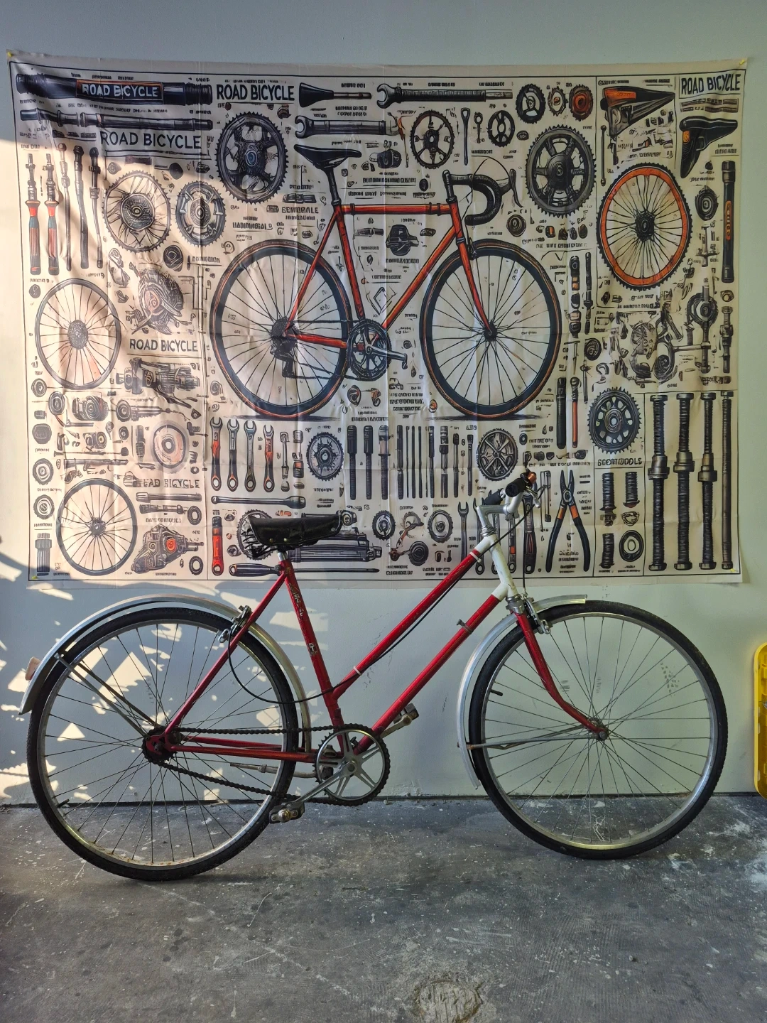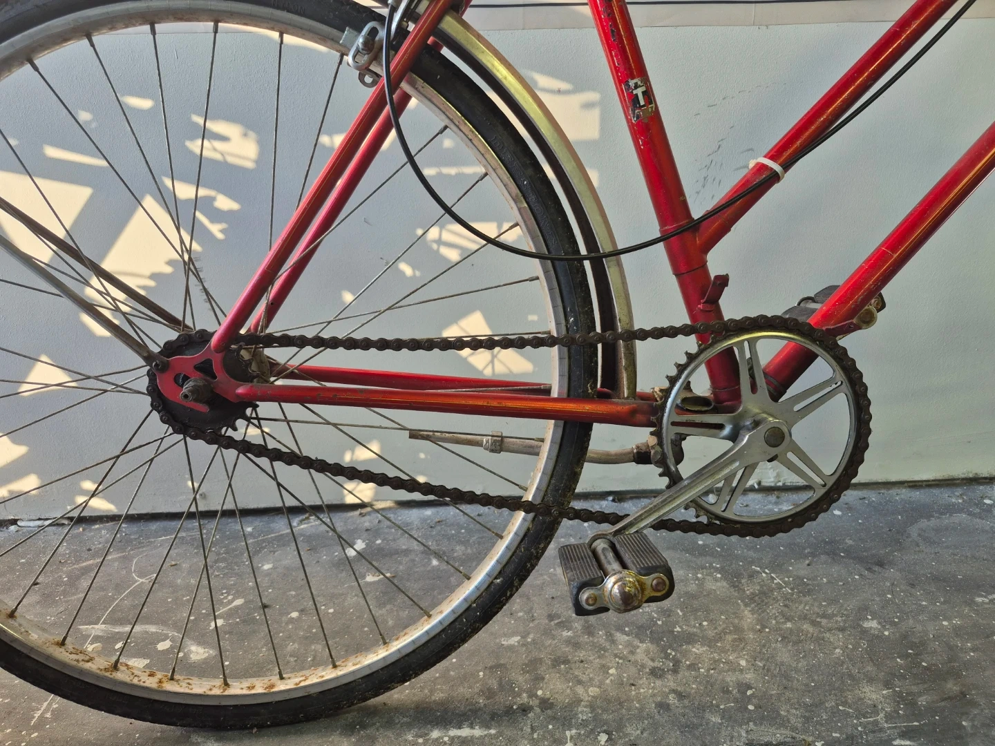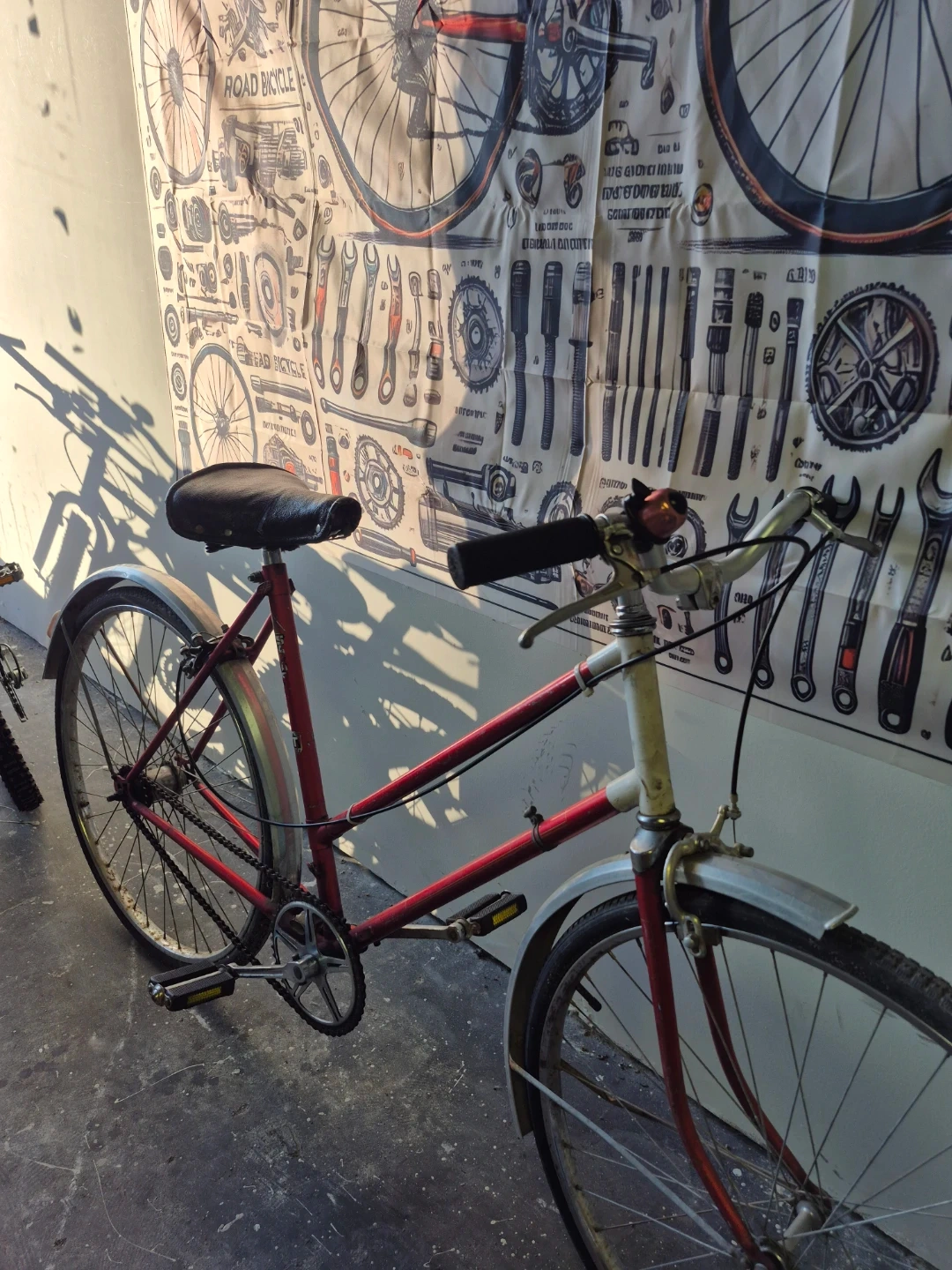 Selling a vintage red road bicycle. It's in good condition and ready for a new owner to enjoy some leisurely rides around town. The bicycle has a classic look and feel, perfect for anyone who appreciates vintage bikes