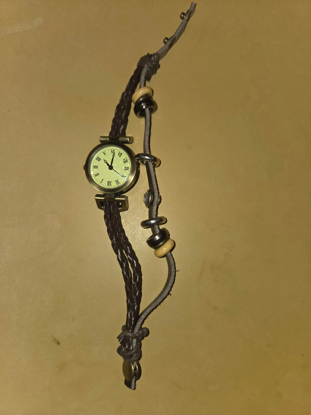 Selling a women's watch with a unique braided brown strap and decorative beads. The watch face has Roman numerals, giving it a classic look. It's in good condition and ready to wear. Watch battery is dead