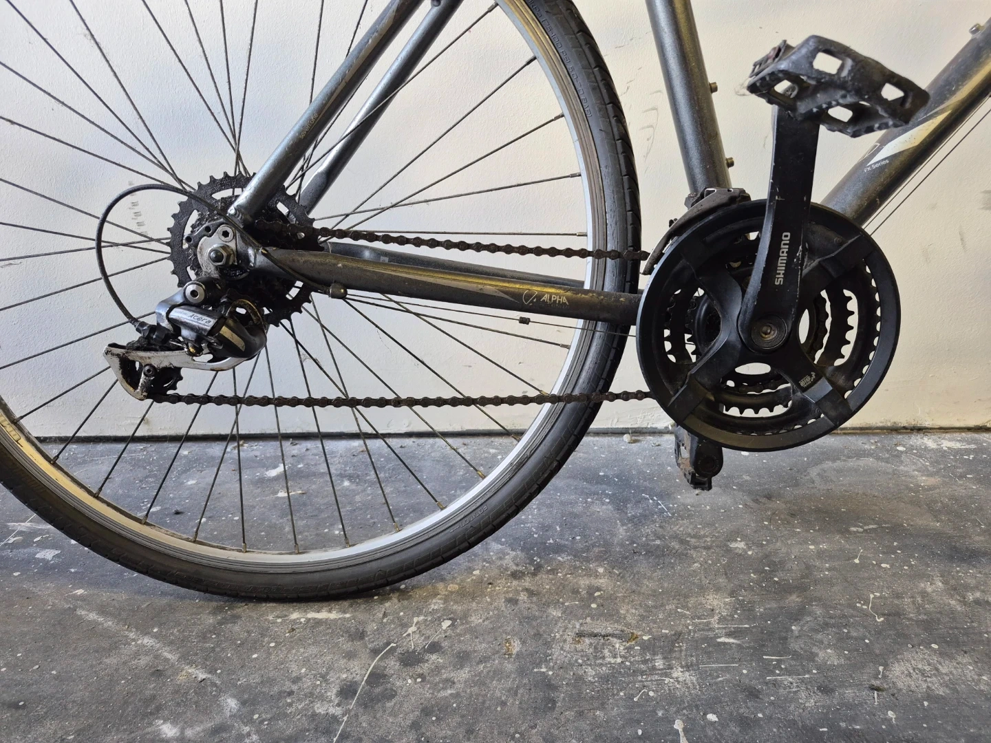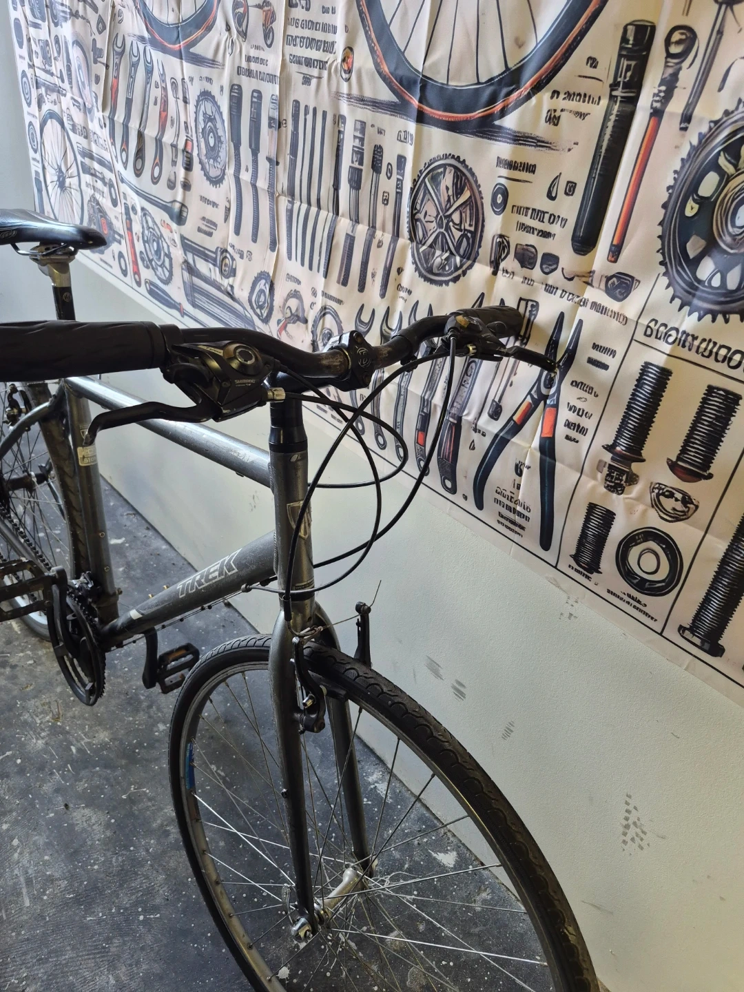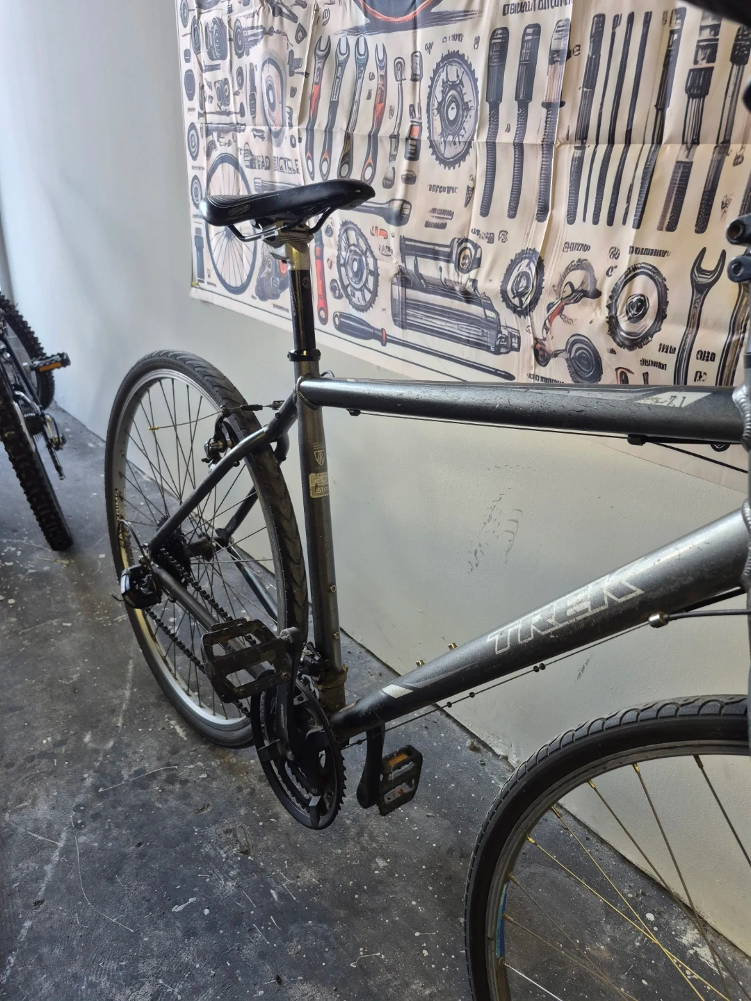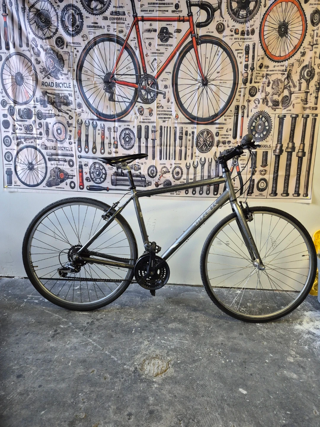 Selling a Trek Alpha road bike. It appears to be in good condition and ready for some new adventures. The frame is grey, and it has Shimano components.