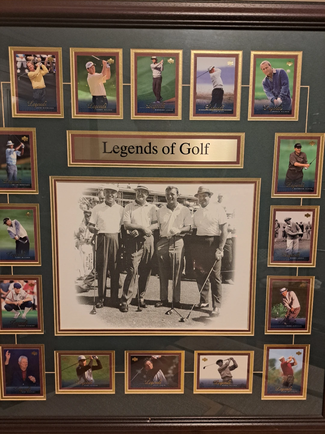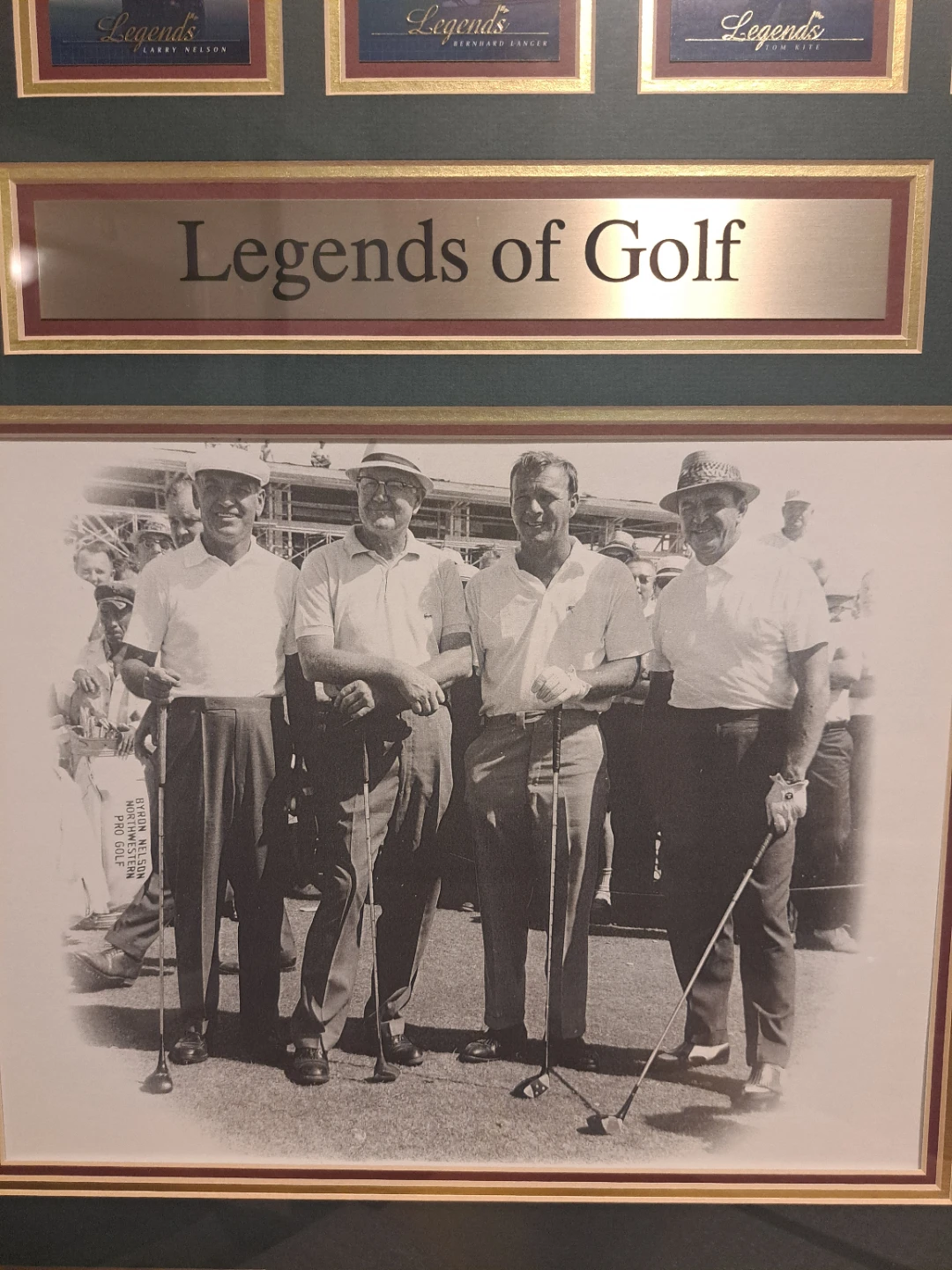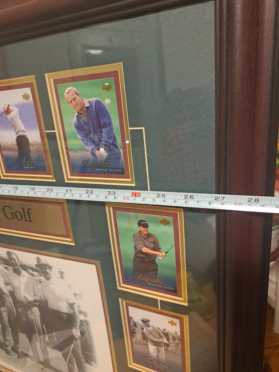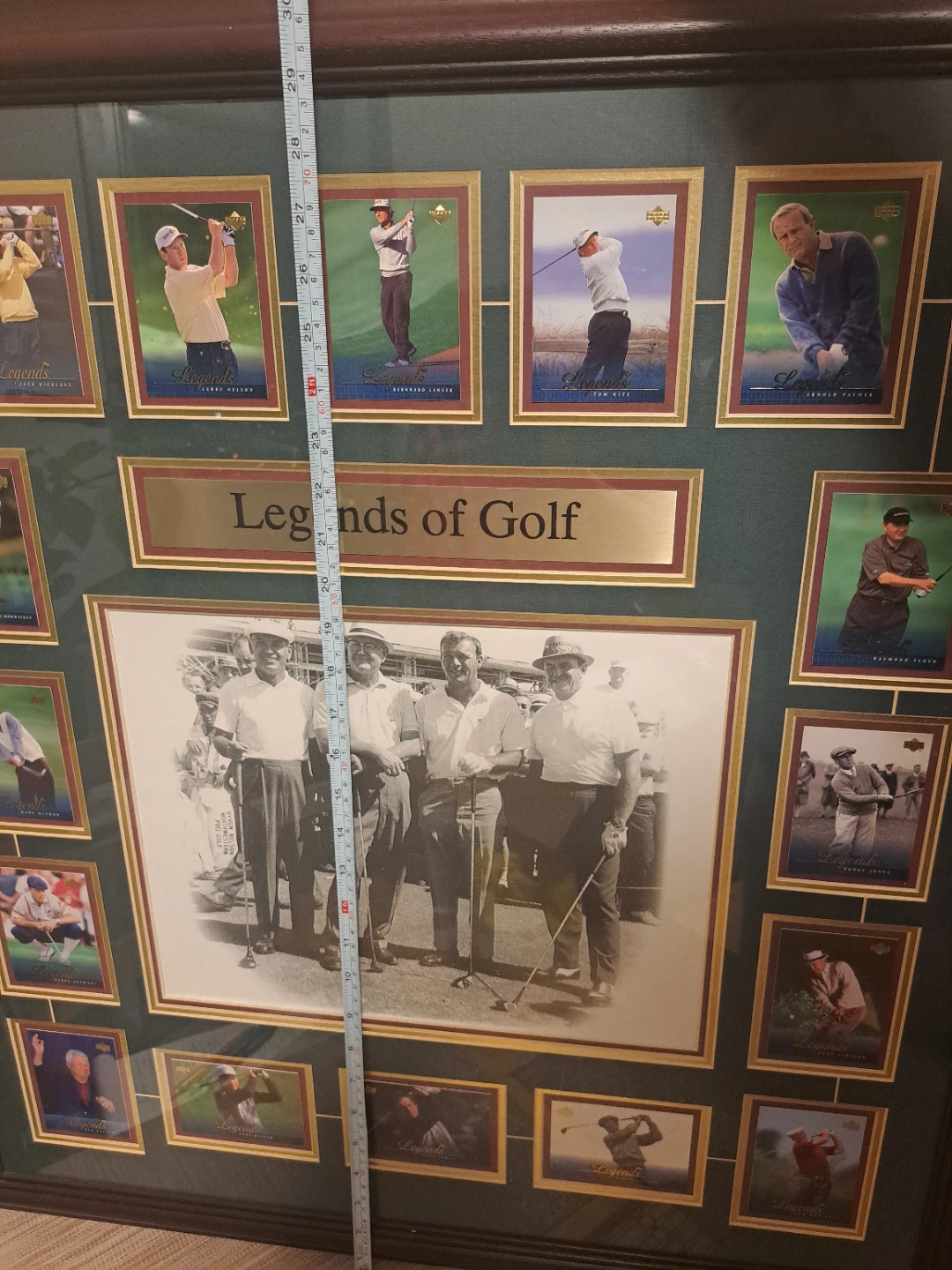 Selling a framed picture titled "Legends of Golf". It features pictures of famous golfers. The frame measures approximately 28 inches wide and 32 inches tall