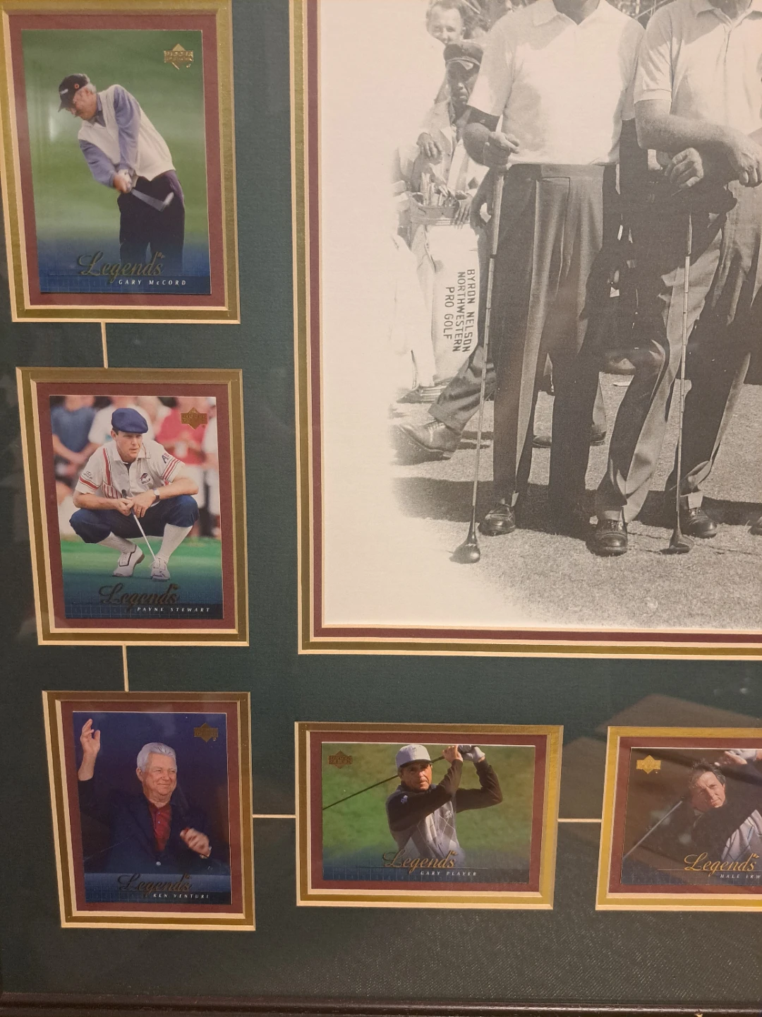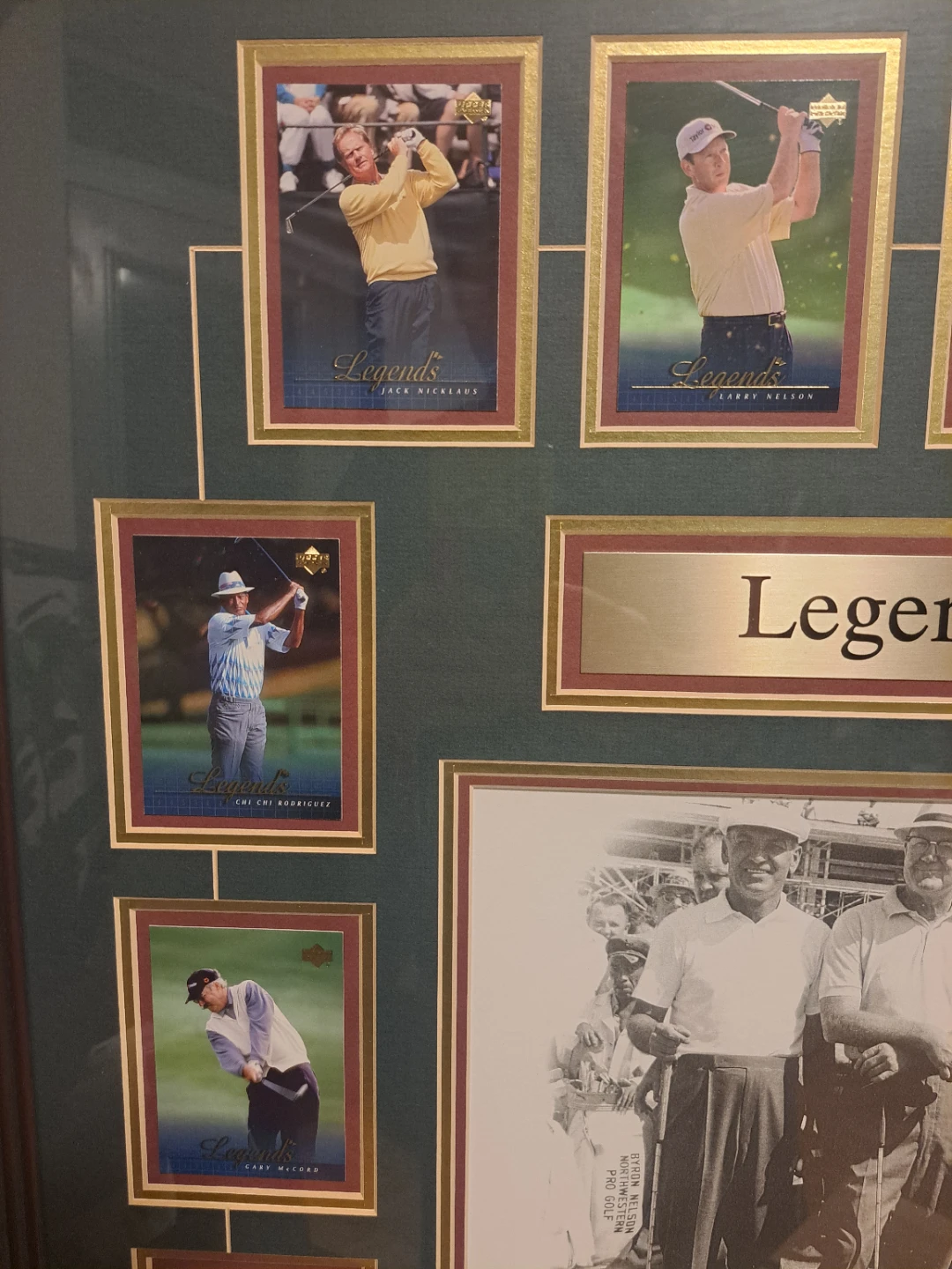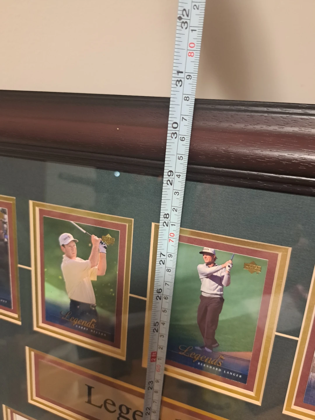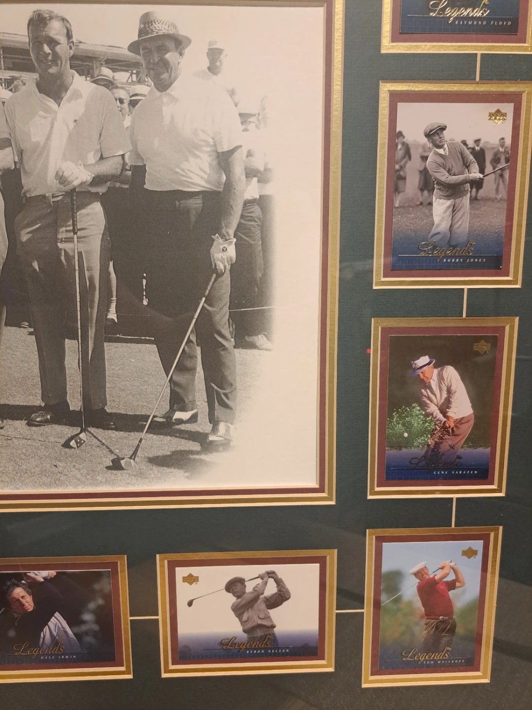 Selling a framed picture titled "Legends of Golf". It features pictures of famous golfers. The frame measures approximately 28 inches wide and 32 inches tall