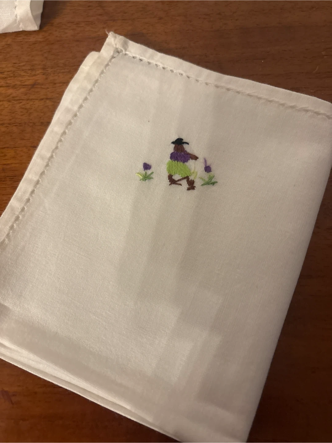 I'm selling a set of seven white napkins. They each have a unique hand embroidered design. They are in good condition and would be a great addition to your table setting