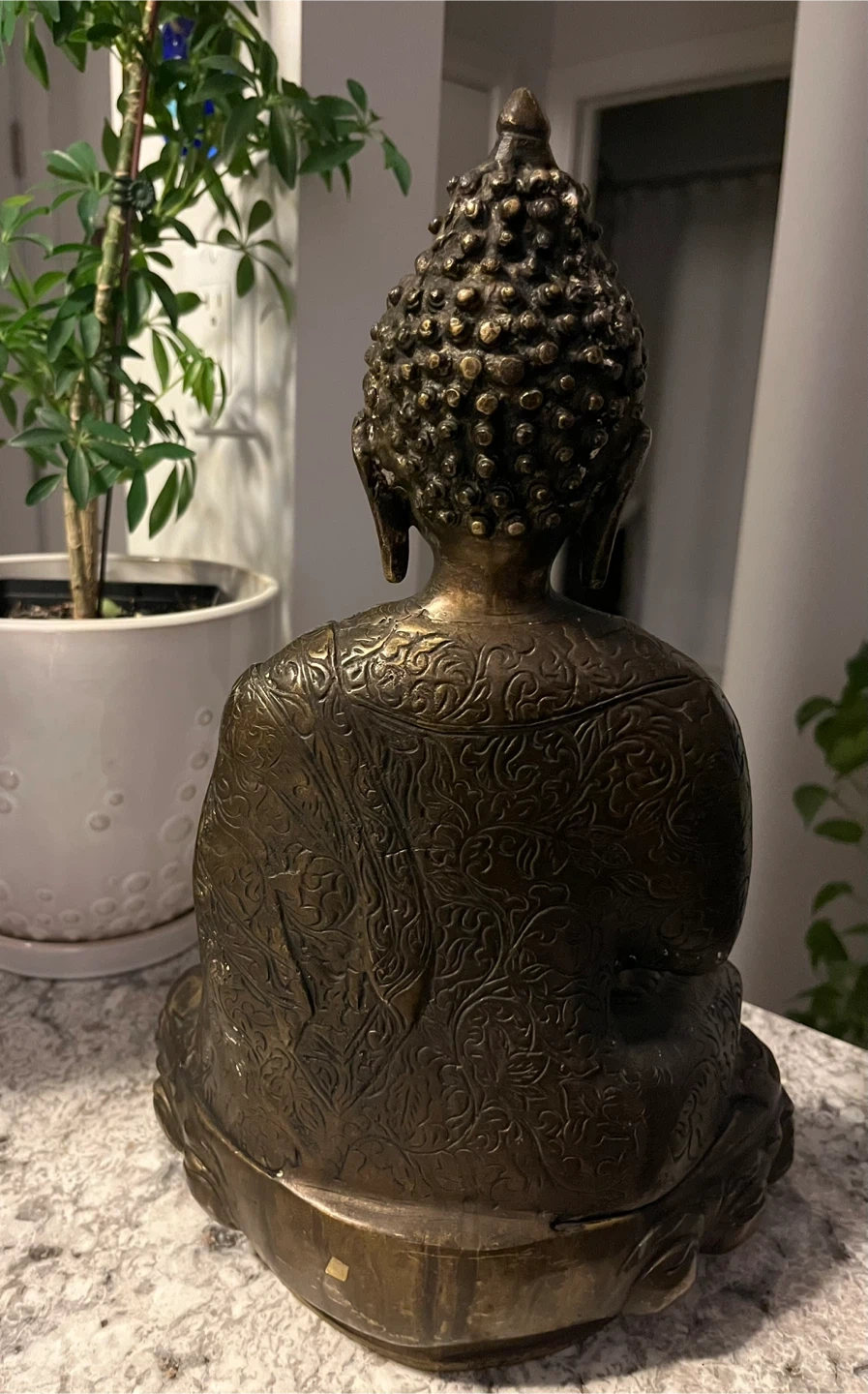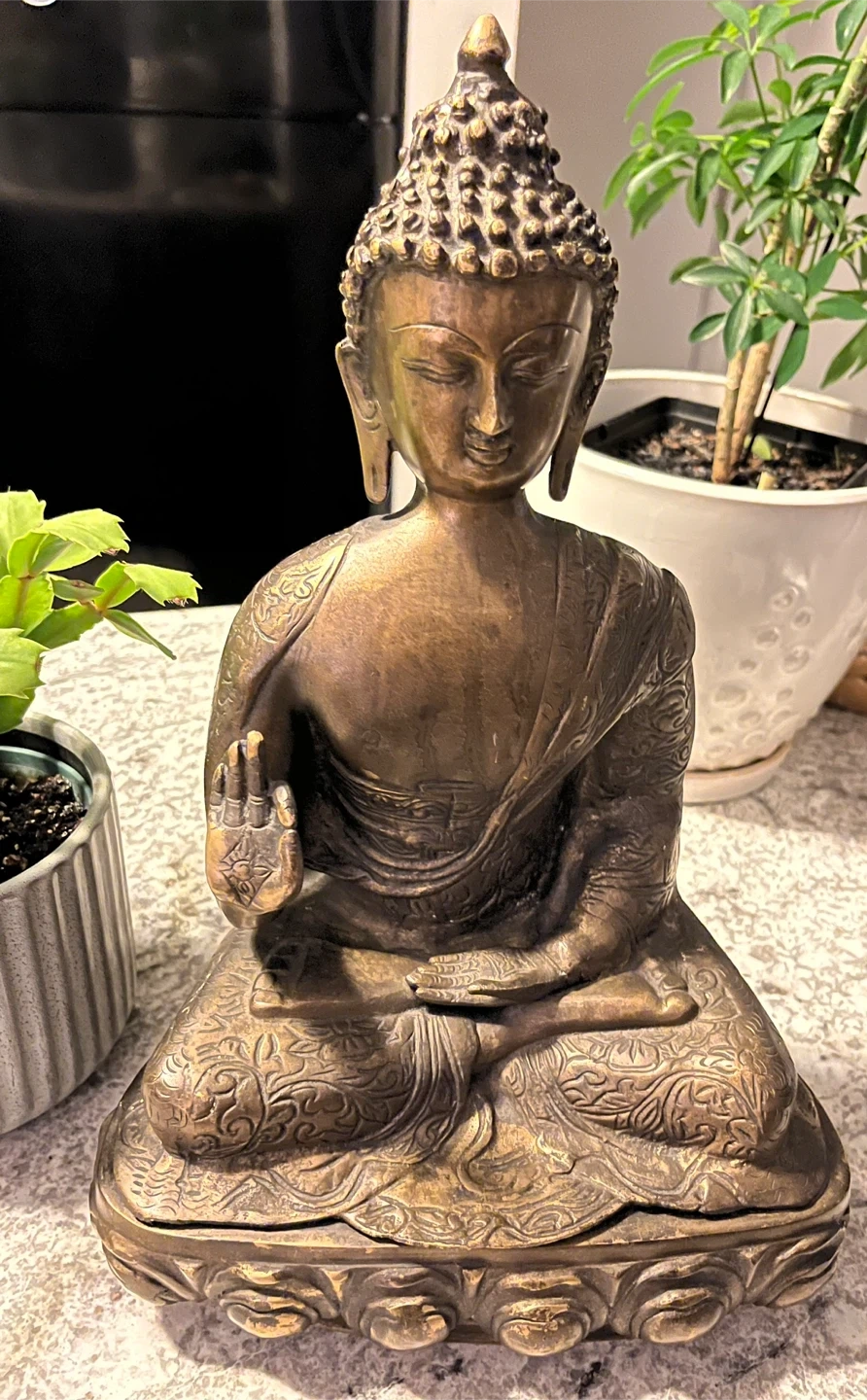 A lovely bronze Buddha statue that would look great in any home or meditation space. It has a beautiful, intricate design and a nice weight to it. It's in excellent condition!
