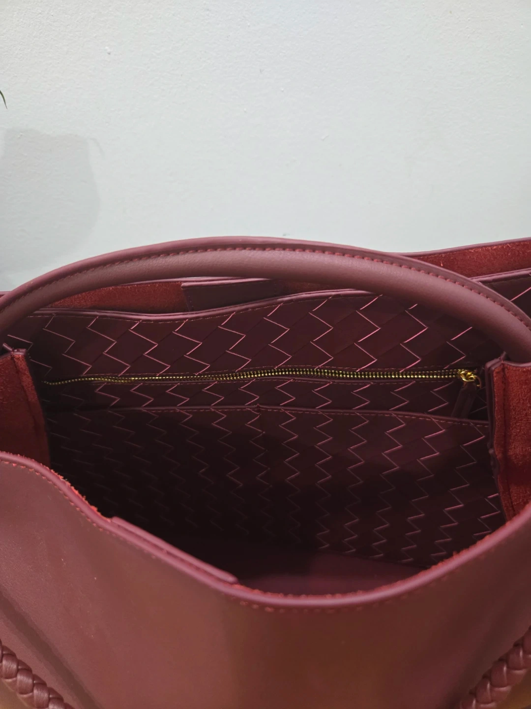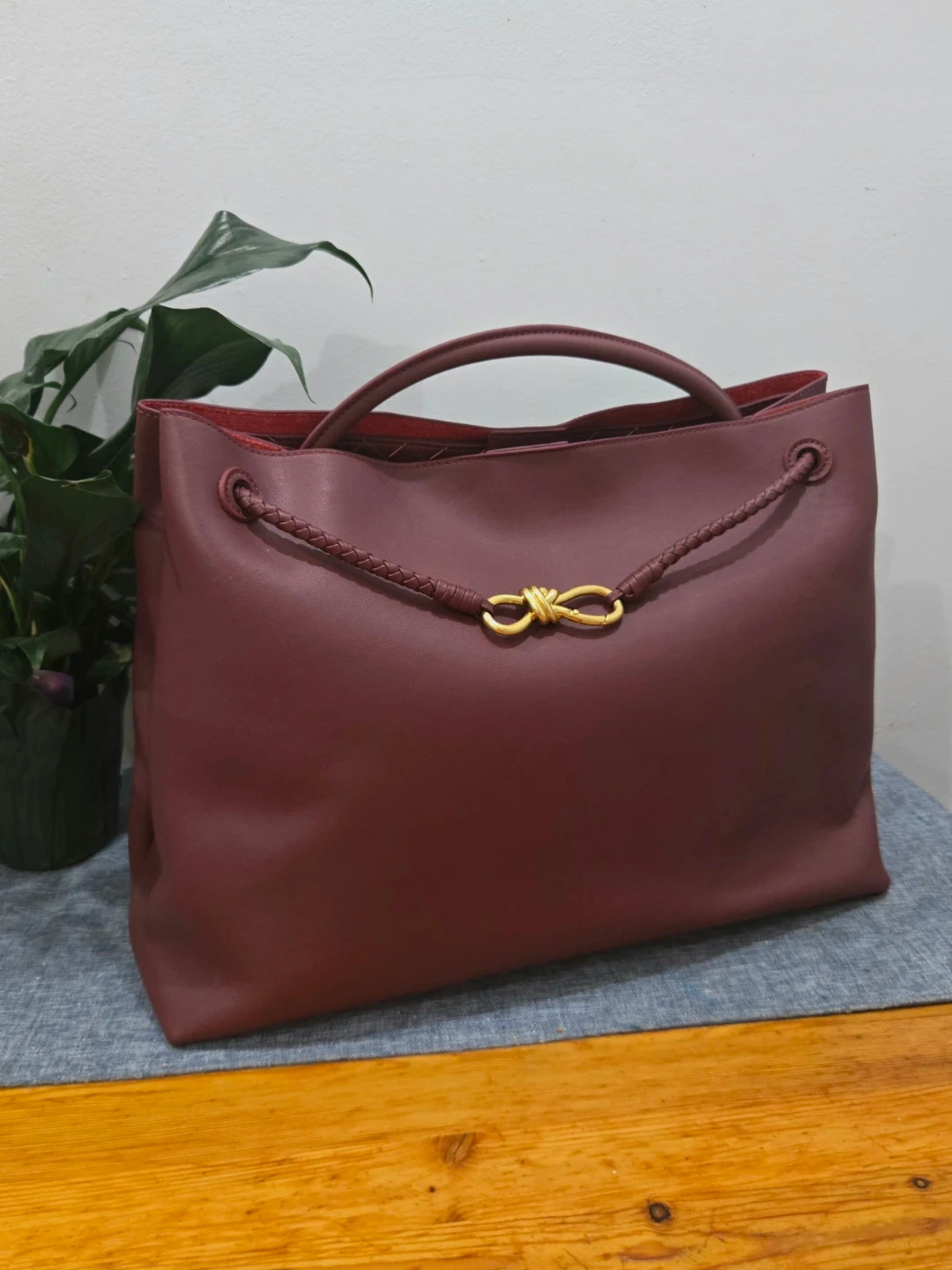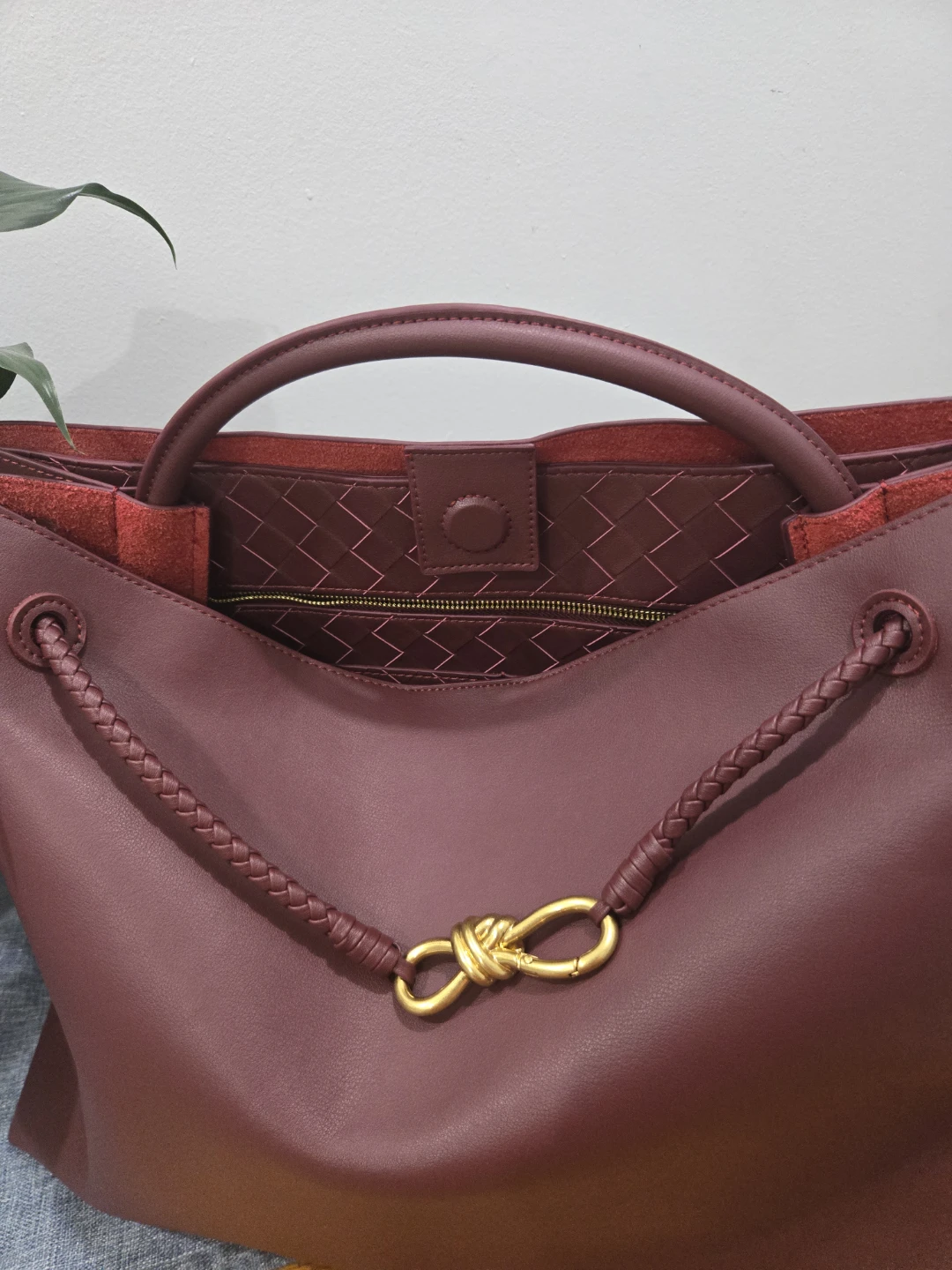 This is a Bottega Veneta tote bag in a beautiful burgundy colour. It features a knot detail on the handle and a spacious interior, perfect for everyday use. The interior has a unique woven pattern.