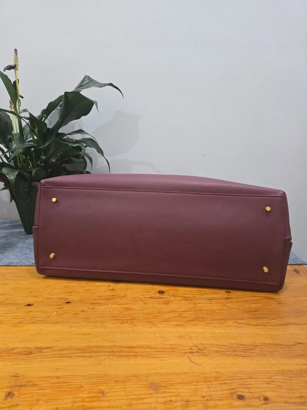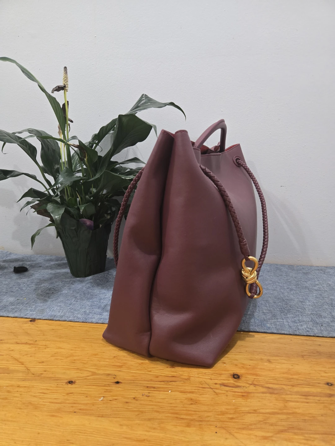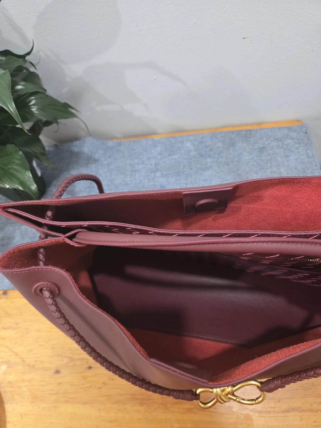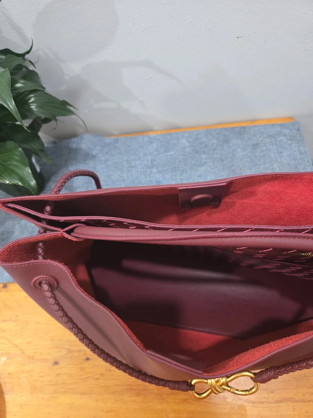 This is a Bottega Veneta tote bag in a beautiful burgundy colour. It features a knot detail on the handle and a spacious interior, perfect for everyday use. The interior has a unique woven pattern.