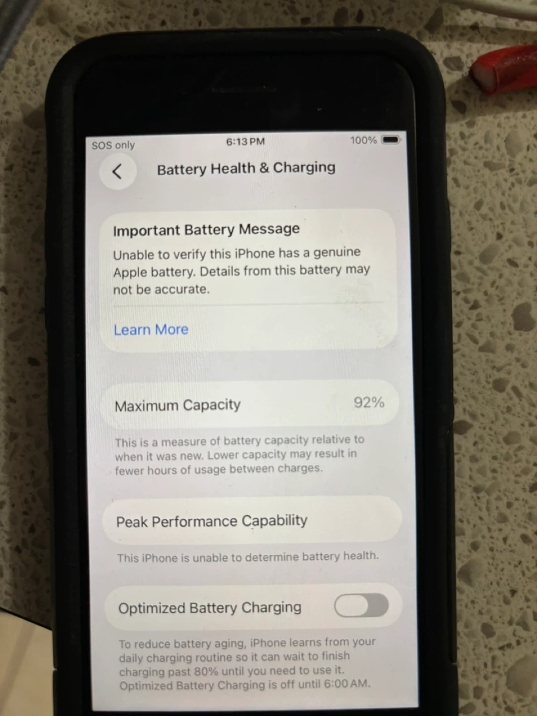 Selling an iPhone, battery health is at 92%. The phone displays a message indicating it is unable to verify if the iPhone has a genuine Apple battery and it is an error still on apple battery